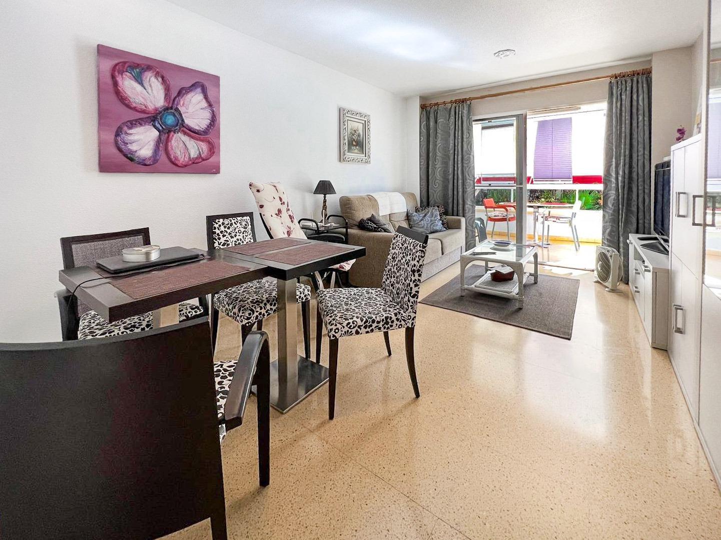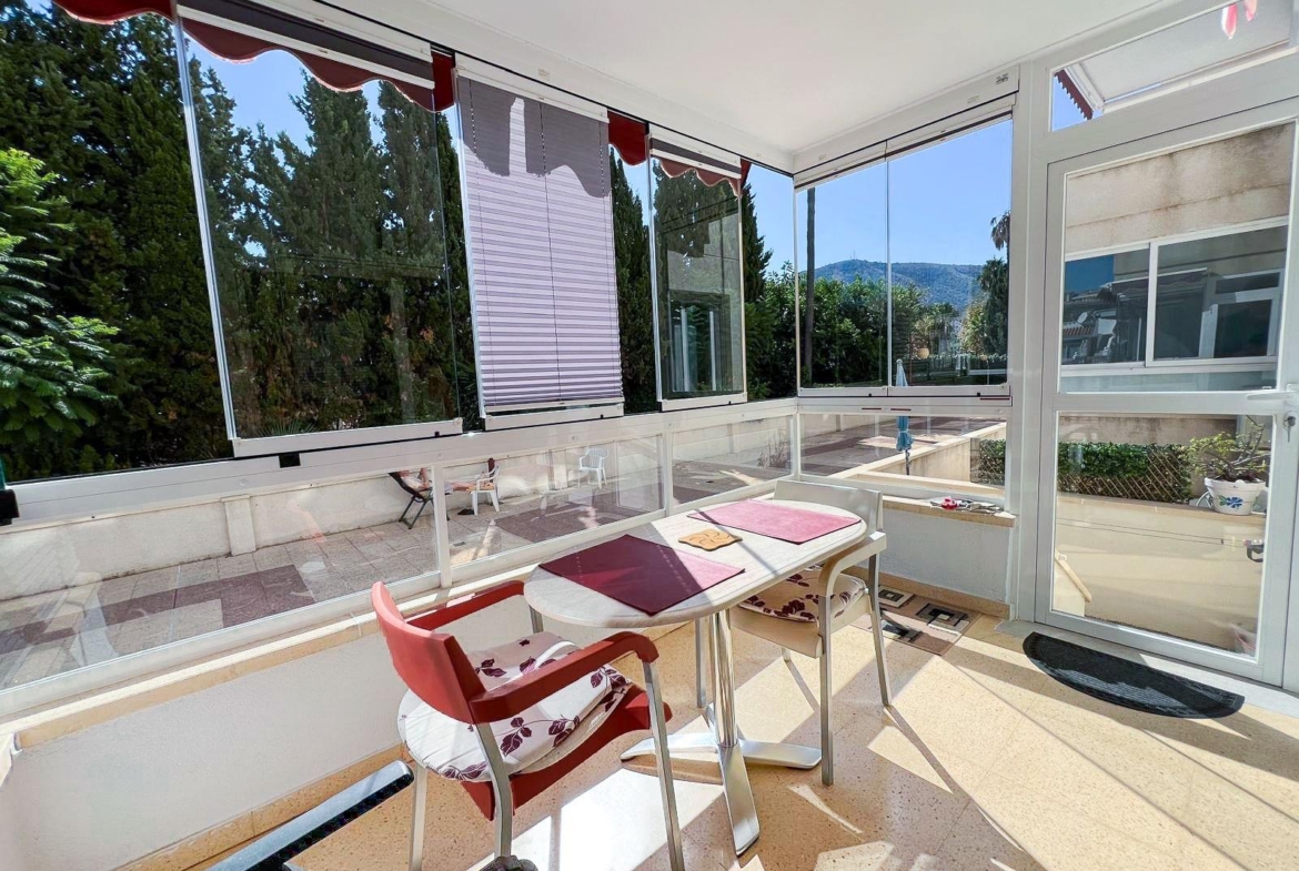 Charmant appartement op de begane grond, op slechts 350 meter van het strand van Albir, ideaal voor wie op zoek is naar comfort, nabijheid van de zee en een rustige omgeving.~De woning beschikt over een ruime, lichte woonkamer die uitkomt op een grote glazen terras, perfect om het hele jaar door van te genieten, en een zonnig open terras met gedeeltelijk uitzicht op de bergen.~Er is 1 slaapkamer met inbouwkasten en 1 volledig gerenoveerde badkamer. De aparte keuken met bijkeuken biedt een functionele en praktische ruimte voor dagelijks gebruik. Voorzien van centrale verwarming.~De woning is inclusief een parkeerplaats in de prijs.~Onderdeel van een residentie met gemeenschappelijk zwembad, ideaal om te ontspannen en te genieten van het heerlijke mediterrane klimaat.~Uitstekende ligging, dicht bij restaurants, winkels en alle voorzieningen van het centrum van Albir.~Een uitstekende kans als permanente woning, tweede verblijf of investering.