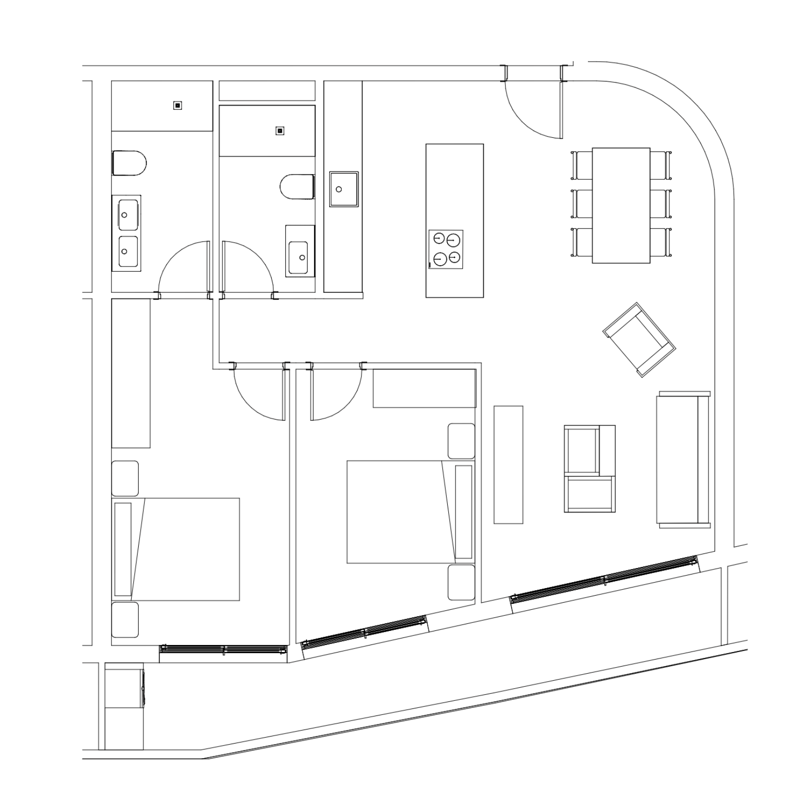 Keuken & BadkamersKeuken met gelamineerd houteffect en BOSCHapparatuur. Badkamers met wit designsanitair en grote keramische tegels.