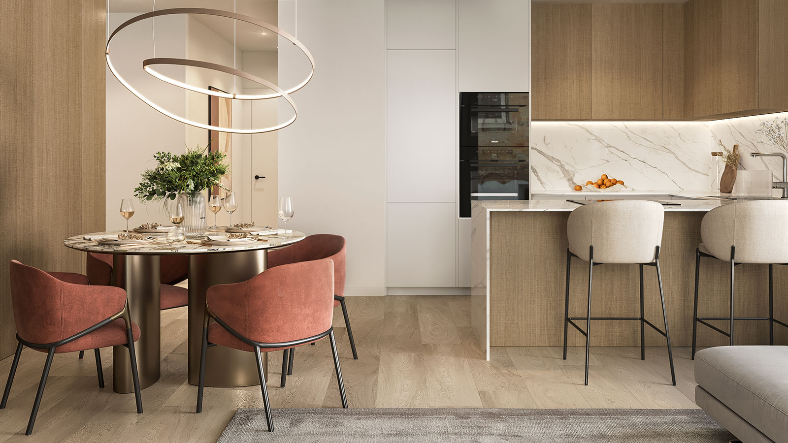 Het gebouw zelf is ontworpen met een gedurfde, eigentijdse esthetiek. Een centrale structuur bekleed met wit en goud keramiek met marmeren texturen rijst op als een sculpturale stam, van waaruit lichtgevende, met goud geëmailleerde terrassen zich als bladeren uitstrekken.