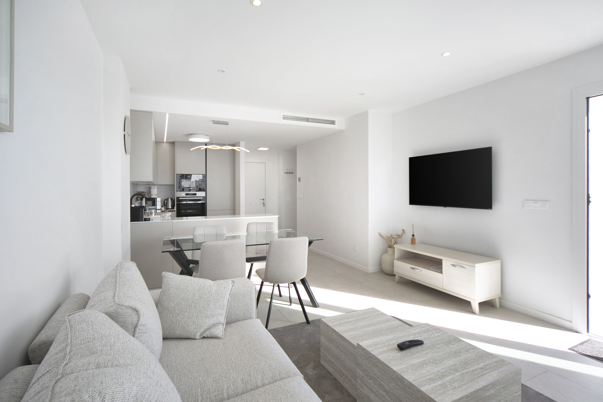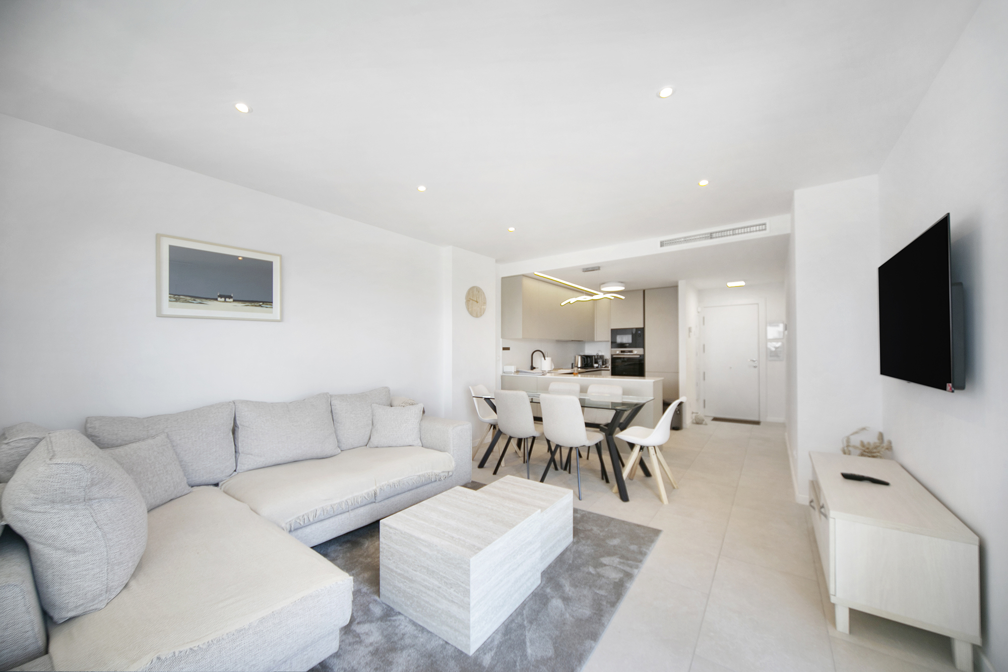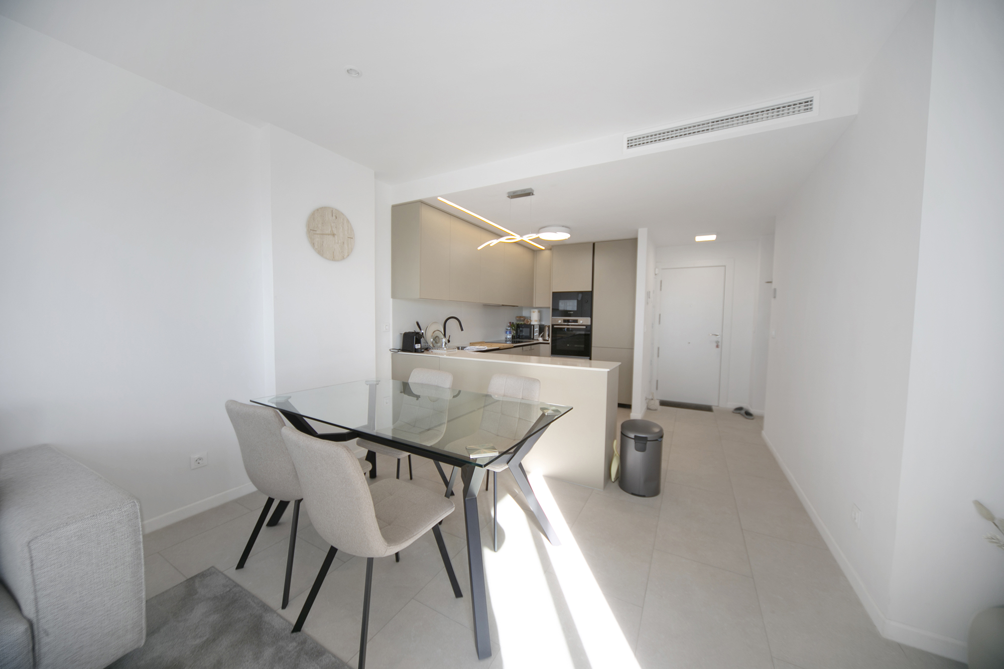 Met een totale oppervlakte van 119 m² (86 m² bruikbare binnenruimte en een terras van 33 m²), beschikt het appartement over een lichte open woon en eetruimte die uitkomt op een ruime privéterras – perfect om van de mediterrane zon te genieten van 's ochtends tot 's avonds. De volledig uitgeruste keuken bevat topoftheline Bosch apparaten, die functionaliteit en verfijnd ontwerp combineren.