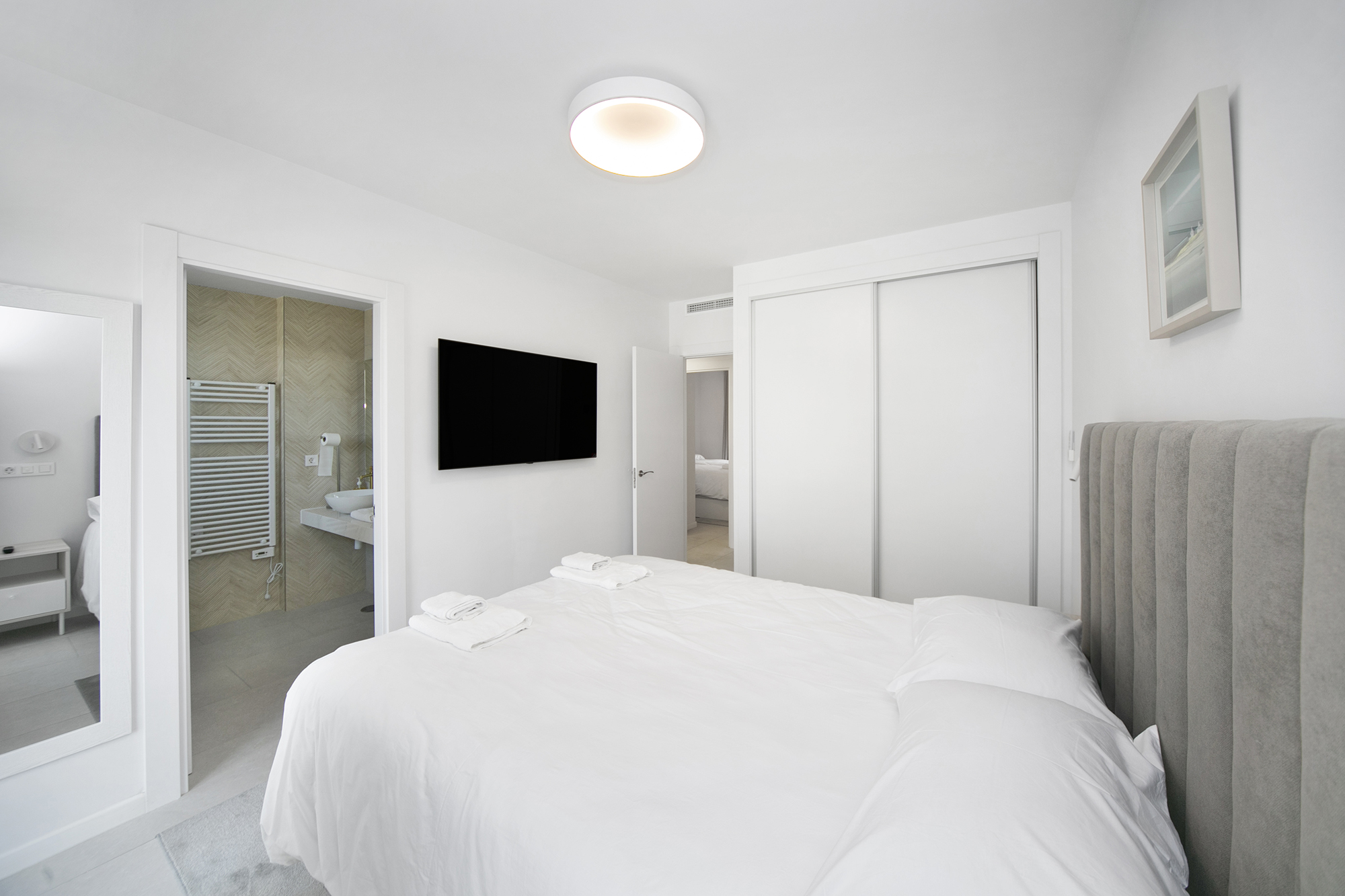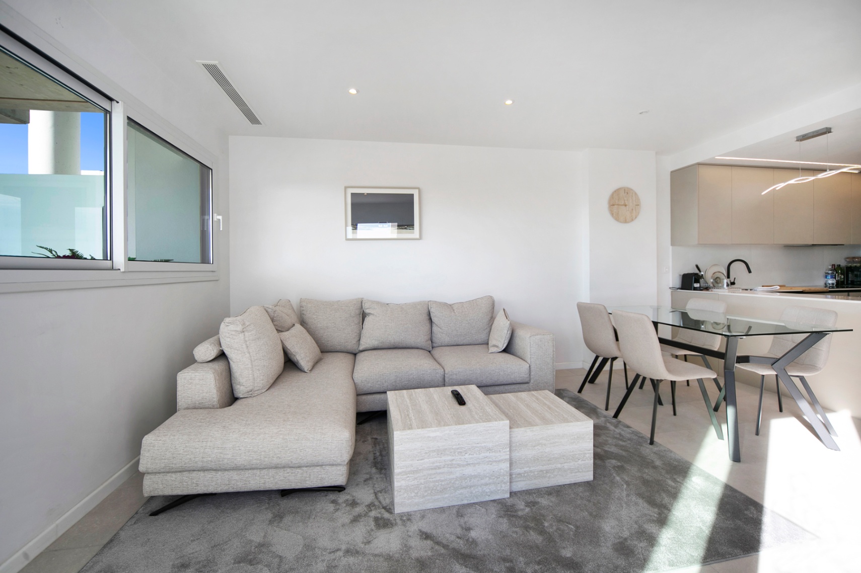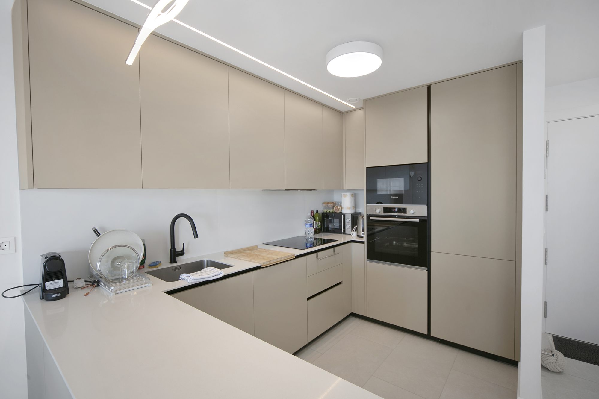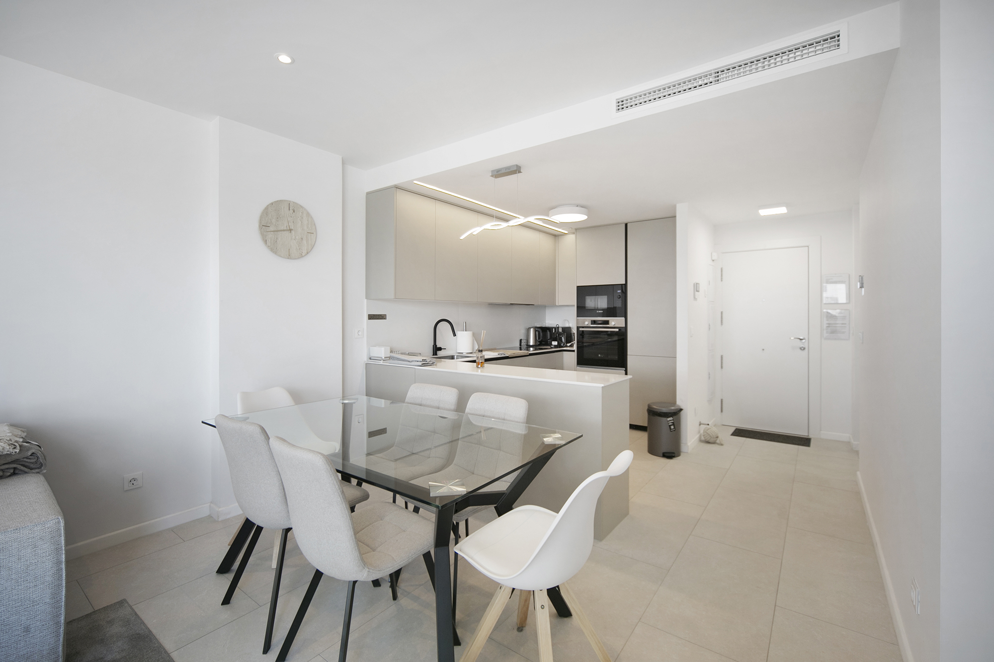 Met een totale oppervlakte van 119 m² (86 m² bruikbare binnenruimte en een terras van 33 m²), beschikt het appartement over een lichte open woon en eetruimte die uitkomt op een ruime privéterras – perfect om van de mediterrane zon te genieten van 's ochtends tot 's avonds. De volledig uitgeruste keuken bevat topoftheline Bosch apparaten, die functionaliteit en verfijnd ontwerp combineren.