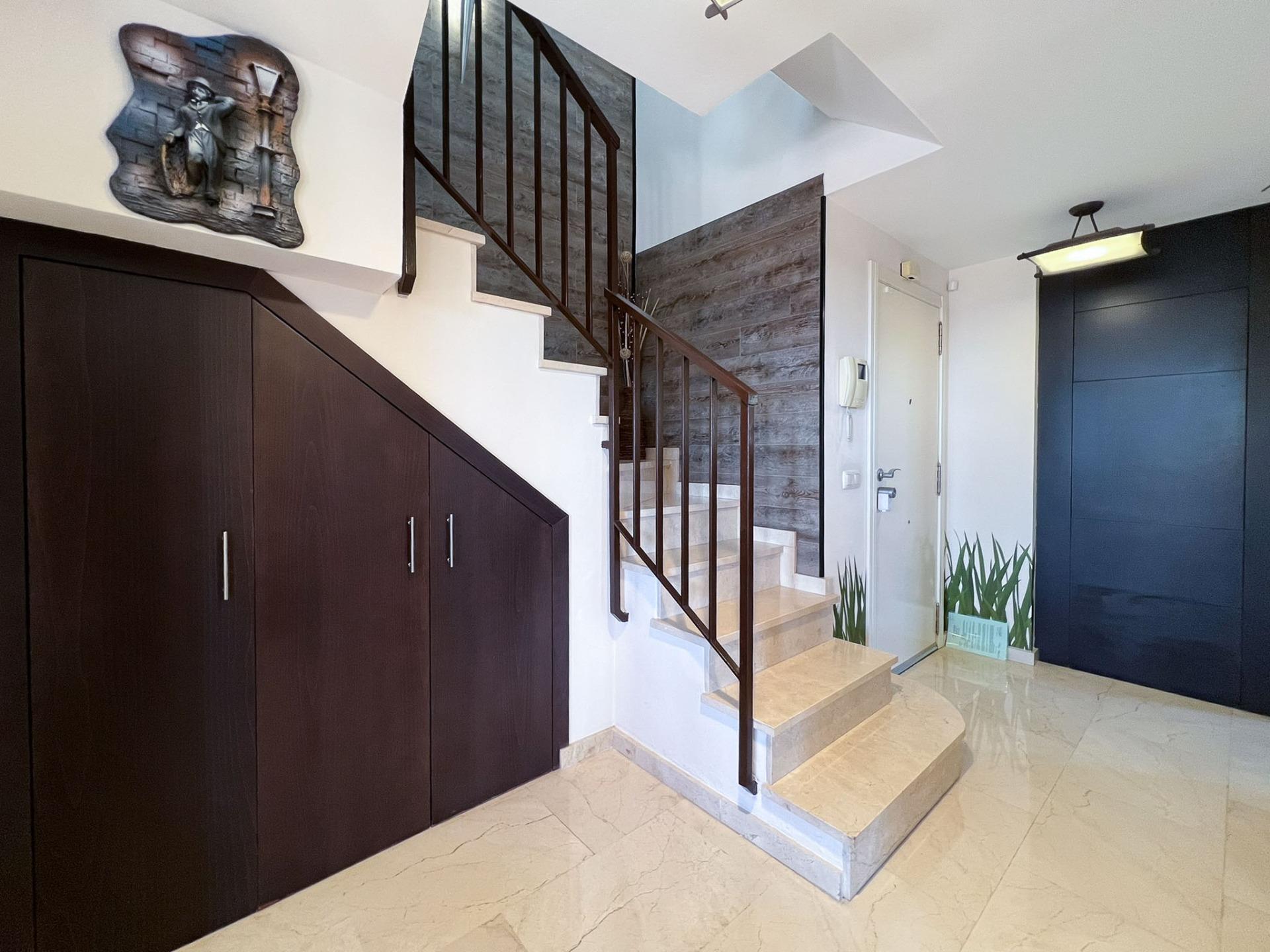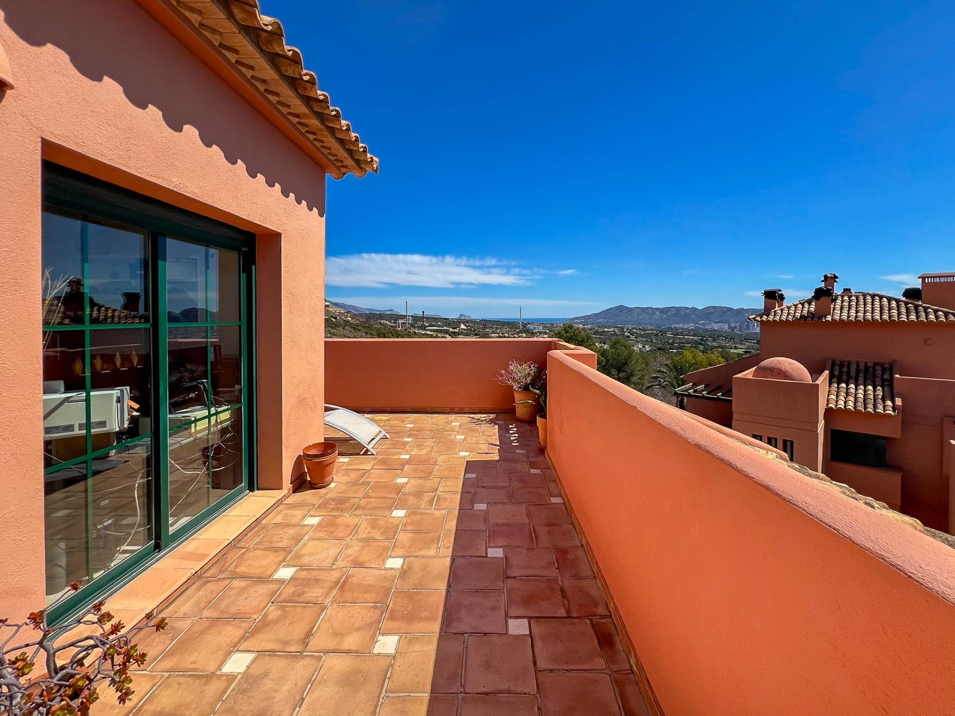 Fantastic luxury duplex penthouse with 115m2 of living space and 65m2 of terraces. Gated community with a beautiful garden and two communal pools. Located at the highest point of the entire Sierra Cortina Finestrat mountain range, this apartment boasts unbeatable panoramic sea views from Calpe to Alicante. The first floor consists of a hall with a guest toilet, a separate kitchen with a private terrace of approximately 15m2 with mountain views and a laundry room, a master bedroom with a dressing room and a large en-suite bathroom with a hydromassage shower, a spacious living room with a semi-covered terrace of approximately 25m2 and views of the complex with its pool and the sea. An internal staircase leads to the second floor, which has two spacious bedrooms, a large bathroom with a hydromassage bathtub, and a large open terrace of approximately 25m2 with a barbecue and spectacular sea views. The apartment has ducted air conditioning, bedrooms with built-in wardrobes, marble floors, bathrooms with built-in wooden furniture, white lacquered interior doors, and a security entrance door. Parking space and private storage room included in the price. Some furniture is negotiable. This well-maintained complex features security cameras, is located across from the Asia Gardens Hotel, several theme parks, two golf courses, and luxury hotels. It's also very well connected to the motorway, just 45 minutes from Alicante Airport. A unique opportunity!