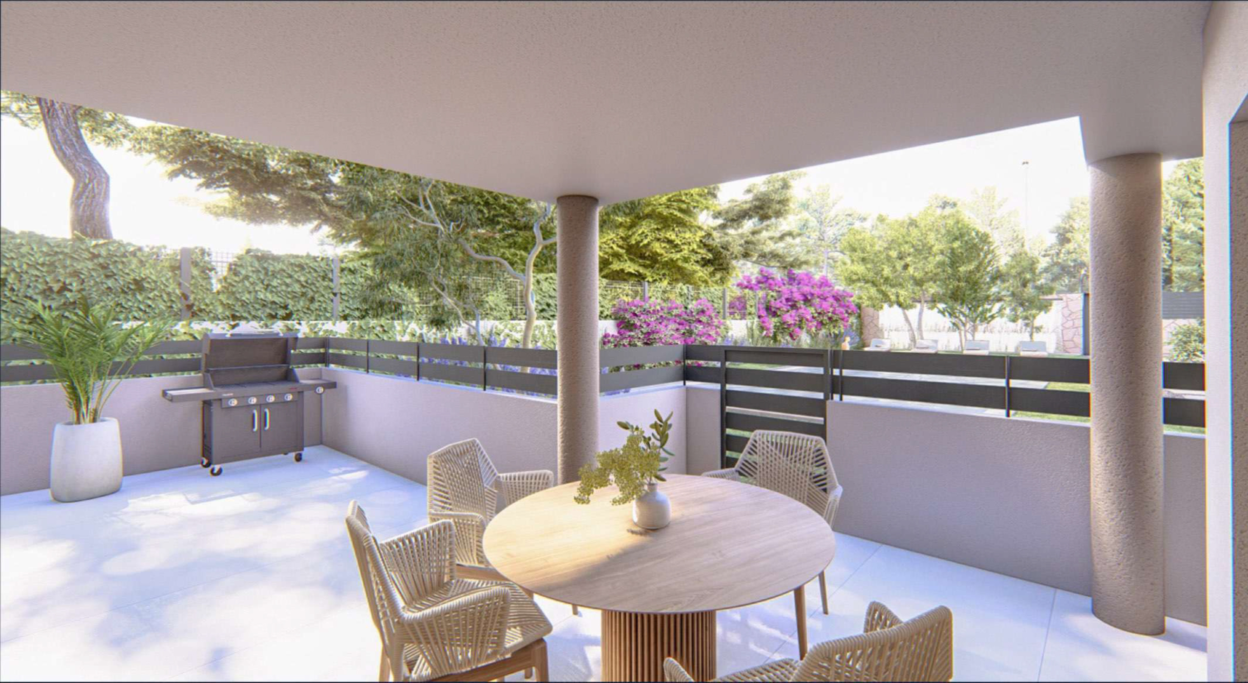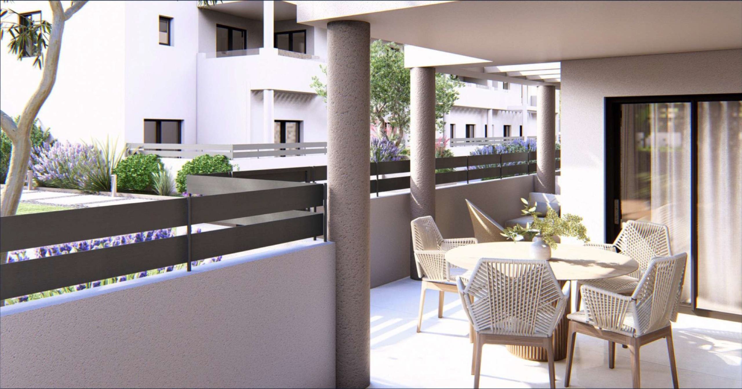 Elke woning beschikt over een eigen parkeerplaats en toegewezen berging. Buiten nodigen aangelegde groenzones en een zwembad uit tot ontspanning en genieten.