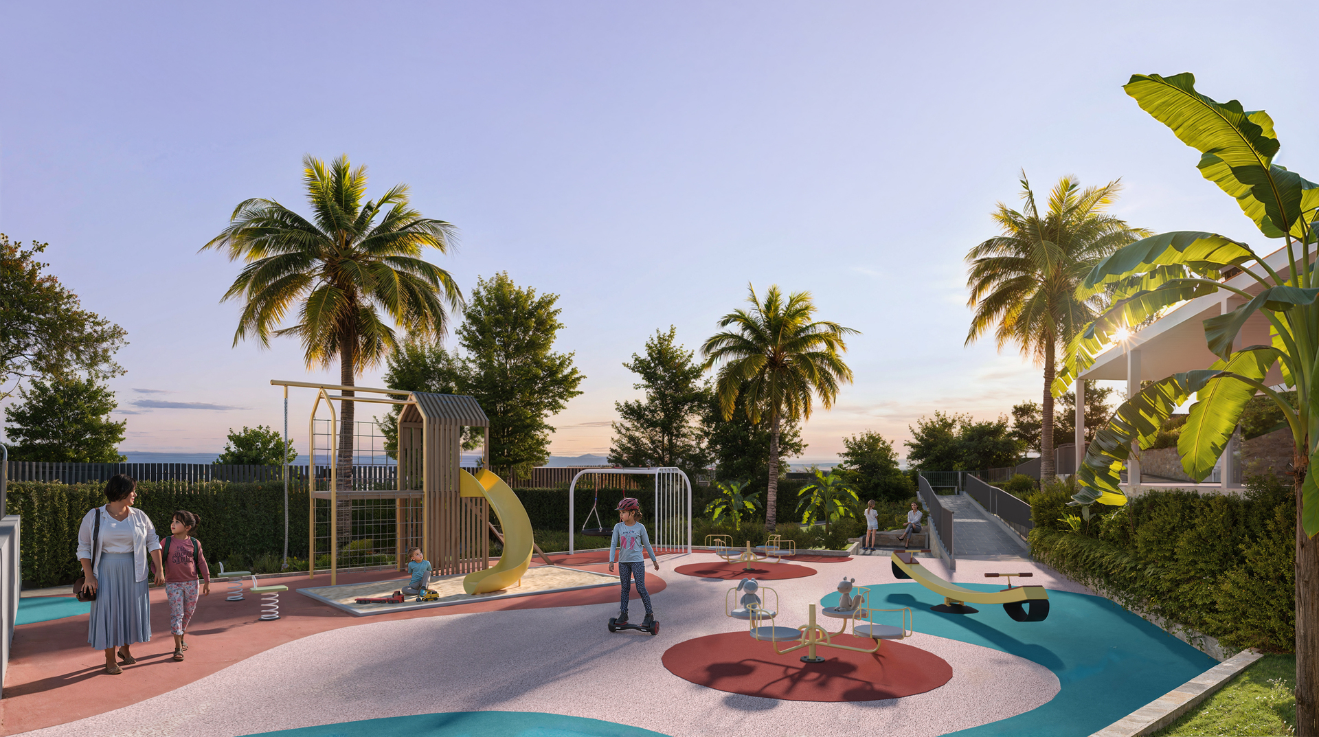 De buitenkant van het wooncomplex valt op door de natuurlijke landschapsarchitectuur en het ontwerp, waardoor een harmonieuze en ontspannen sfeer wordt gecreëerd. De zwembaden, zowel voor volwassenen als voor kinderen, worden omringd door aangelegde gebieden die je uitnodigen om te genieten van het mediterrane klimaat. Bewoners kunnen genieten van een golfbaan en een jeu de boulesbaan, die mogelijkheden bieden voor buitenactiviteiten en entertainment. Door de ligging op slechts 700 meter van de zee kun je vanuit alle appartementen genieten van het strand en een adembenemend panoramisch uitzicht. De structuur van het complex zorgt voor privacy en rust, ideaal voor een serene levensstijl.