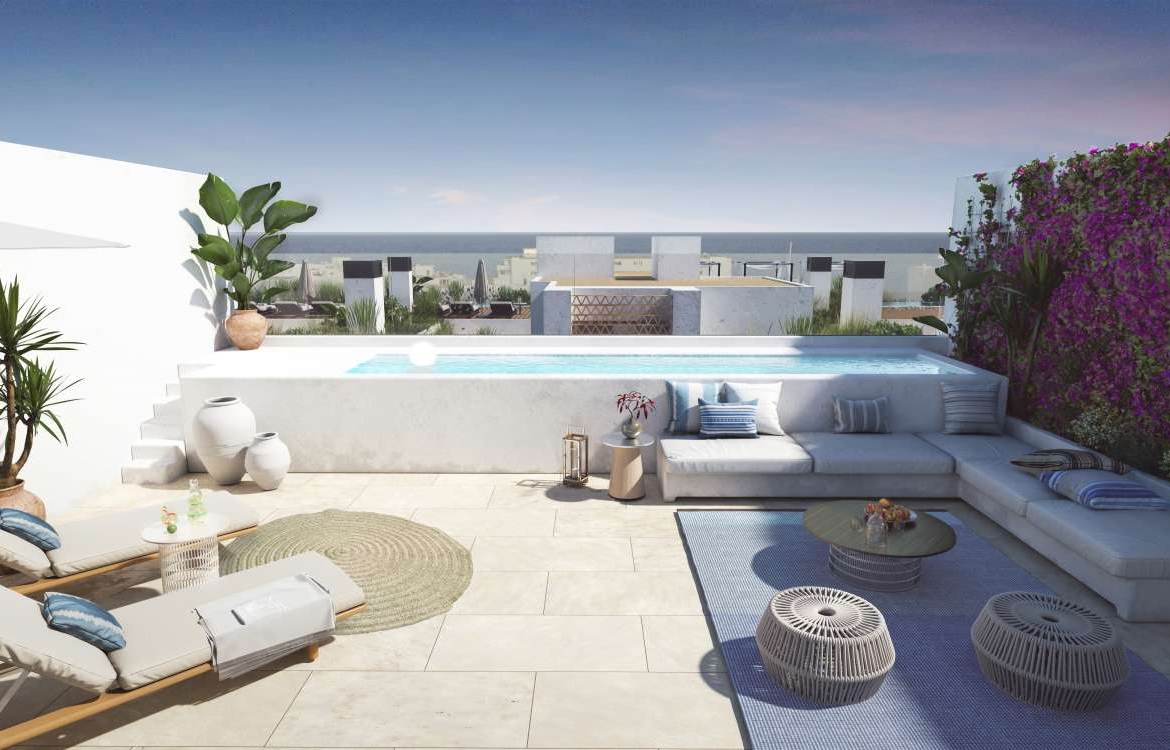 De omgevingOp slechts vijf minuten afstand van het strand van Santa Eularia, worden deze 57 woningen gebouwd en eind 2021 opgeleverd. Santa Eularia is een gemoedelijke stad met allerlei voorzieningen. Er is een eetstraat met restaurants die vrijwel alle wereldkeukens vertegenwoordigen, een fijne boulevard en steeds meer vijfsterrenhotels strijken neer in Santa Eularia. Het project Het gebouw bestaat uit 57 appartementen, waarbij er tevens gemeenschappelijke ruimtes zijn. Zoals een gym en een chill-out op het dak. Hier bevindt zich eveneens het zwembad met luxe ligbedden en een schitterend uitzicht op zee. Er is voldoende parkeergelegenheid en bij de totstandkoming van dit project speelt de natuur een grote rol. Dit uit zich in de terrassen, waarvan de muren met groene vegetatie zijn gedecoreerd en de artistieke roosters die buiten met binnen verbinden. Voorbeeld appartementDe perfect afgewerkte appartementen bieden een oase aan licht en beschikken over een open keuken en een woonkamer die uitmondt op het terras. U kunt kiezen uit een appartement met één, twee of drie slaapkamers. De exclusieve penthouses beschikken daarbij over een privézwembad.