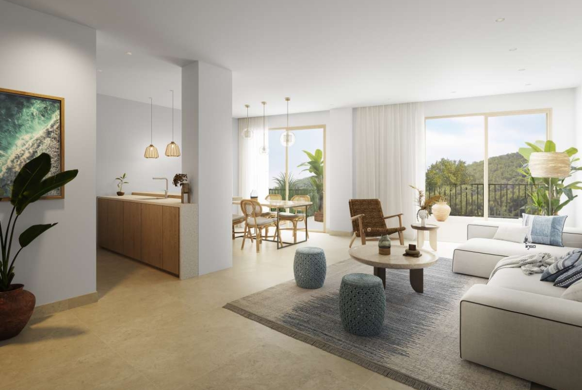 De omgevingOp slechts vijf minuten afstand van het strand van Santa Eularia, worden deze 57 woningen gebouwd en eind 2021 opgeleverd. Santa Eularia is een gemoedelijke stad met allerlei voorzieningen. Er is een eetstraat met restaurants die vrijwel alle wereldkeukens vertegenwoordigen, een fijne boulevard en steeds meer vijfsterrenhotels strijken neer in Santa Eularia. Het project Het gebouw bestaat uit 57 appartementen, waarbij er tevens gemeenschappelijke ruimtes zijn. Zoals een gym en een chill-out op het dak. Hier bevindt zich eveneens het zwembad met luxe ligbedden en een schitterend uitzicht op zee. Er is voldoende parkeergelegenheid en bij de totstandkoming van dit project speelt de natuur een grote rol. Dit uit zich in de terrassen, waarvan de muren met groene vegetatie zijn gedecoreerd en de artistieke roosters die buiten met binnen verbinden. Voorbeeld appartementDe perfect afgewerkte appartementen bieden een oase aan licht en beschikken over een open keuken en een woonkamer die uitmondt op het terras. U kunt kiezen uit een appartement met één, twee of drie slaapkamers. De exclusieve penthouses beschikken daarbij over een privézwembad.