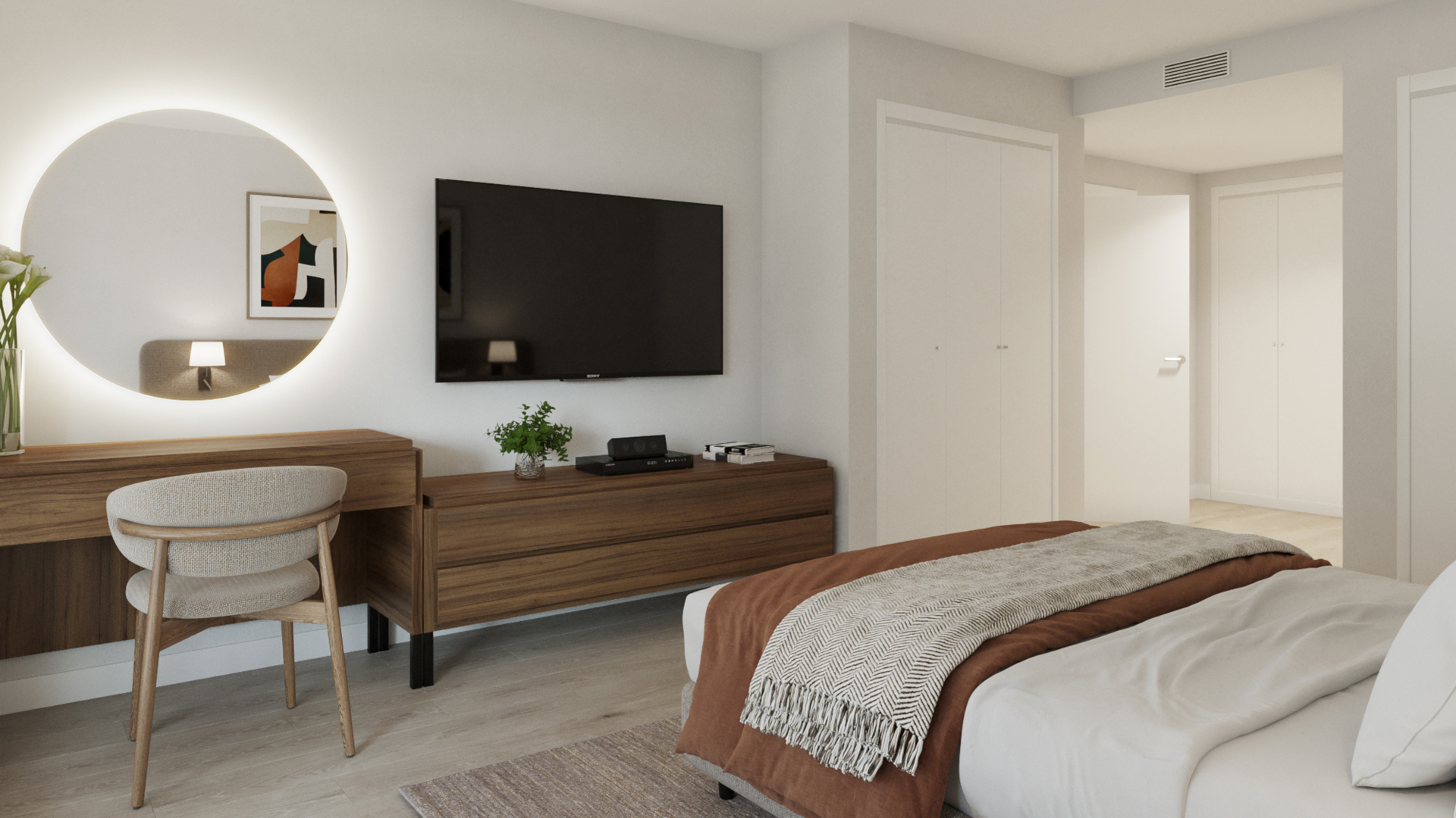 Elke woning is ontworpen om een superieure woonervaring te bieden, met de nadruk op functionaliteit en comfort. De woonkamer, eetkamer en keuken zijn gerangschikt in een open ruimte, waardoor een vloeiende en ruime omgeving ontstaat die direct aansluit op het terras. Door de grote ramen valt er veel natuurlijk licht binnen, wat zorgt voor een lichte en uitnodigende sfeer. De keuken is modern ingericht en volledig uitgerust met hoogwaardige apparatuur. Het meubilair is zorgvuldig ontworpen, met hoogwaardige afwerkingen en een efficiënte indeling die het gebruik van de ruimte optimaliseert. De woonkamer wordt gekenmerkt door grote ramen die een spectaculair uitzicht bieden en een directe verbinding met het terras. Op de vloer ligt een houten vloer die warmte en comfort toevoegt aan de sfeer. De eetkamer, geïntegreerd in deze open ruimte, biedt een ideale plek om momenten te delen met familie of vrienden, en de slaapkamers zijn ontworpen met maximaal comfort in het achterhoofd. Ze hebben allemaal grote ramen, zodat je kunt genieten van het uitzicht en het natuurlijke licht, met een elegant ontwerp, met een modern en functioneel tintje.