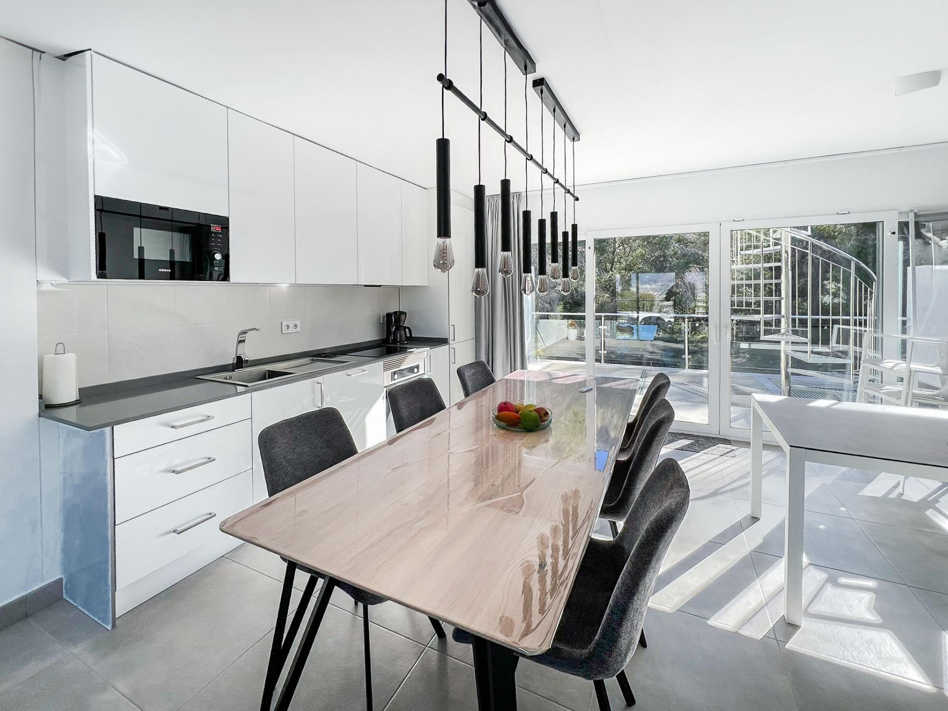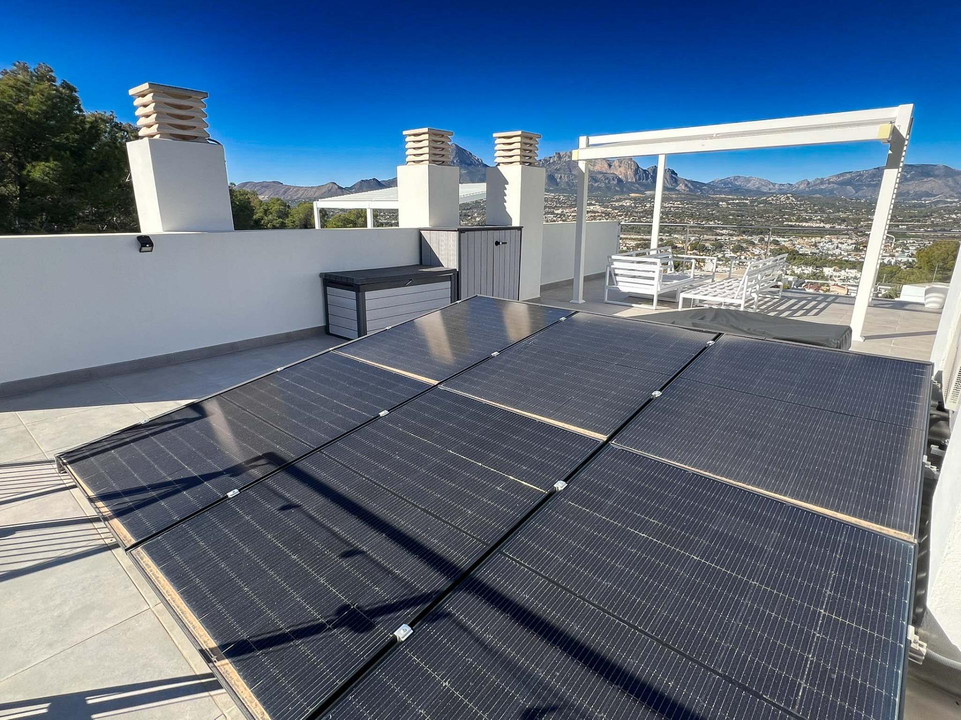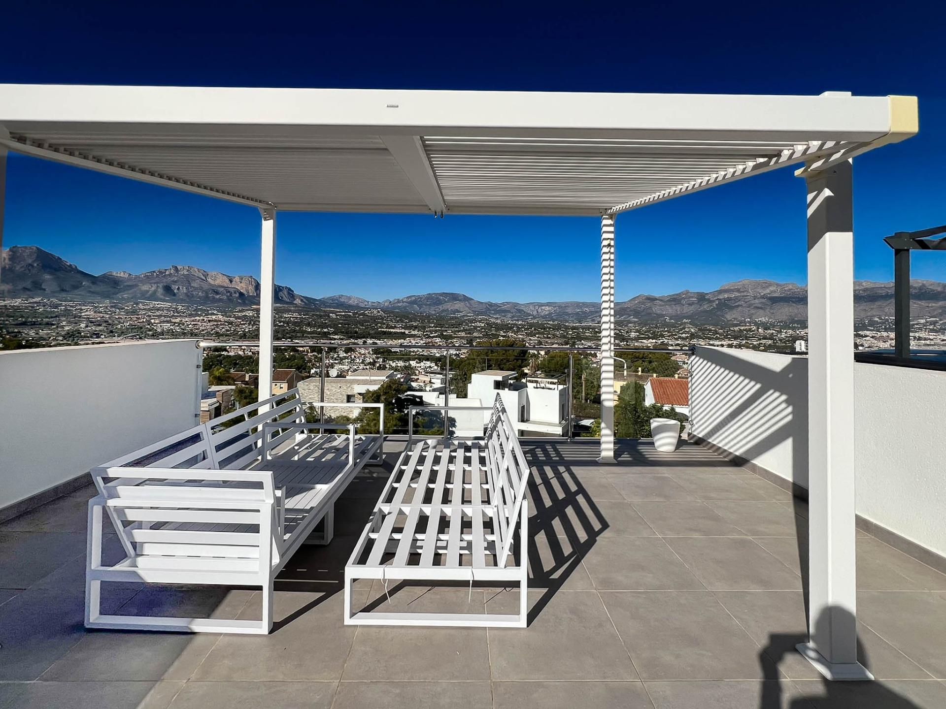 Ontdek deze indrukwekkende nieuw gebouwde tussenwoning, gelegen in het gewilde gebied van Albir. Met een uitzonderlijke indeling over drie verdiepingen en een spectaculair solarium waar je kunt genieten van uitzicht op de bergen evenals de baai van Albir en Altea. Op de begane grond bevindt zich een privé garage met wasruimte en badkamer; terwijl de eerste verdieping twee gezellige slaapkamers herbergt, waarvan één is uitgerust met een eigen kleedkamer en beide met en-suite badkamer. De tweede verdieping biedt een ruime woonkamer-eetkamer die verbonden is met een moderne open keuken, naast twee terrassen die ideaal zijn om te genieten van het mediterrane klimaat in de open lucht, evenals een toilet. De privé lift biedt directe toegang tussen de verschillende verdiepingen, waardoor het verplaatsen door het hele huis gemakkelijk is. Ook uitgerust met airconditioning via individuele splits en duurzame installaties dankzij de zonnepanelen, garandeert deze tussenwoning comfort het hele jaar door zonder je economische of ecologische welzijn uit het oog te verliezen. Maak je zomerse dagen compleet door gebruik te maken van de gemeenschappelijke ruimtes met een gemeenschappelijk zwembad, perfect om te ontspannen onder de warme Spaanse zon.