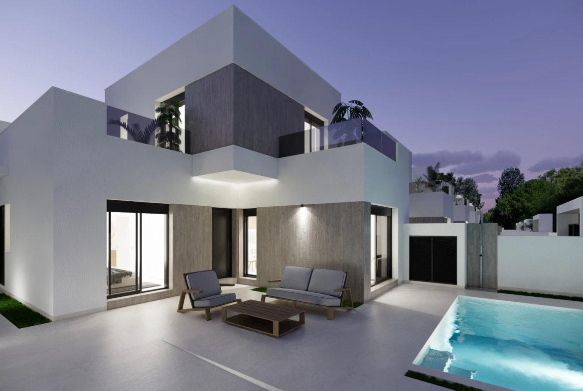 Binnen valt het ontwerp op door zijn moderniteit en kwaliteit. De villa's hebben 3 slaapkamers, 2 complete badkamers en een gastentoilet verdeeld over 151,94 m² vloeroppervlak. De keuken, in elegant wit en houttinten, is ontworpen om op natuurlijke wijze te integreren met de woon-eetkamer en vormt zo een open en uitnodigende ruimte. Het aluminium buitenschrijnwerk met dubbele beglazing, elektrische rolluiken in het hele pand en LED-verlichting zorgen voor efficiëntie en comfort, en de afwerking omvat vloeren van hoge kwaliteit, muren van zichtbare bakstenen met gladde verf, witgelakte deuren met roestvrijstalen beslag en een gepantserde toegangsdeur om maximale veiligheid te garanderen. Pre-installatie voor airconditioning, vloerverwarming in de badkamers (optioneel) en een warmtepompverwarmingssysteem met laag verbruik zijn ook inbegrepen. De badkamers zijn volledig uitgerust met wandmeubels, doucheschermen en mengkranen met een modern design.