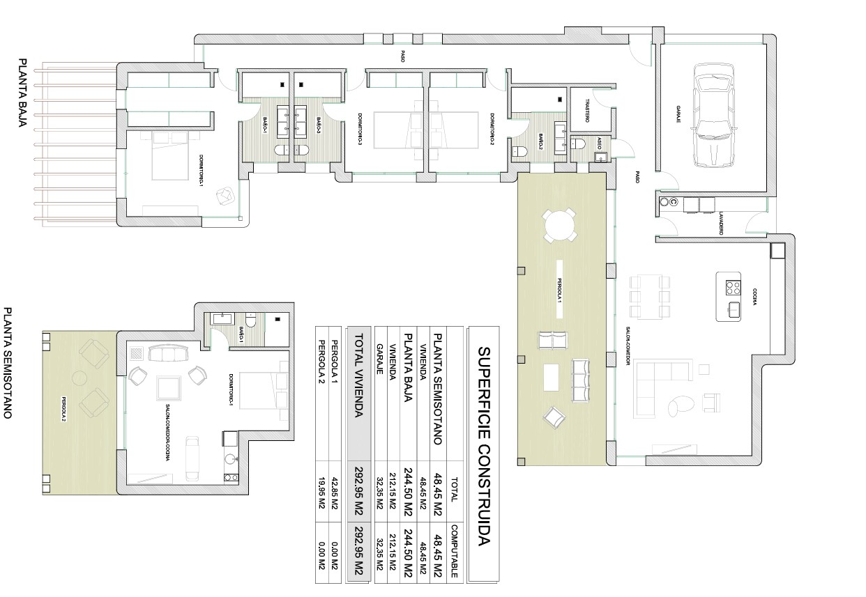 Deze villa is ontworpen met oog voor detail en biedt alles wat u zich kunt wensen. De begane grond beschikt over een ruime en lichte woon-eetkamer die naadloos overgaat in een moderne open keuken. Vanuit de leefruimtes leiden grote schuiframen naar een ruim terras met een stijlvolle pergola, ideaal om te genieten van het zonnige klimaat. Het terras ligt direct aan het privézwembad en is perfect georiënteerd op het zuiden, zodat u de hele dag van de zon kunt genieten. Op deze verdieping bevinden zich tevens drie ruime tweepersoonsslaapkamers, elk met een en suite badkamer, en een gastentoilet. Voor extra gemak is er ook een garage die direct verbonden is met de woning.