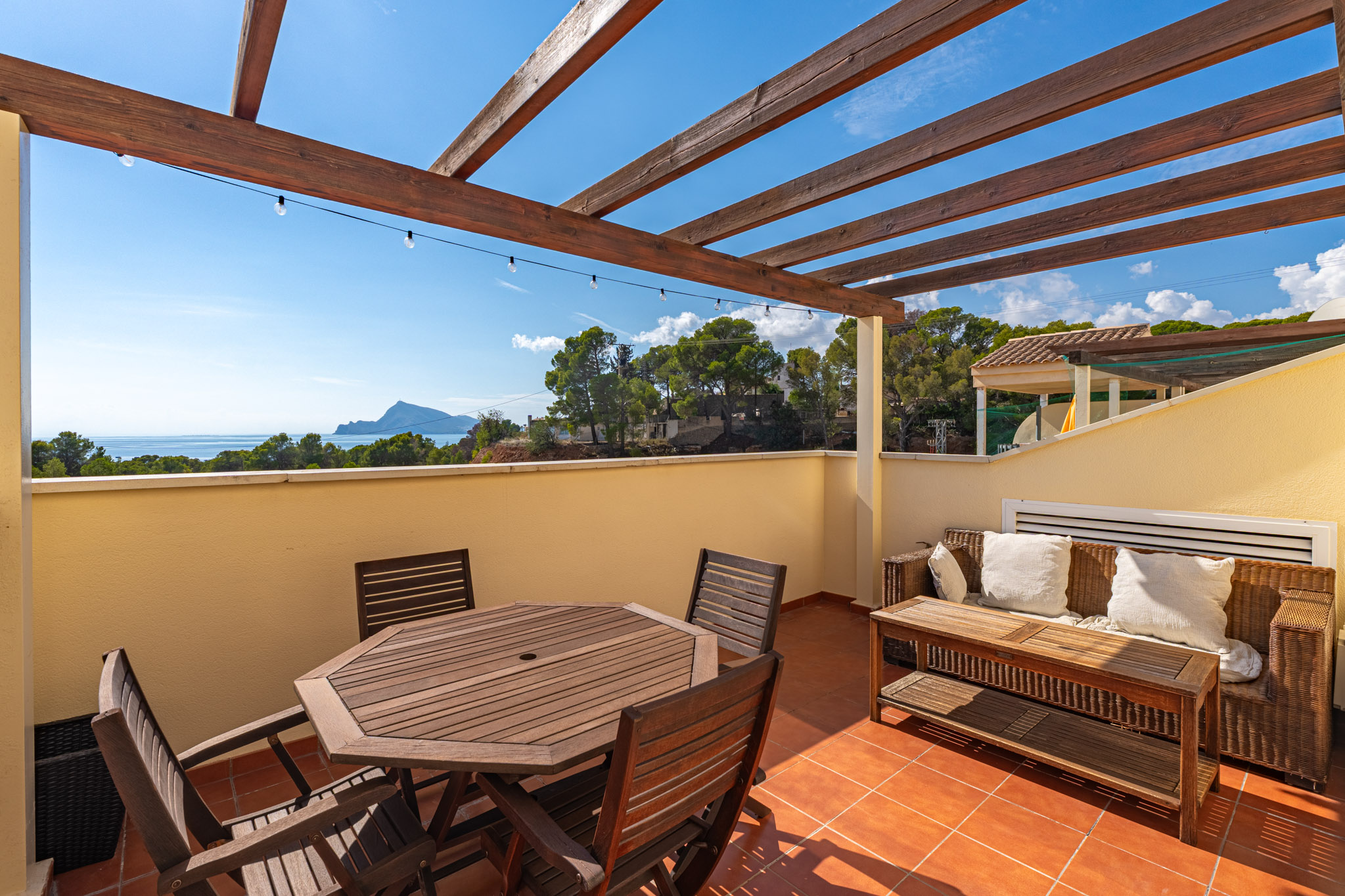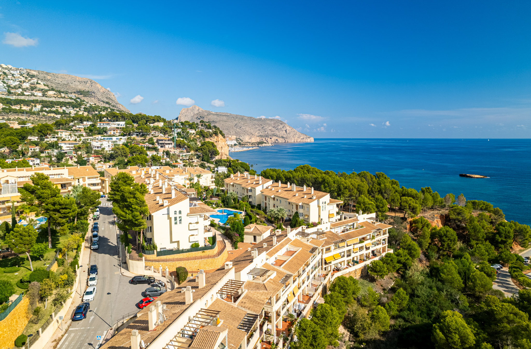 Ontdek dit spectaculaire duplex penthouse gelegen in het prestigieuze gebied Isla de Altea. Een ideale eigendom voor wie op zoek is naar een rustige en verfijnde omgeving aan zee, met adembenemende open uitzichten op de Middellandse Zee en de Sierra de Bernia bergen. Met een bouwoppervlak van 150 m² biedt dit penthouse een moderne en functionele indeling die het natuurlijke licht in elke kamer maximaliseert. Het beschikt over drie slaapkamers, twee volledige badkamers en een onafhankelijke, volledig uitgeruste keuken met een aparte wasruimte. Gebouwd in 2004 en in uitstekende staat, is het pand op het zuiden gericht, wat zorgt voor overvloedig zonlicht gedurende de dag en een warme, uitnodigende sfeer. Hoogtepunten zijn een ruime dakterras van 20 m², ideaal voor het genieten van het Mediterraanse klimaat en panoramische uitzichten, een privébalkon met directe zeezicht, gesplitste airconditioning in het hele appartement, inbouwkasten in alle slaapkamers, een lift in het gebouw en een privé parkeergelegenheid met berging inbegrepen in de prijs. Het residentiële complex biedt exclusieve gemeenschappelijke faciliteiten zoals een sportschool, een speelruimte voor kinderen en twee zwembaden, perfect voor ontspanning en recreatie zonder het huis te verlaten.