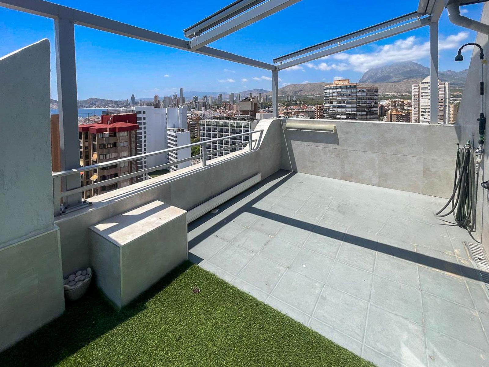 Prachtig droompenthouse, dicht bij het centrum van Benidorm met een groot terras en panoramisch uitzicht op zee en bergen.~Dit appartement biedt een spectaculair uitzicht over heel Benidorm.~Het beschikt over een woon-eetkamer, 2 slaapkamers, 2 badkamers (1 en suite), aparte keuken, wasruimte en berging.~Op het grote terras is een buitendouche aanwezig en er is ruimte voor een barbecue of zomerse buitenkeuken.~Zowel de slaapkamers, de woonkamer als de keuken hebben directe toegang tot het terras.~De residentie beschikt over een gemeenschappelijk zwembad en parkeerplaatsen.~Bent u op zoek naar een droompenthouse in een rustige omgeving maar toch dicht bij alle voorzieningen, dan is dit uw appartement. Neem contact met ons op voor een bezichtiging.