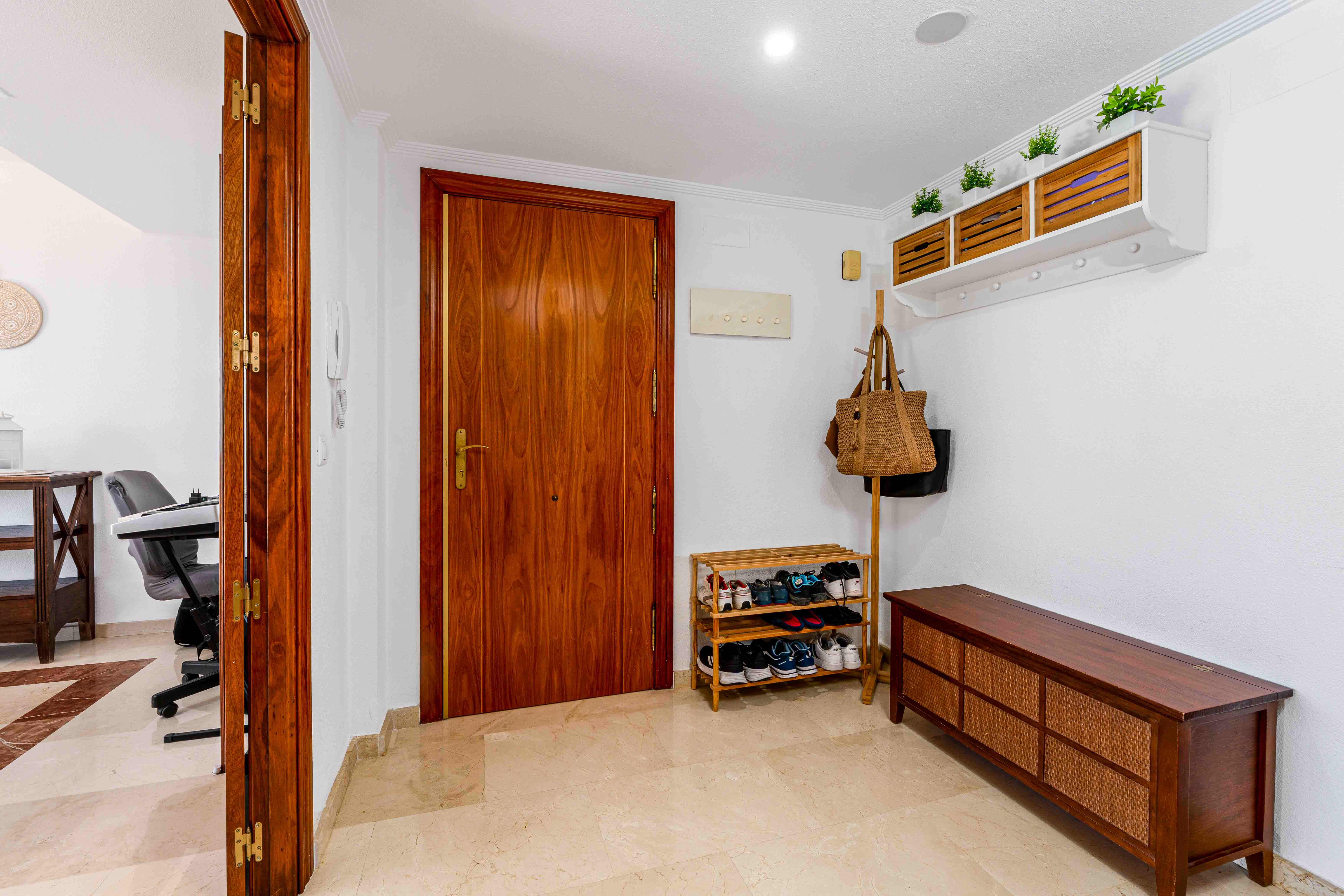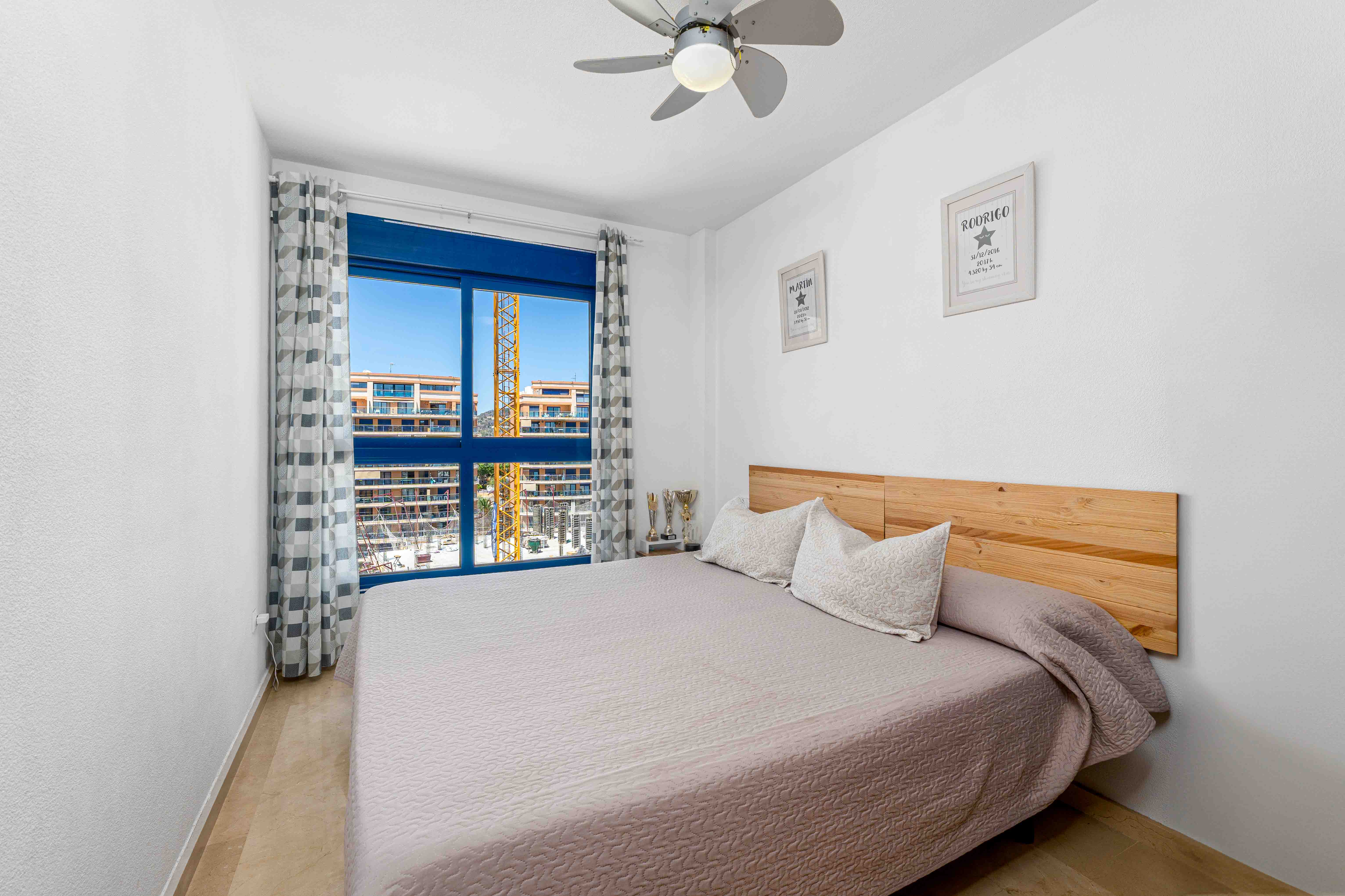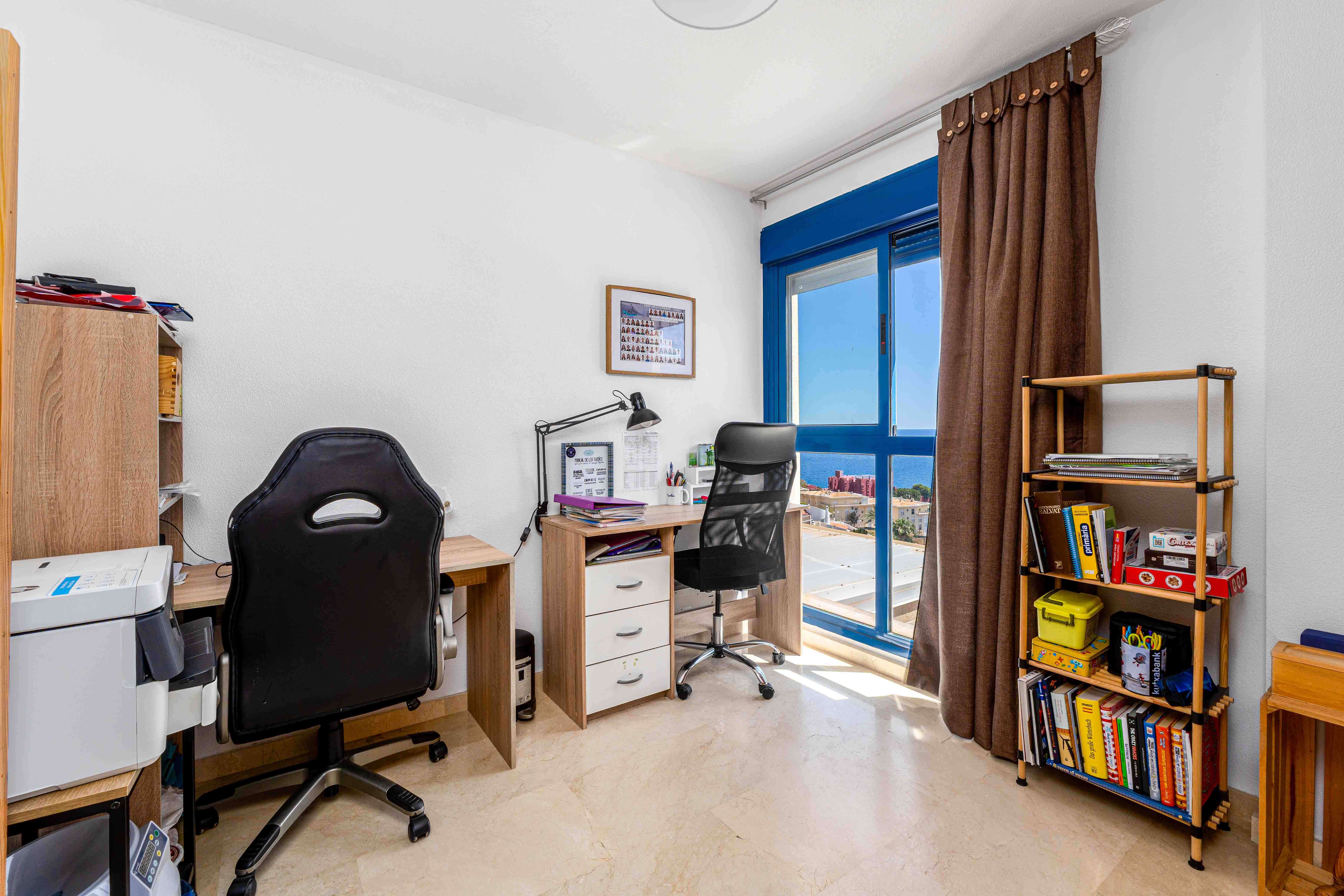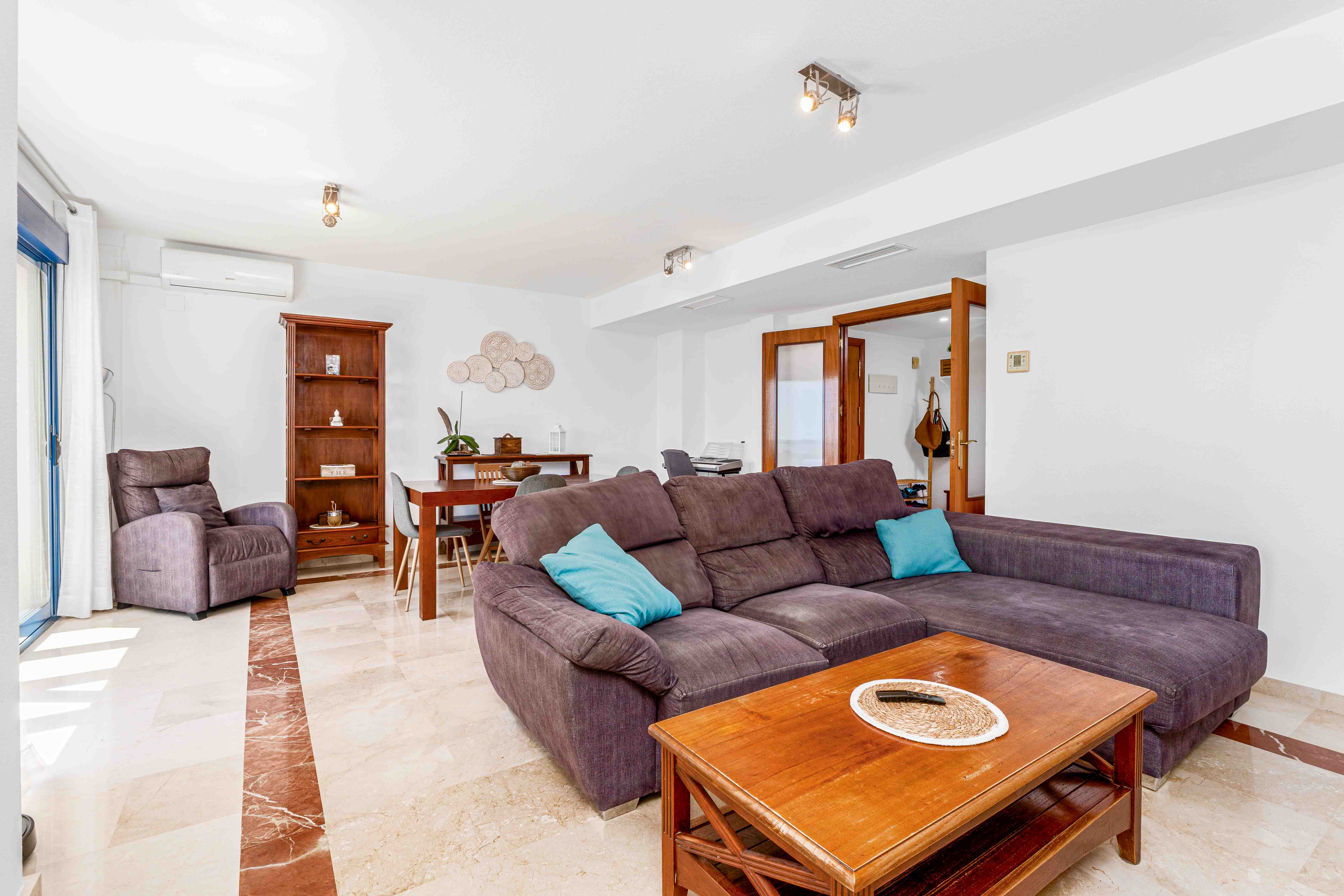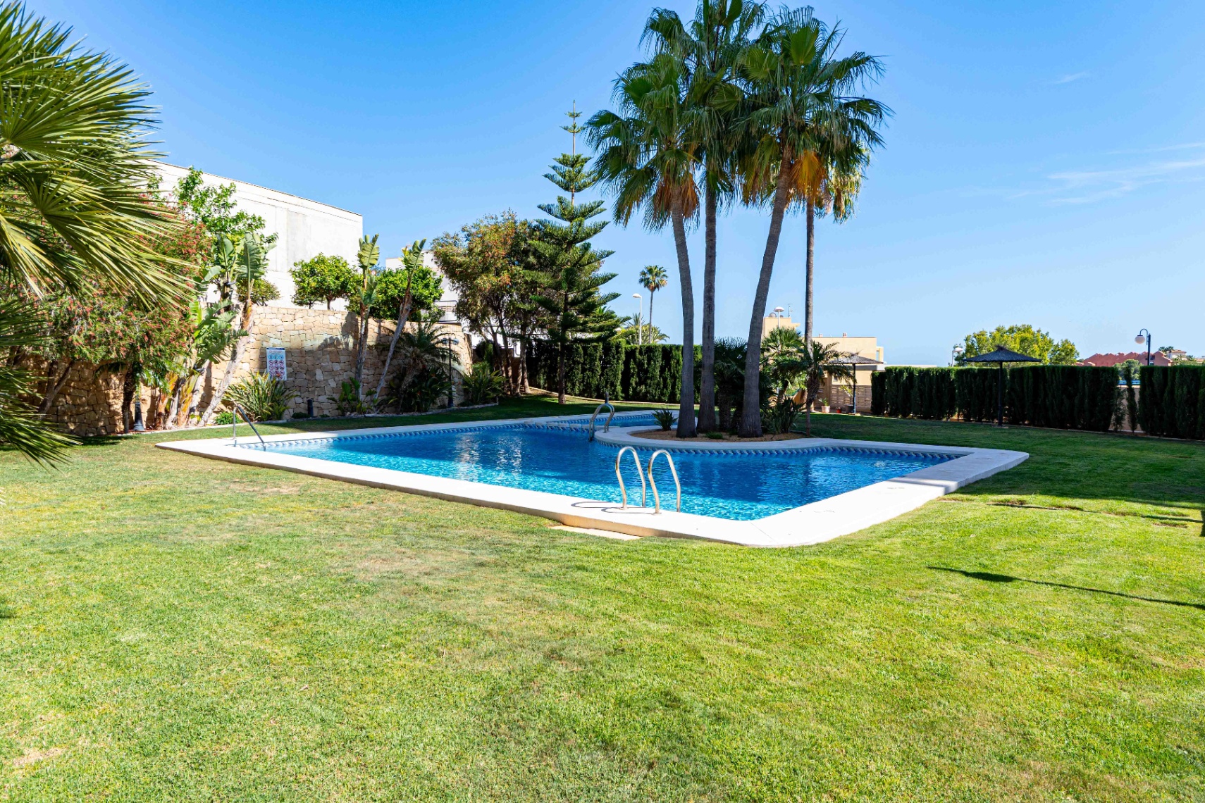 Voorzien van centrale verwarming en airconditioning in de woonkamer en de master suite, wordt de woning gemeubileerd aangeboden en omvat twee privéparkeerplaatsen en twee opslagruimten. Gelegen in een gated community met verzorgde groenvoorzieningen, een gemeenschappelijk zwembad, een multifunctioneel sportveld en een speeltuin voor kinderen, biedt het comfort en gemak op slechts 400 meter van de zee en 300 meter van winkels en diensten.