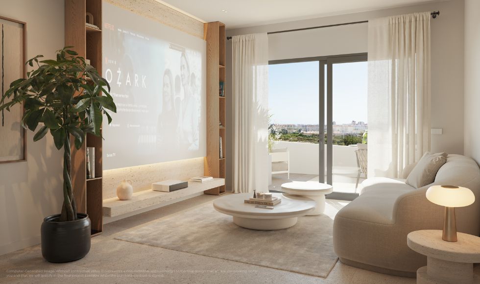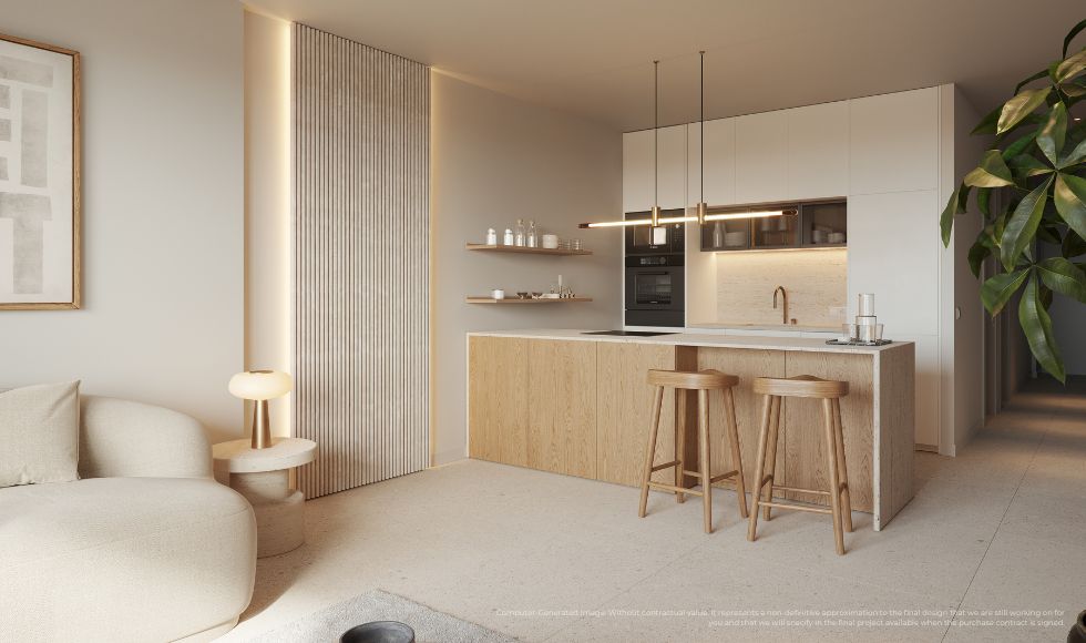 De appartementen vallen op door hun grote ramen die het interieur met het terras verbinden en veel natuurlijk licht binnenlaten. De keuken is open en uitgerust met een centraal eiland dat dienst doet als ontbijtbar, gericht naar het zwembad voor een vrij uitzicht. De hoofdslaapkamer heeft een en-suite badkamer en een kleedkamer, ook gericht naar het zwembad om te profiteren van het ochtendlicht. De andere slaapkamers bevinden zich aan de andere kant van het huis voor meer privacy en rust, ideaal voor gezinnen of om te telewerken. De indeling is gericht op comfort, lichtinval en privacy.