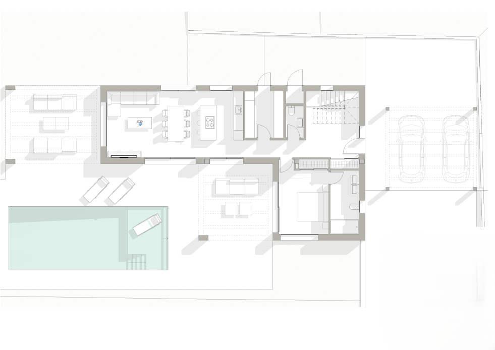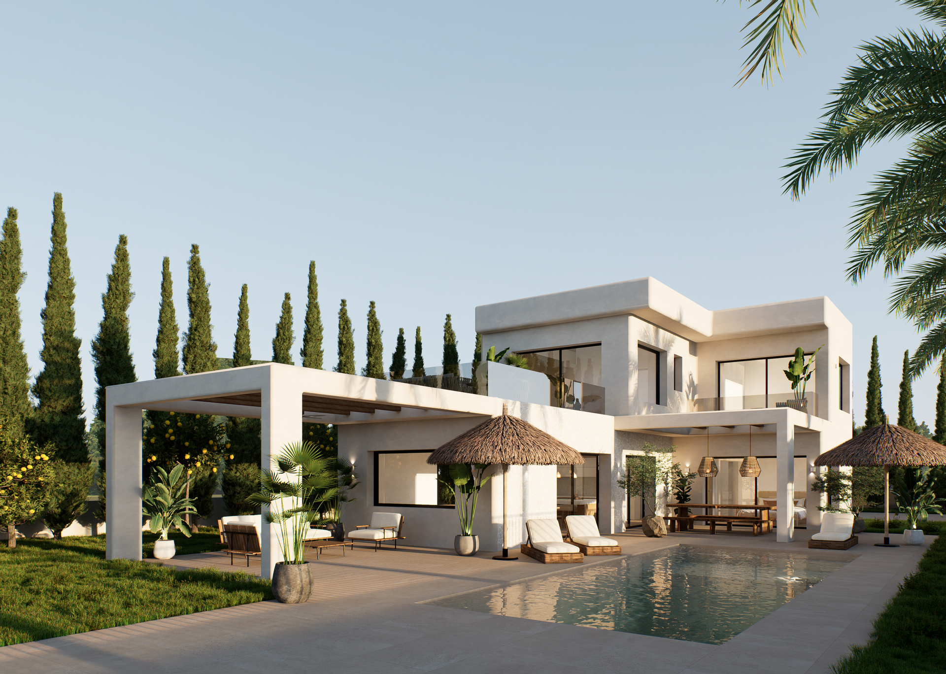 Het ontwerp voorziet in een onderhoudsarme mediterrane tuin, ruime terrassen, een zwembad van 10 × 4 meter en een carport voor twee auto’s. Het perceel is vlak, omheind aan drie zijden en voorzien van een voetgangersentree, waardoor de opstartkosten voor de bouw minimaal zijn.
