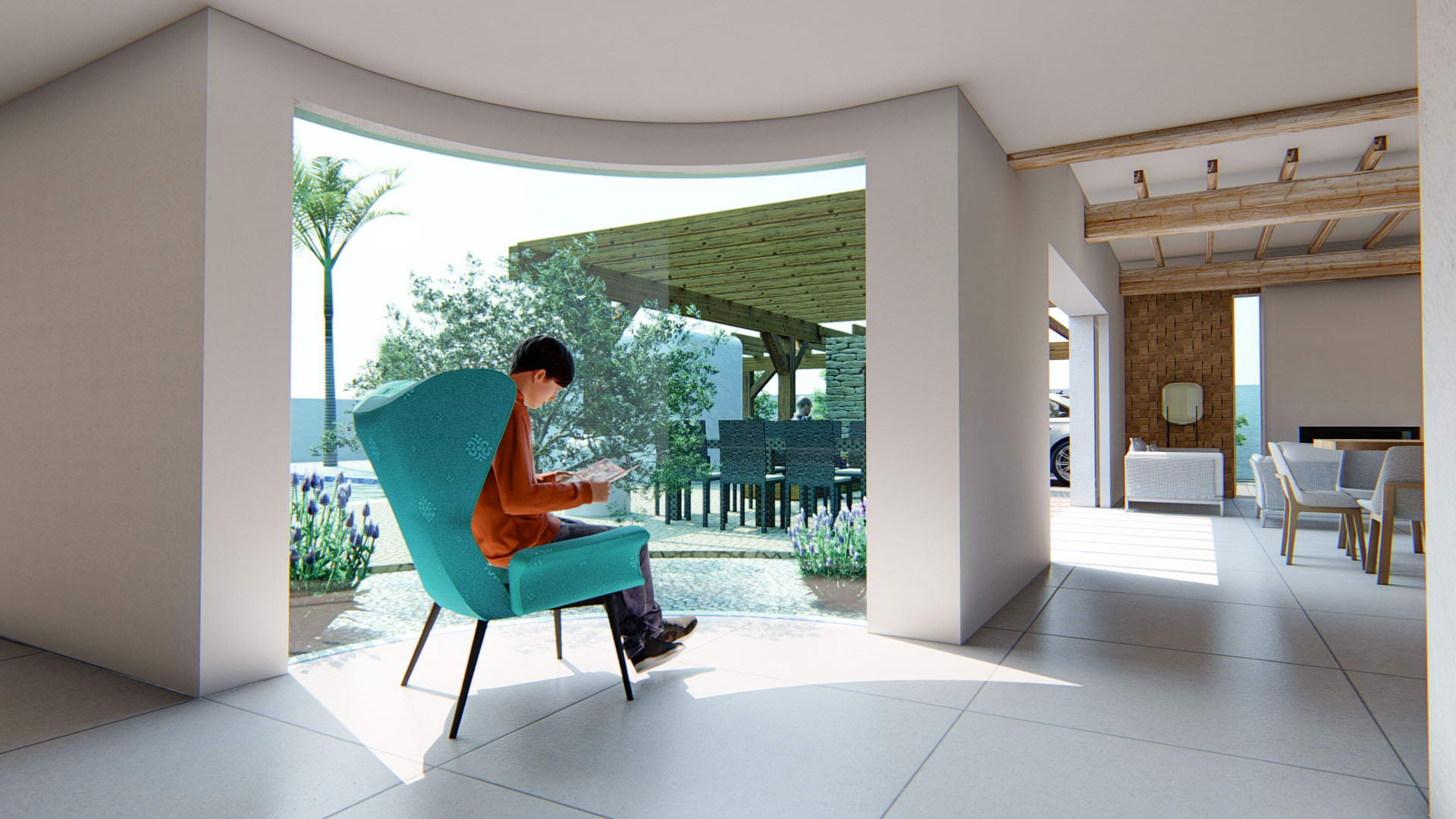 Het interieur is georganiseerd rond een woonkamer met een hogere dan normale hoogte, gedecoreerd met warme houttinten in plafondbalken, wandpanelen en keukenkastjes. Het nachtgedeelte bestaat uit slaapkamers, badkamers, wasruimte en een kantoor, afgescheiden van het openbare gedeelte door een rotonde-vormige hal met gebogen glas, die uitkomt op het zwembad en een olijfboom, wat een gezellige en elegante sfeer creëert. Er is ook een buitenberging voor extra opslagruimte.