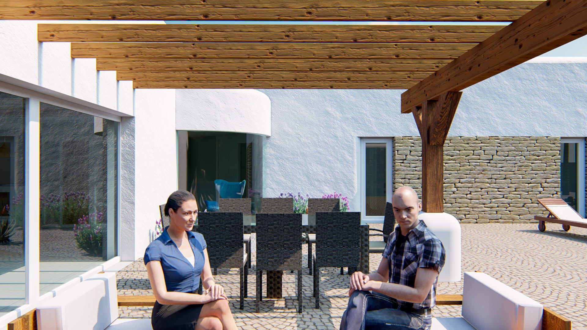 Het Ibiziaanse project onderscheidt zich door de L-vormige indeling op de begane grond, met de nadruk op een volume dat de woonkeuken-eetkamer huisvest, met een groot glazen schuifpaneel dat verborgen is in de scheidingsmuren en uitkomt op de pergola en het terras met een zwembad op het zuiden. Het heeft ook een grote pergola boven de parkeerplaats, die een extra overdekte buitenruimte biedt.
