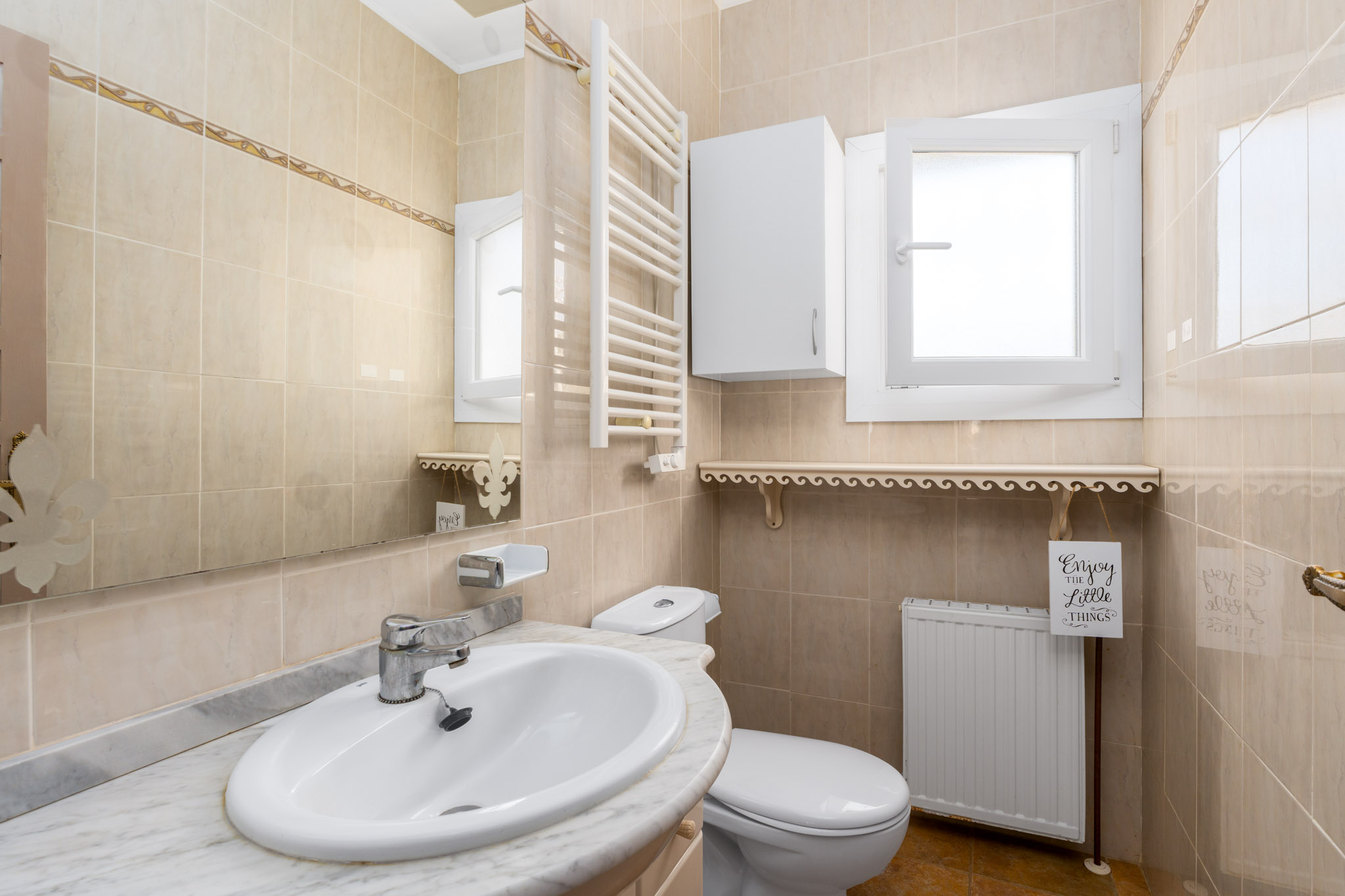 De villa, oorspronkelijk gebouwd in 1980 en gerenoveerd in 2023, beslaat drie verdiepingen met een totaal bebouwd oppervlak van 350 m². De hoofdingang op straatniveau komt uit in een lichte woonkamer met een open keuken en eetruimte. Deze verdieping omvat ook drie slaapkamers met inbouwkasten, twee badkamers en een groot open terras met panoramisch uitzicht.