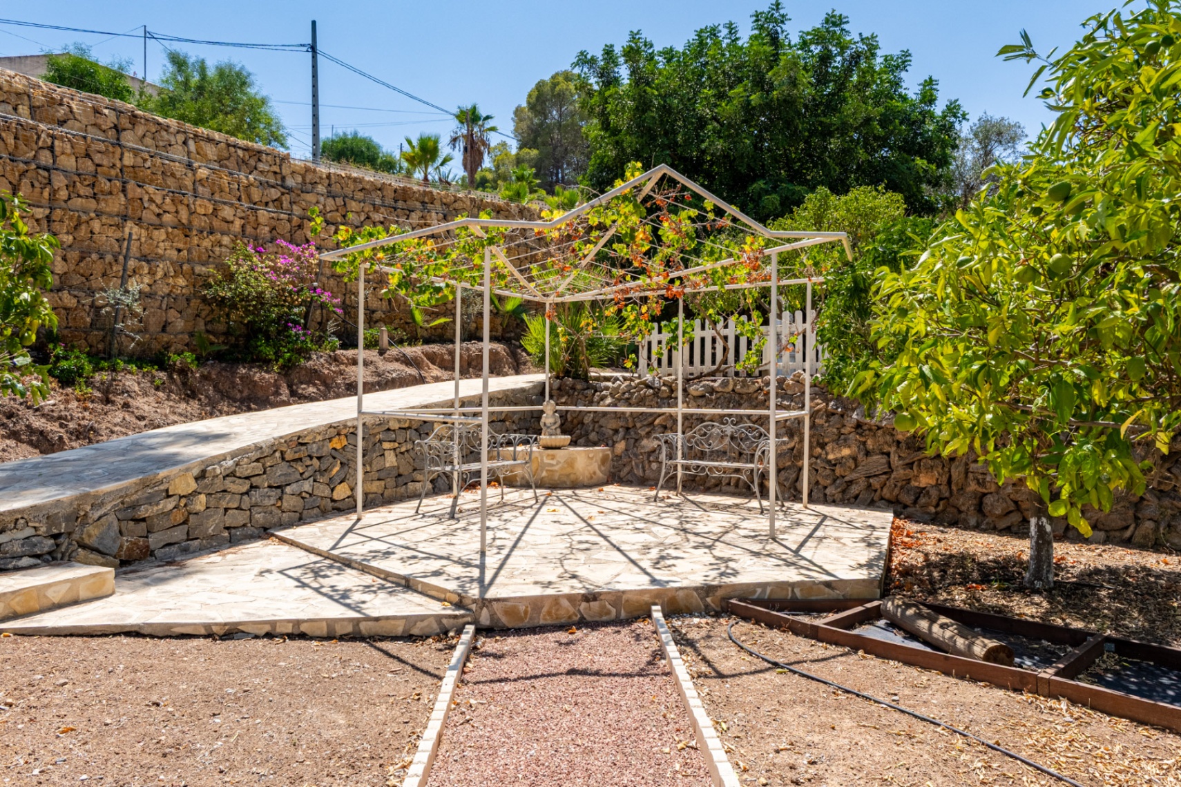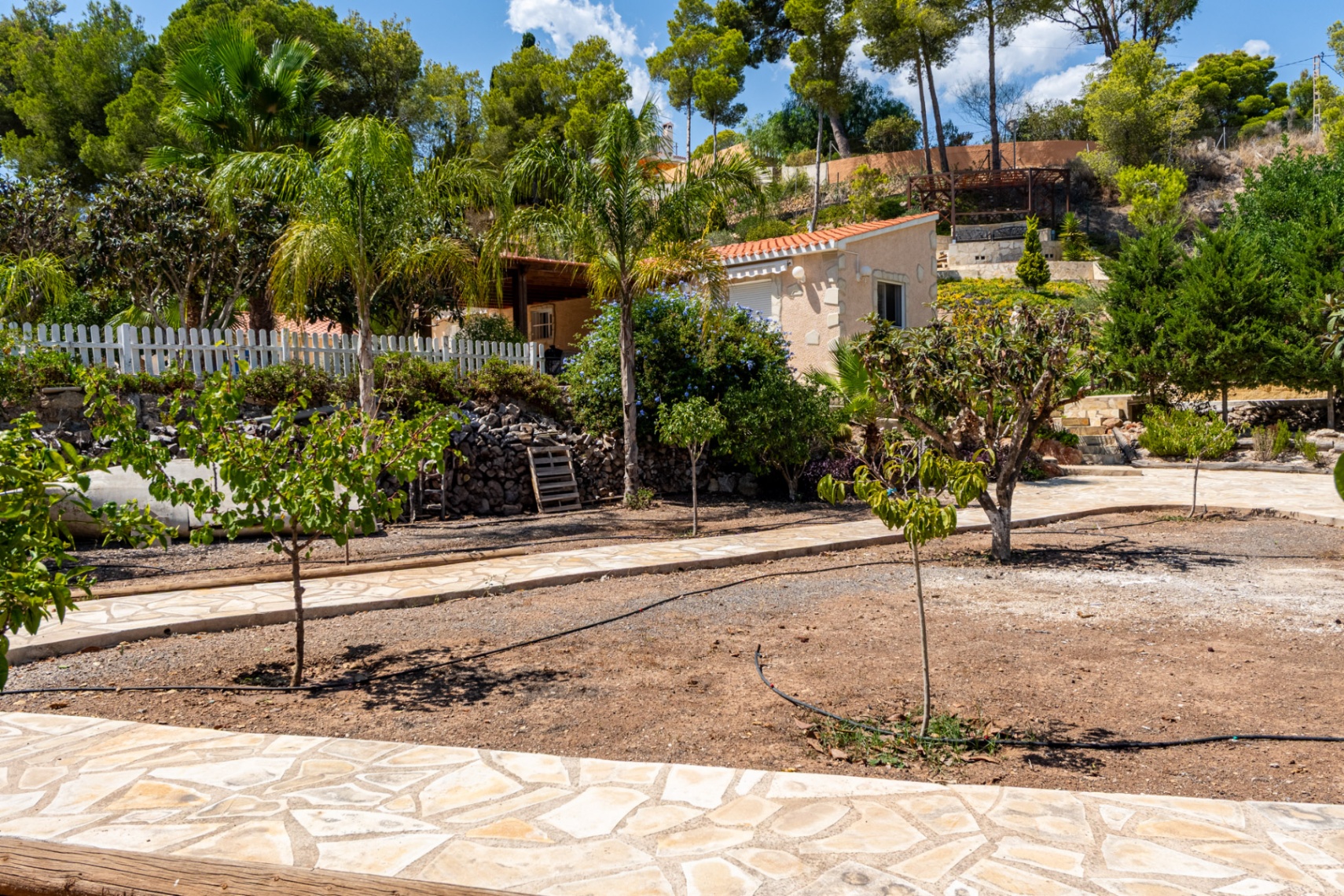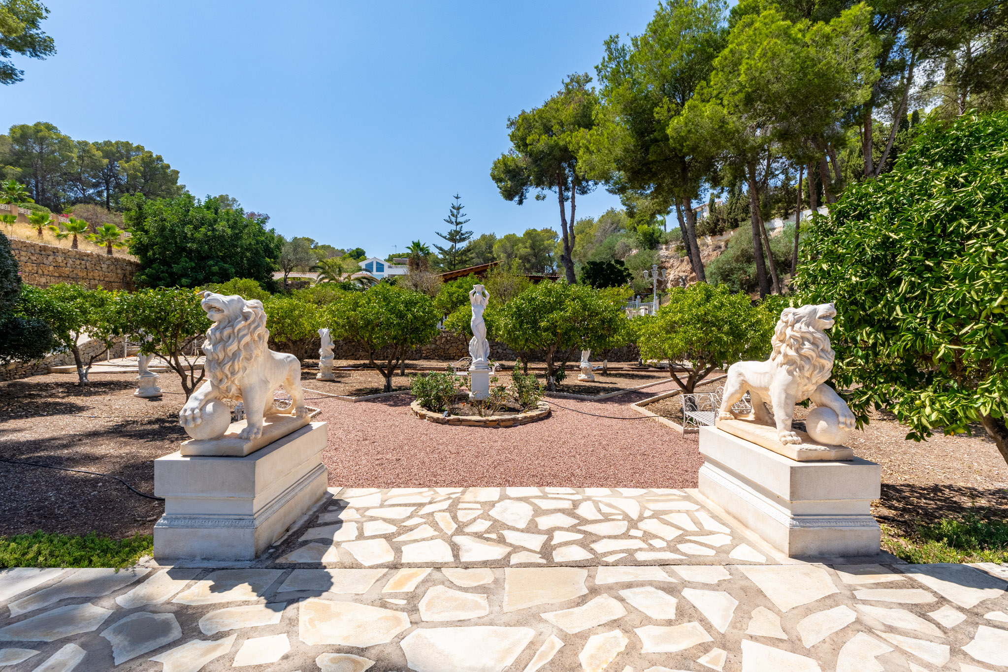 Gevestigd op een royale 5.943 m² grote aangelegde kavel, zijn de gronden versierd met volwassen bomen, fruitbomen, mediterrane planten, met stenen geplaveide wandelpaden en unieke sculpturen, wat zorgt voor de sfeer van een privé natuurgalerij.