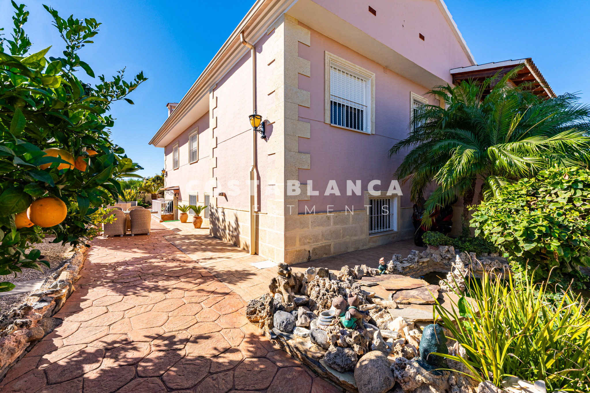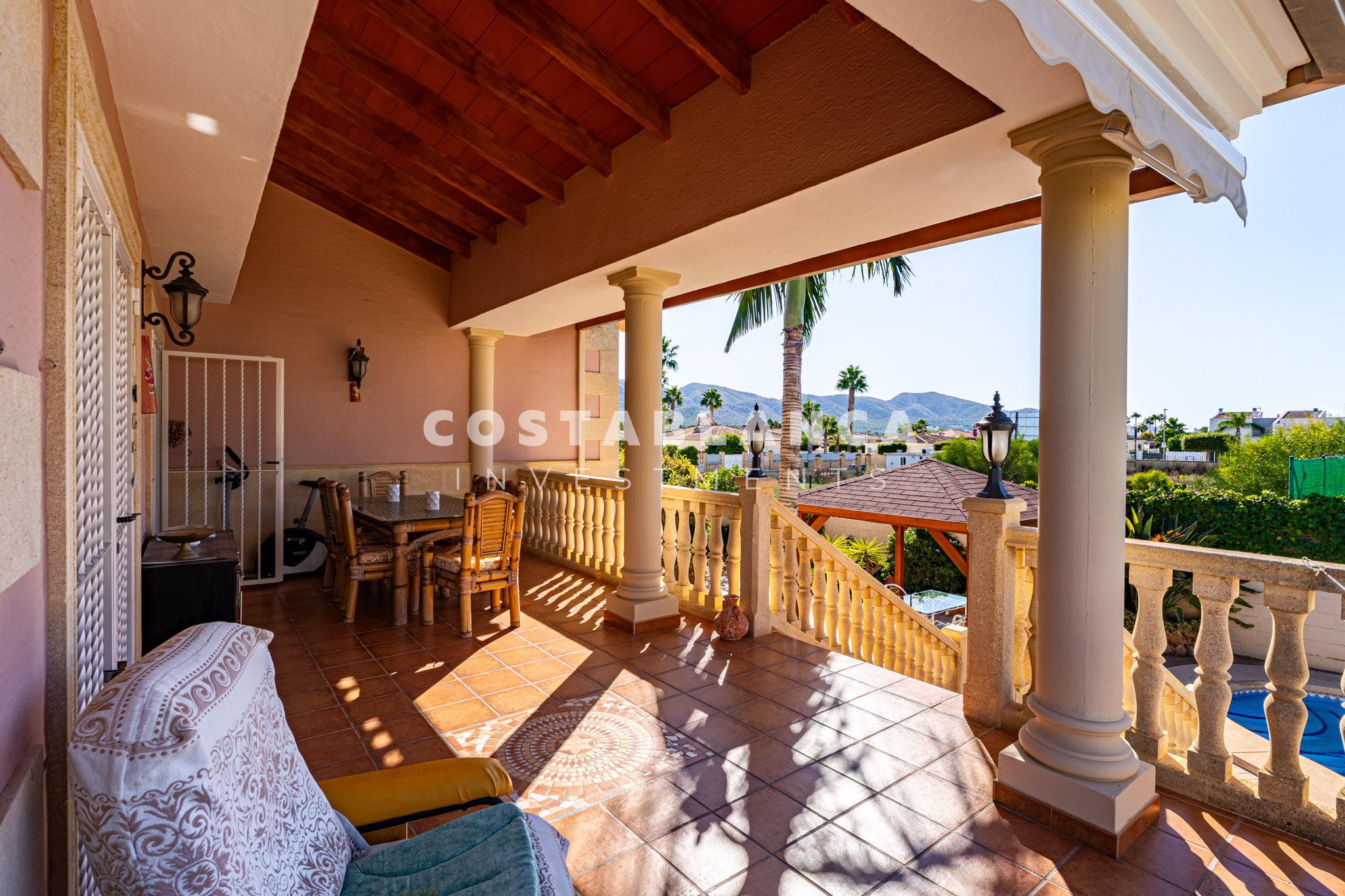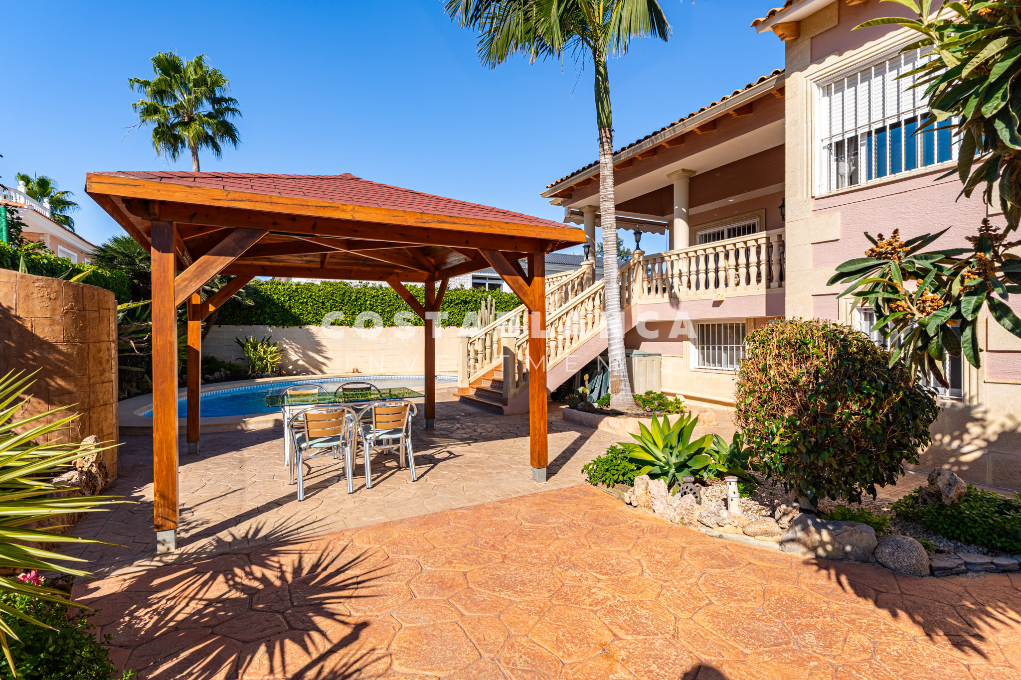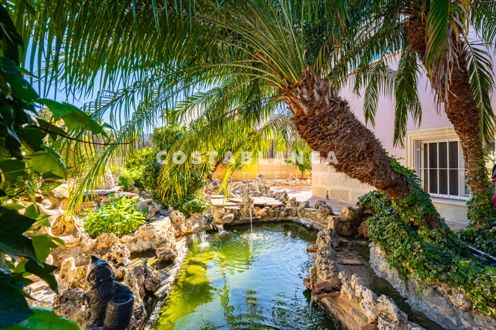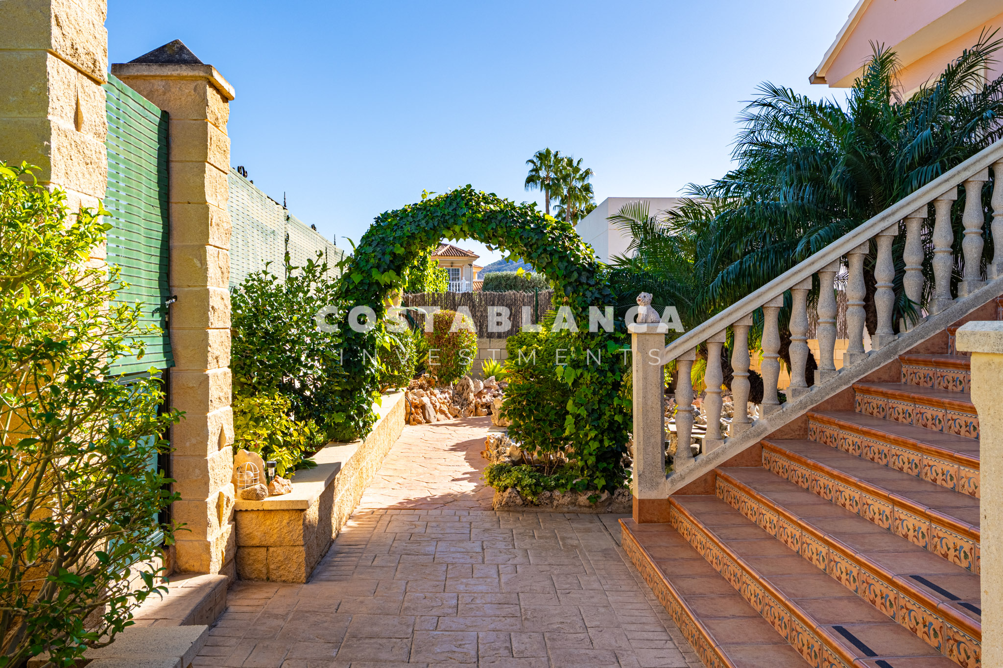 Bergzicht omlijst het pand, dat ook een goed onderhouden tuin, een privézwembad, verschillende terrassen en diverse chillout ruimtes omvat, waaronder een overdekte ruimte die perfect is voor buiten dineren en ontspanning, en ook een prachtige vijver heeft. De ingang van de villa wordt gekenmerkt door brede open trappen die naar de hoofdverdieping leiden, wat de woning een unieke architecturale uitstraling geeft.