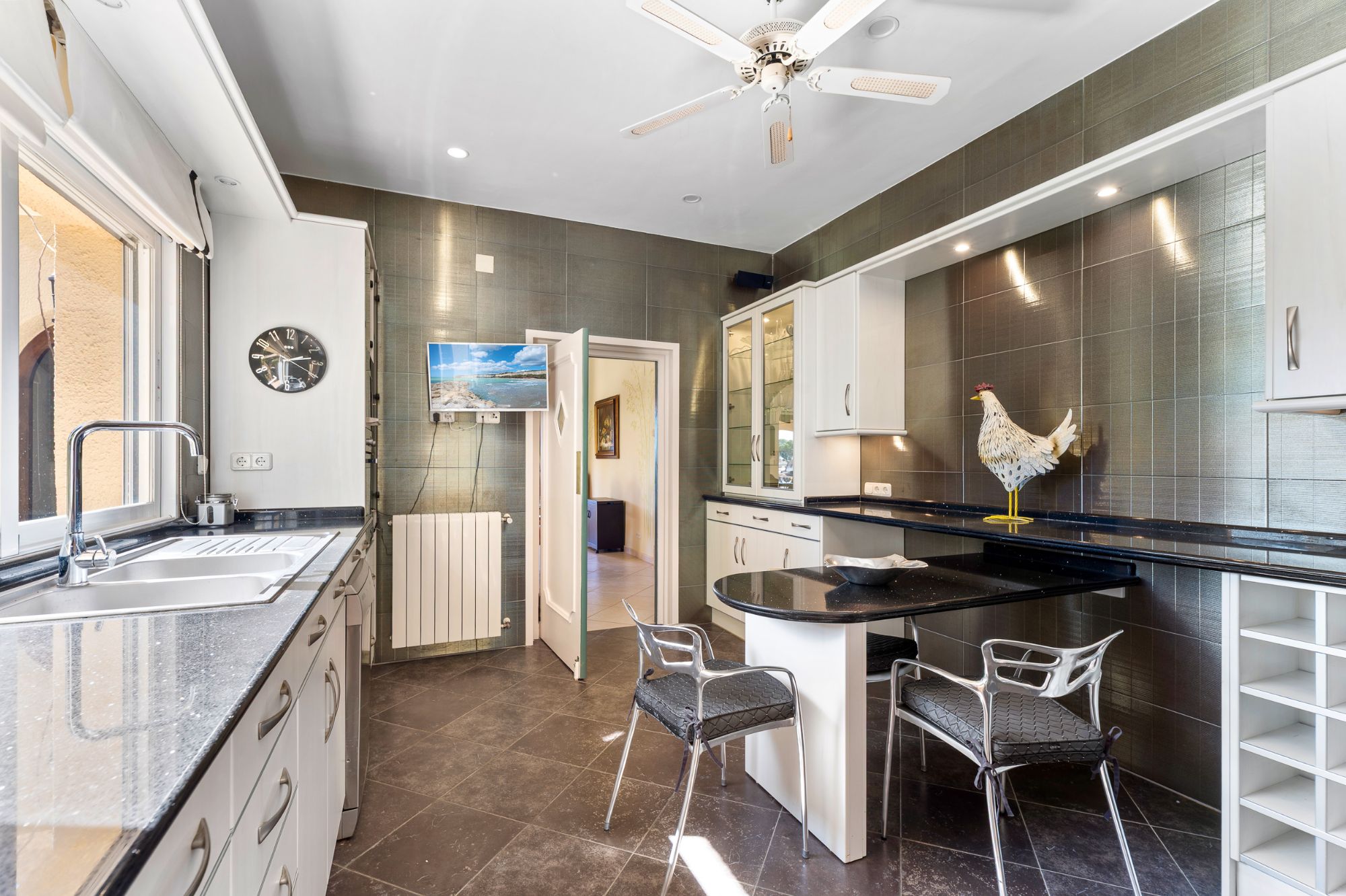 Bij binnenkomst in dit vredige terrein van 3.600 m², genesteld in de Sierra, word je onmiddellijk verwelkomd door het serene geluid van vogelgezang en de geurige geur van jasmijn wanneer je onder een charmante boog bedekt met planten doorgaat. Een kleine inkomhal, gericht op het zuidoosten, leidt naar een ruime woon en eetkamer versierd met houten plafondbalken en grote panoramvensters die adembenemende uitzichten op de baai en de Sierra Helada omlijsten.