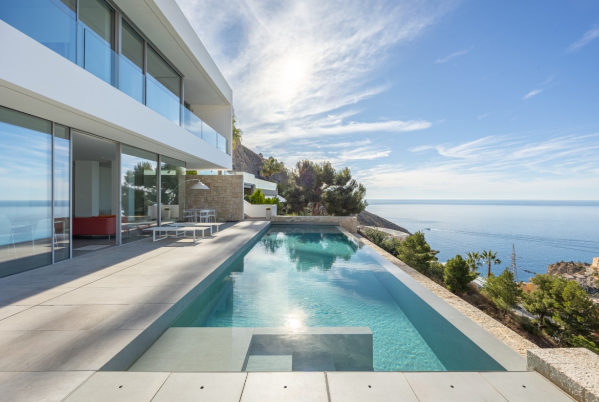 Te koop: een moderne luxe villa gebouwd volgens de hoogste bouwnormen, met adembenemend uitzicht op zee in het gebied Mascarat. Deze verfijnde woning biedt ongeëvenaarde privacy en rust. Met een ruime indeling van 300 m², inclusief een veelzijdige kelder onder het verwarmde zwembad van 12x3,5 m, beschikt deze villa over een moderne witte lift die alle niveaus met elkaar verbindt voor moeiteloze navigatie.