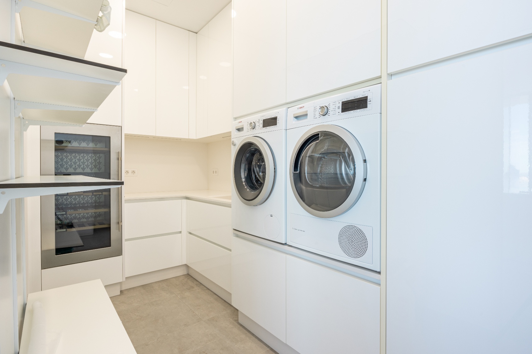 Een verdieping lager komt u bij de woonruimte, gekenmerkt door een ruime open woonkamer met hoge plafonds en een luxe Amerikaanse keuken met een wit keukeneiland. De apparaten, inclusief de plafondafzuigkap, zijn naadloos geïntegreerd met glas of metalen fronten, waardoor de schone en georganiseerde esthetiek behouden blijft.