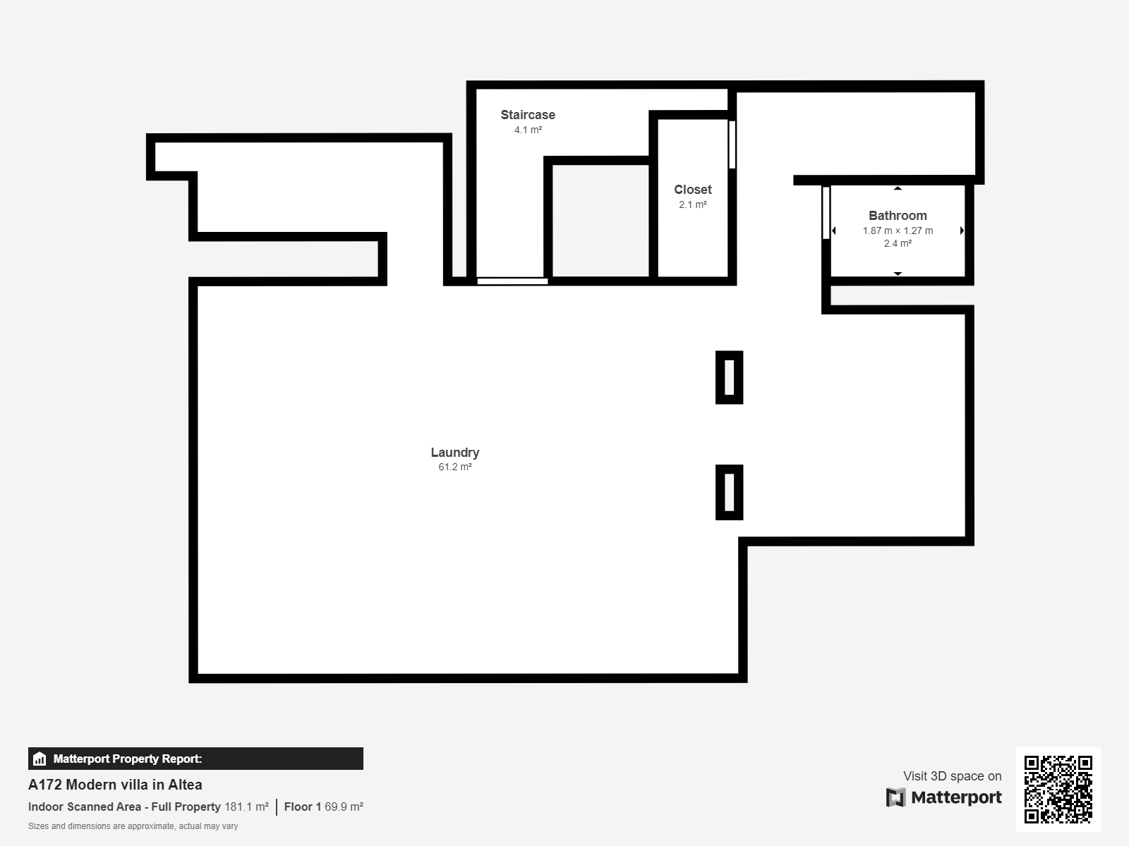 Bij binnenkomst biedt een grote garage met vloertotplafond ramen parkeergelegenheid voor een ruime auto, bereikbaar via een elektrische metalen poort. De woning is gelegen aan het einde van een privéoprit in een doodlopende straat, wat mogelijkheid biedt voor extra parkeerplaatsen. De garage is voorzien van ingebouwde opbergkasten en leidt naar een wasruimte met extra opbergruimte.