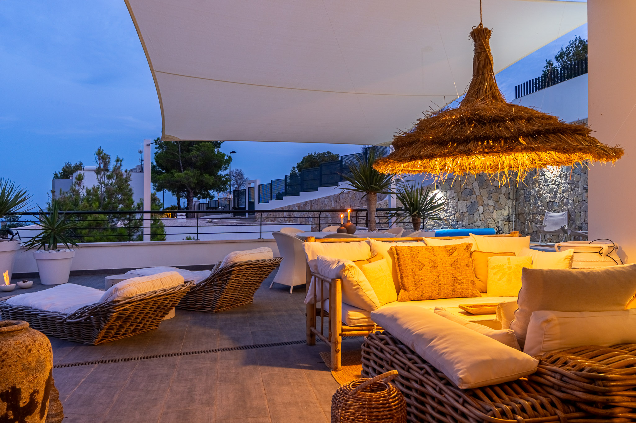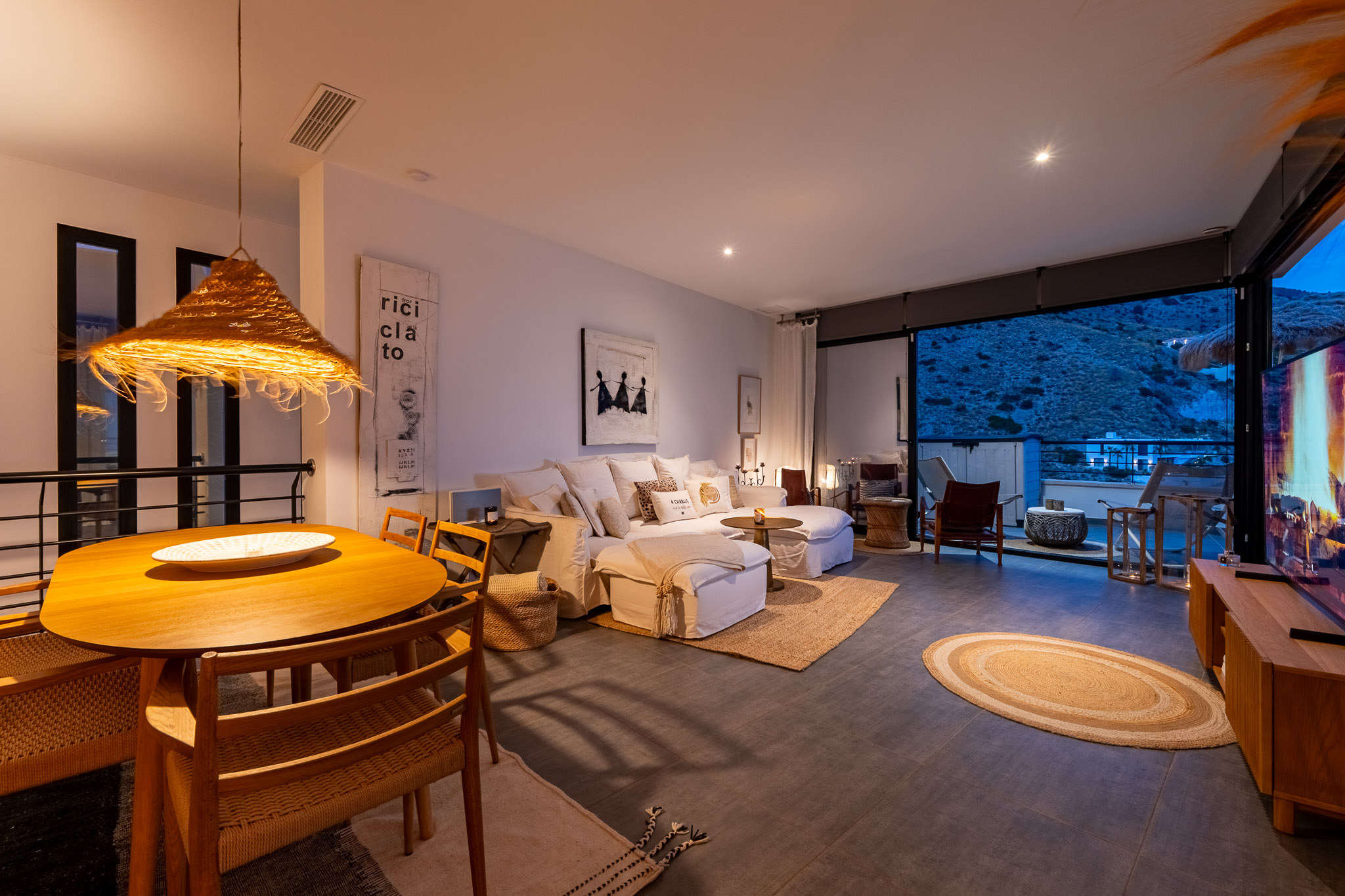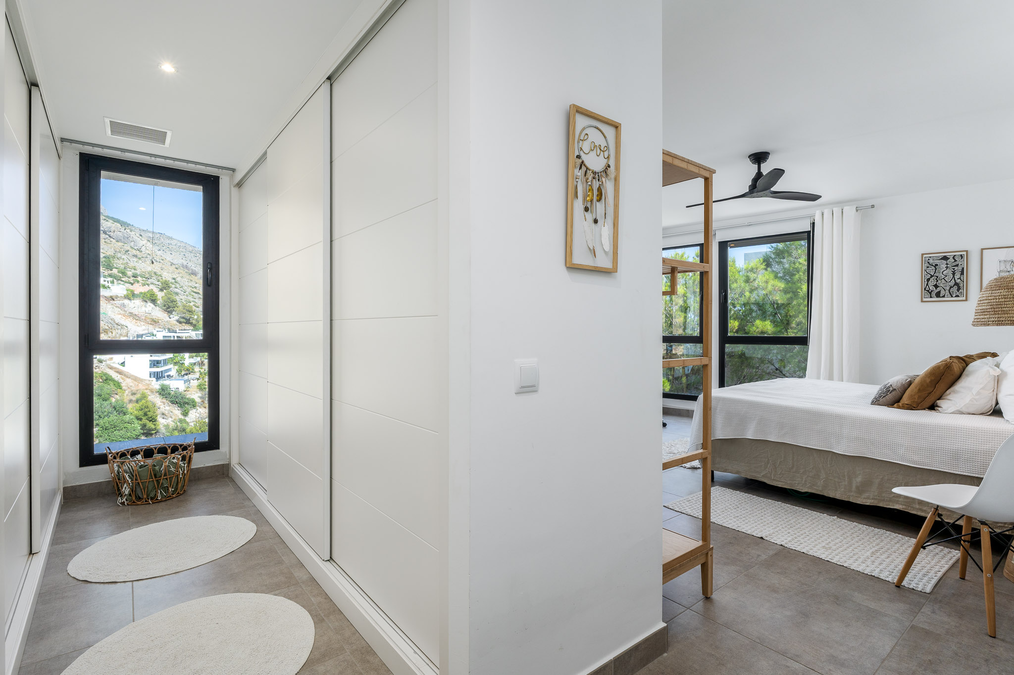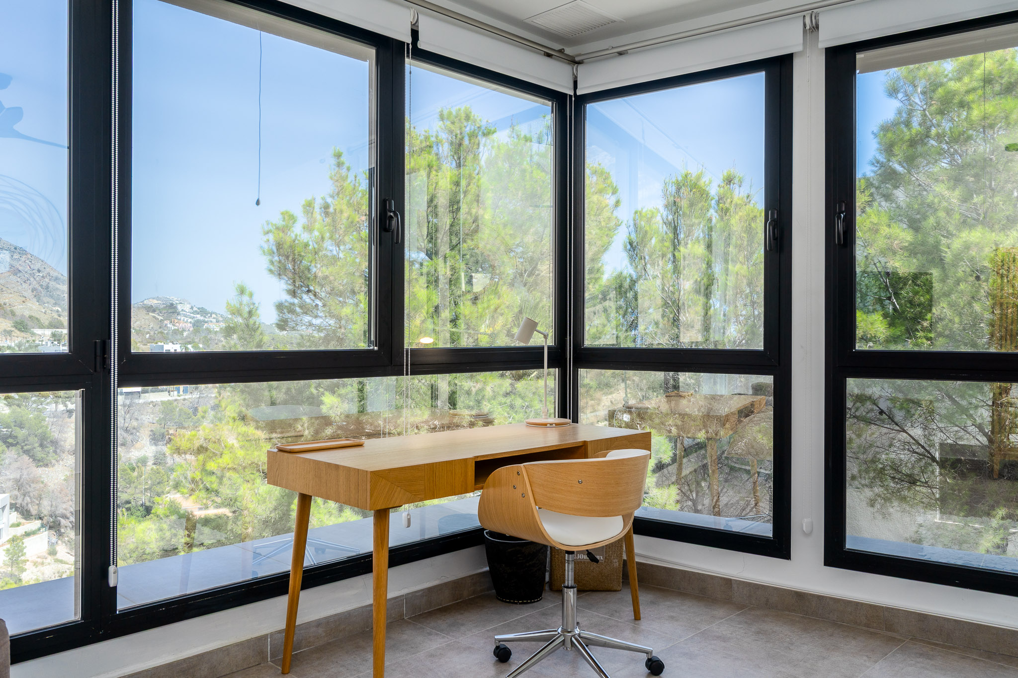 Beneden zijn er drie ruime slaapkamers, waaronder een master bedroom met een inloopkast en prachtig uitzicht. Alle drie de badkamers zijn modern, licht en bieden ook indrukwekkende uitzichten. Bovendien beschikt het huis over een handige wasruimte met een wasmachine, droger, toilet en douche.