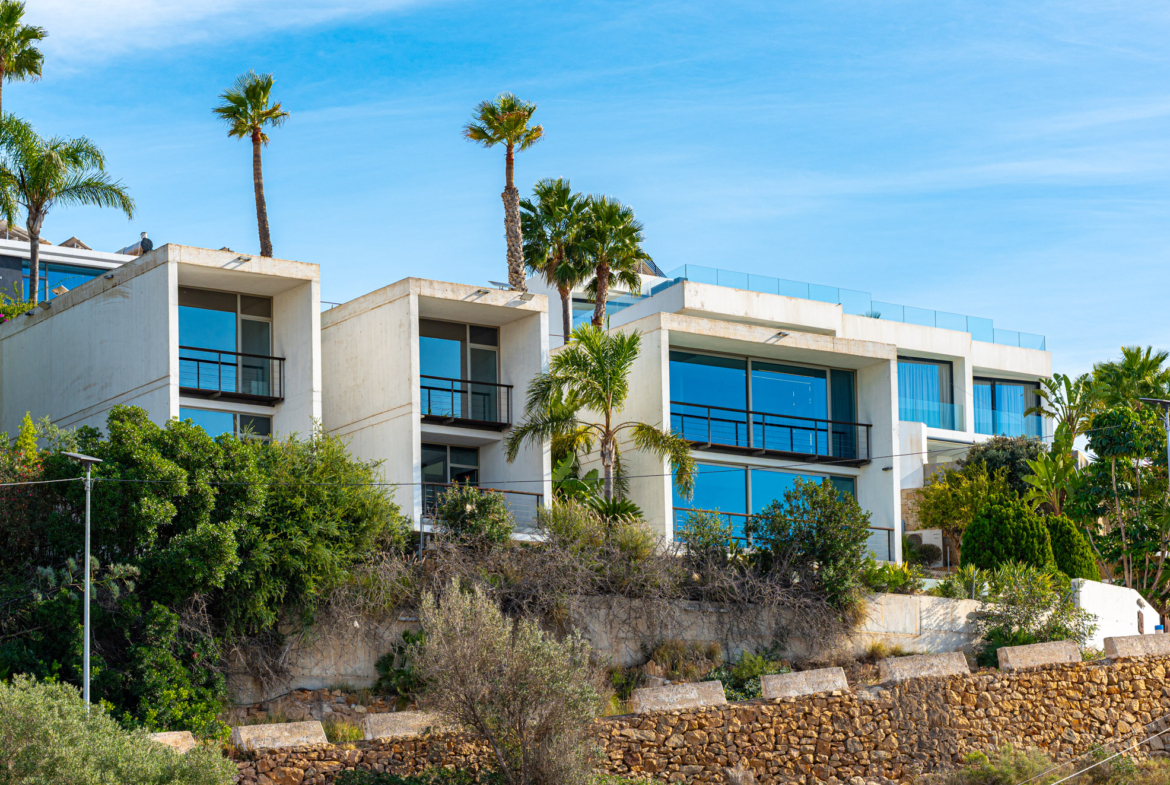 Over verschillende niveaus verspreid, beschikt het pand over vier prachtig ontworpen slaapkamers en vijf elegante badkamers. De master suite springt eruit als een privé toevluchtsoord, met vloertotplafondramen die het glinsterende Mediterrane landschap omlijsten, samen met een weelderige ensuite badkamer compleet met een vrijstaande whirlpool, regendouche en premium armaturen, een intieme spaachtige plek waar je kunt ontspannen met ongehinderd zeezicht.