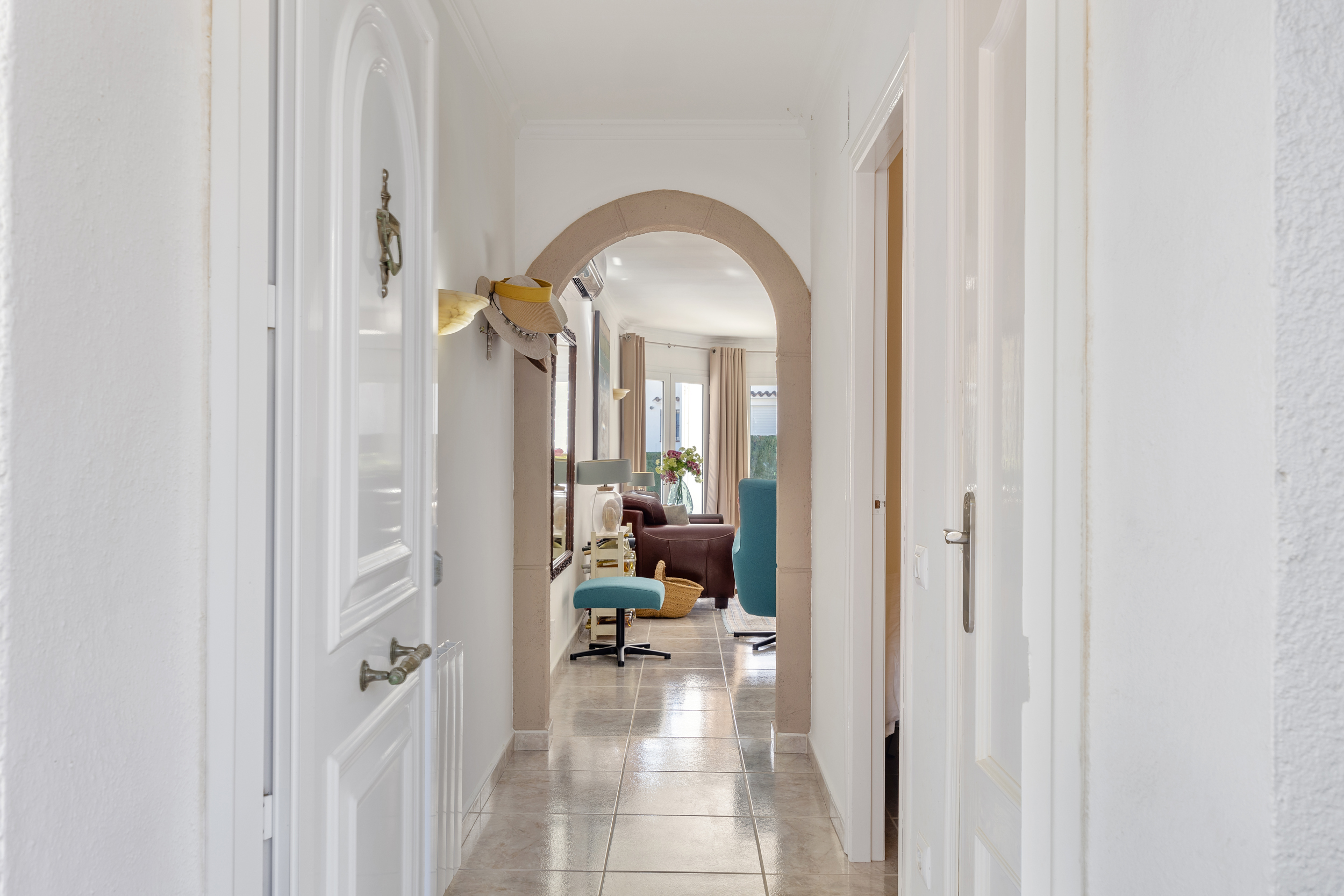 Buiten wacht het echte Mediterrane leven. Het zwembad nodigt uit tot verkoeling op warme dagen, terwijl de tuin dankzij het irrigatiesysteem en de sfeervolle buitenverlichting ook 's avonds een fijne plek blijft. Overdekte terrassen met ventilatoren zorgen voor schaduw en comfort, zelfs tijdens de warmste maanden.