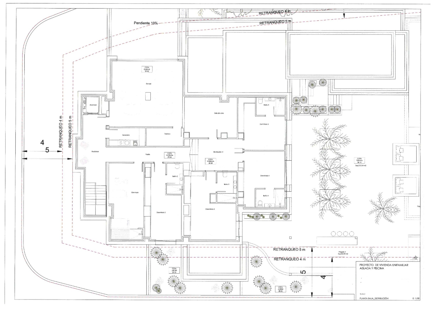 - Begane grond, deze verdieping is te bereiken middels een interne trap of middels een lift. Het is verdeeld in een kleine hal, een fitnessruimte, een wasruimte en een berging, een bioscoopzaal en 4 slaapkamers met en-suite badkamers. Op deze verdieping bevindt zich ook de garage met capaciteit voor 2 auto's.