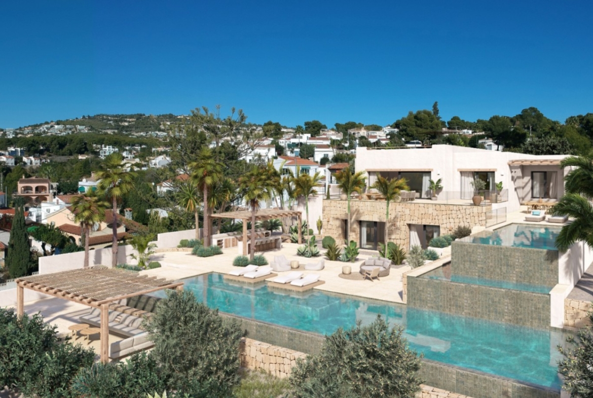 Luxe villa in aanbouw met zeezicht aan de kust van Benissa (Costa Blanca, Alicante). Deze villa in Ibiza-stijl met prachtig uitzicht op zee ligt op 400 meter van het strand van Fustera, restaurants en een supermarkt.