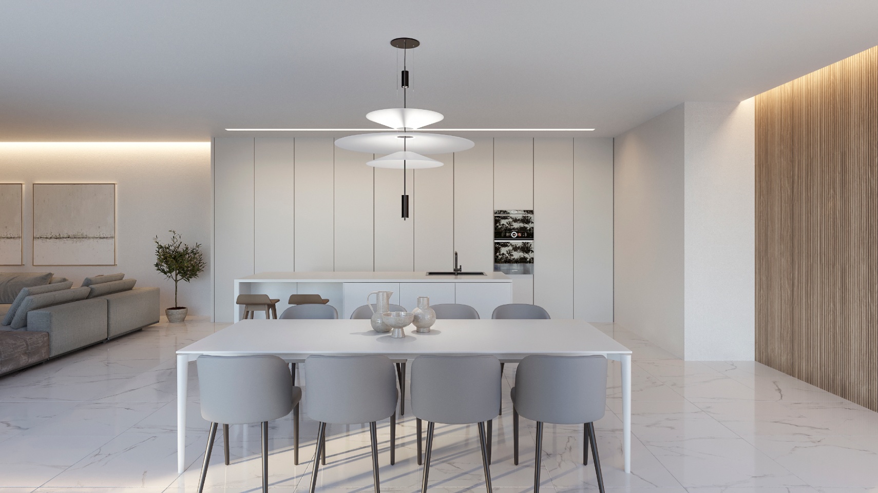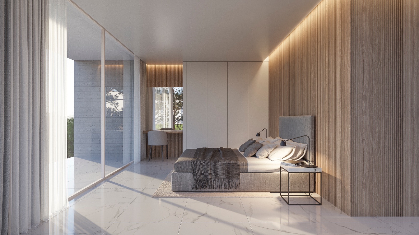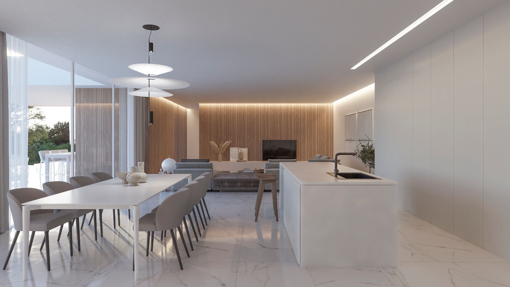 De villa beschikt over vier ruime slaapkamers en vier moderne badkamers. Het is uitgerust met airconditioning en centrale verwarming door het hele huis, wat zorgt voor comfort het hele jaar door. Een privégarage biedt plaats aan vier auto’s en heeft directe toegang tot de woning.