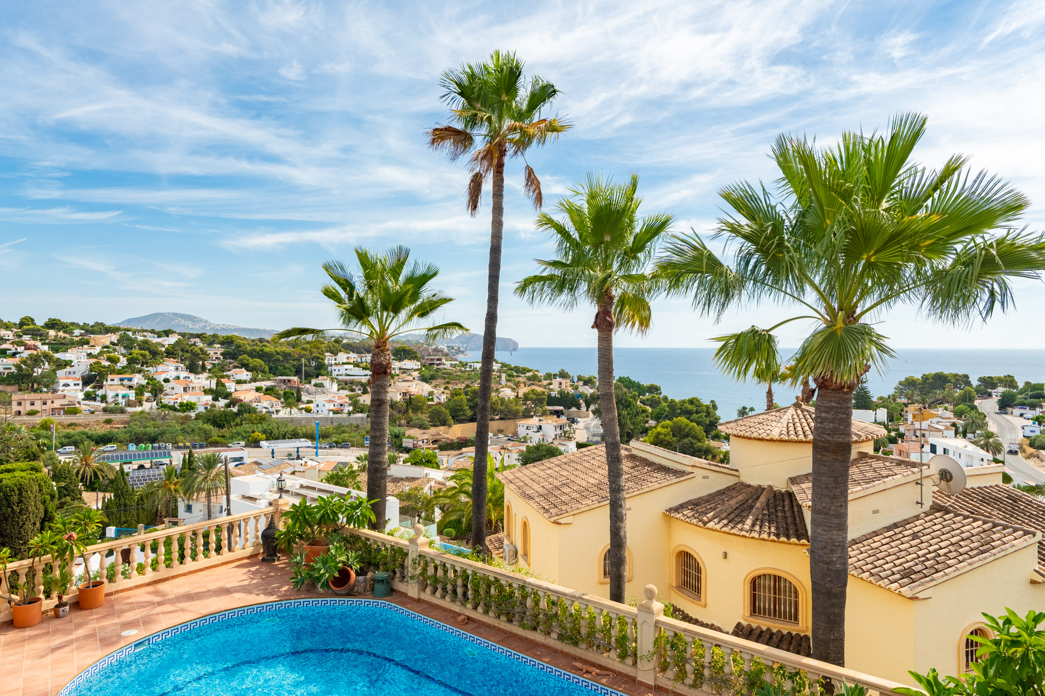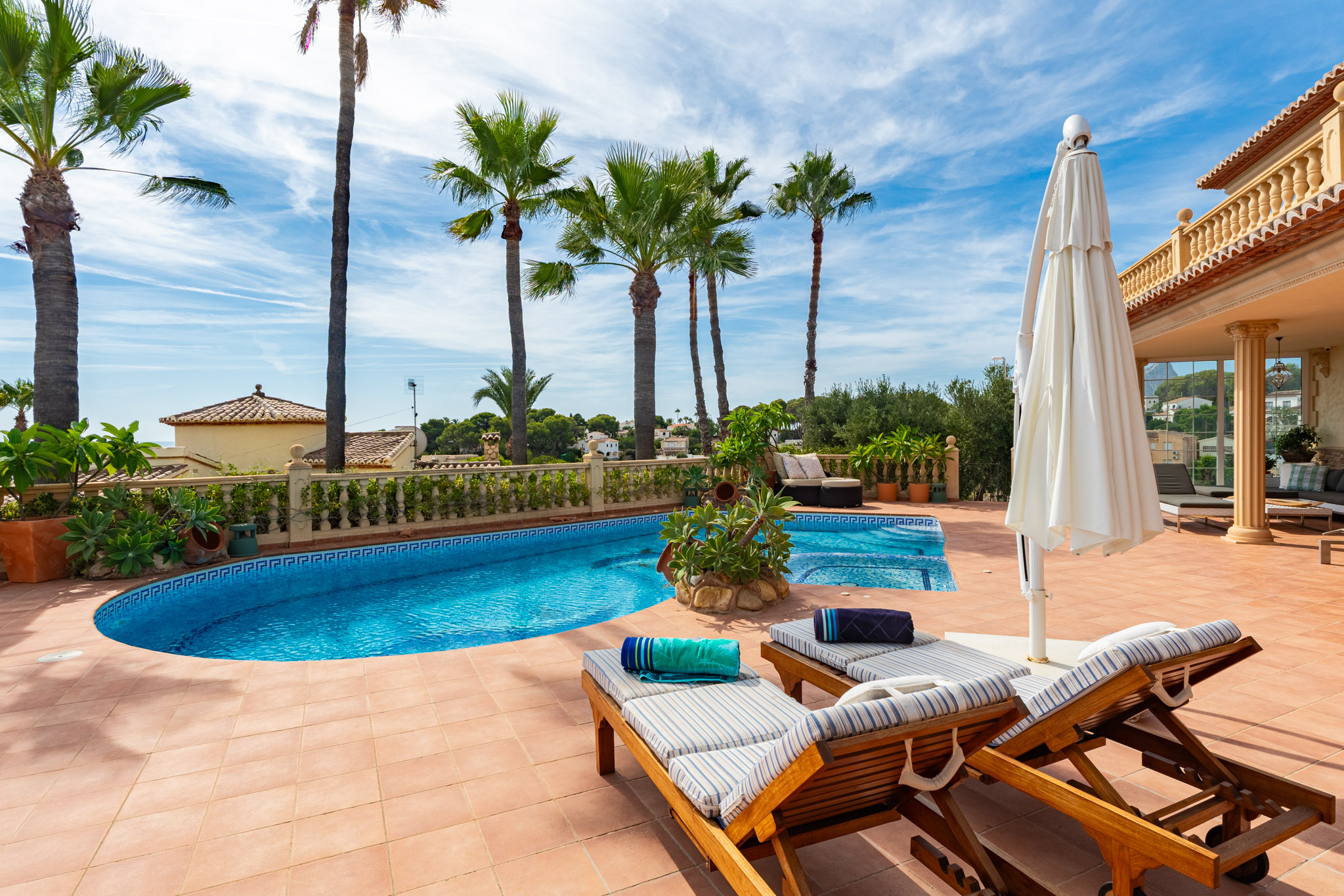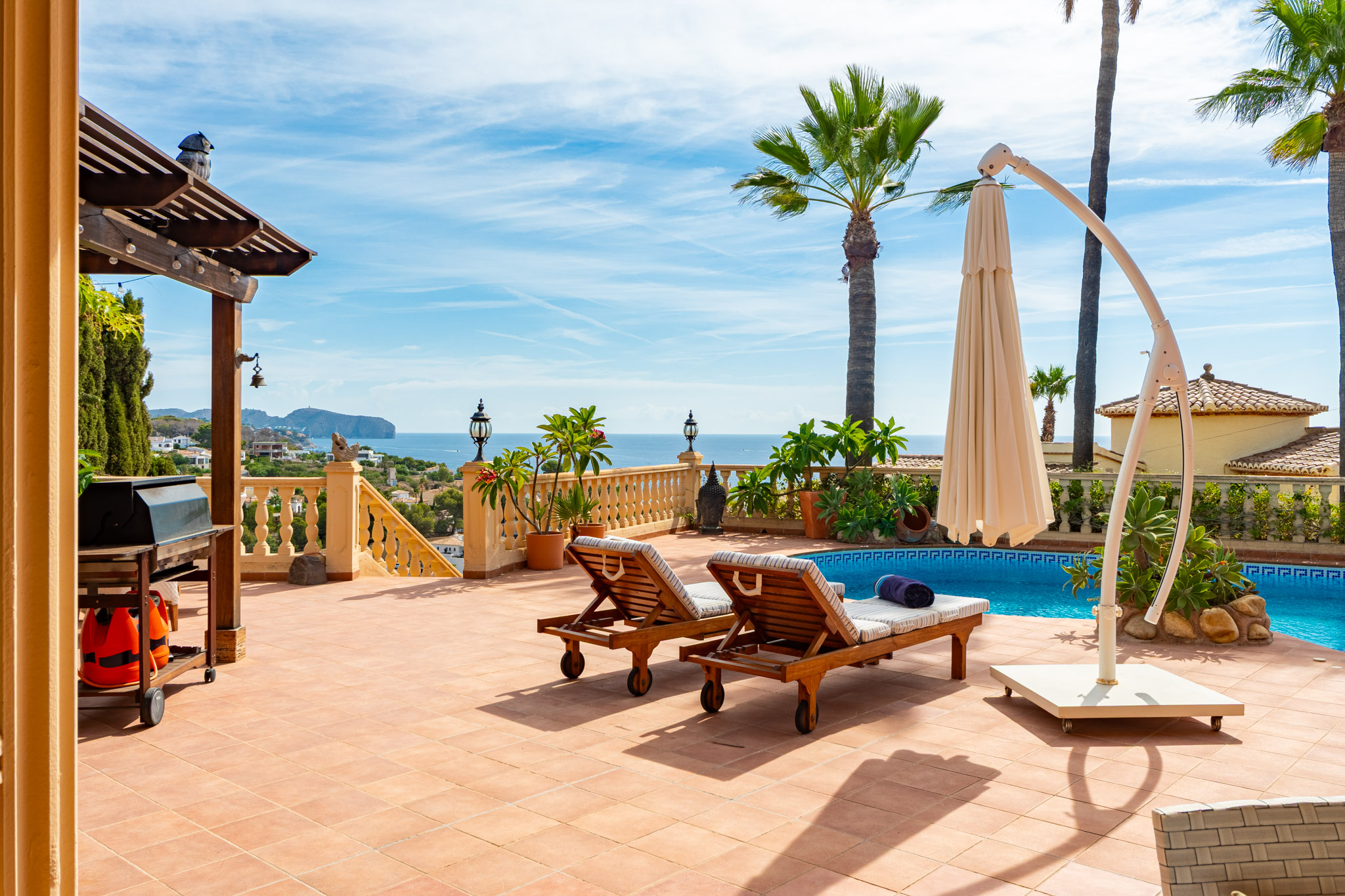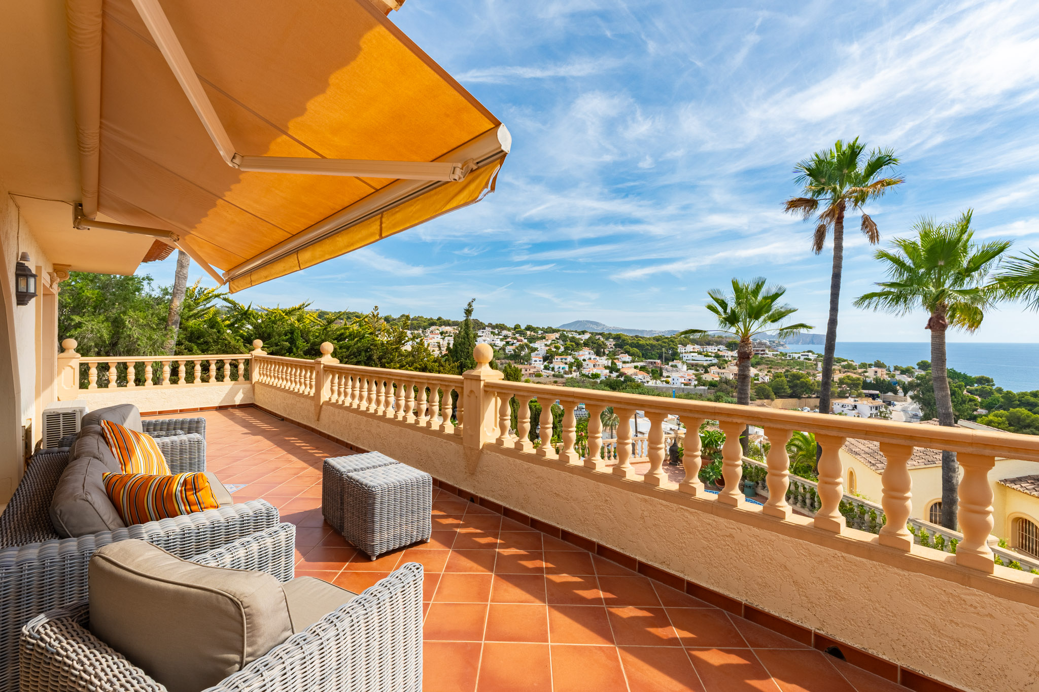 Verdieping boven biedt de villa drie extra slaapkamers en drie badkamers, inclusief een luxe mastersuite met een hydromassagebad. Dit niveau omvat ook een aparte TVlounge en een panoramisch terras dat een weids uitzicht van 180 graden biedt, van Moraira tot de iconische Peñón de Ifach van Calpe.