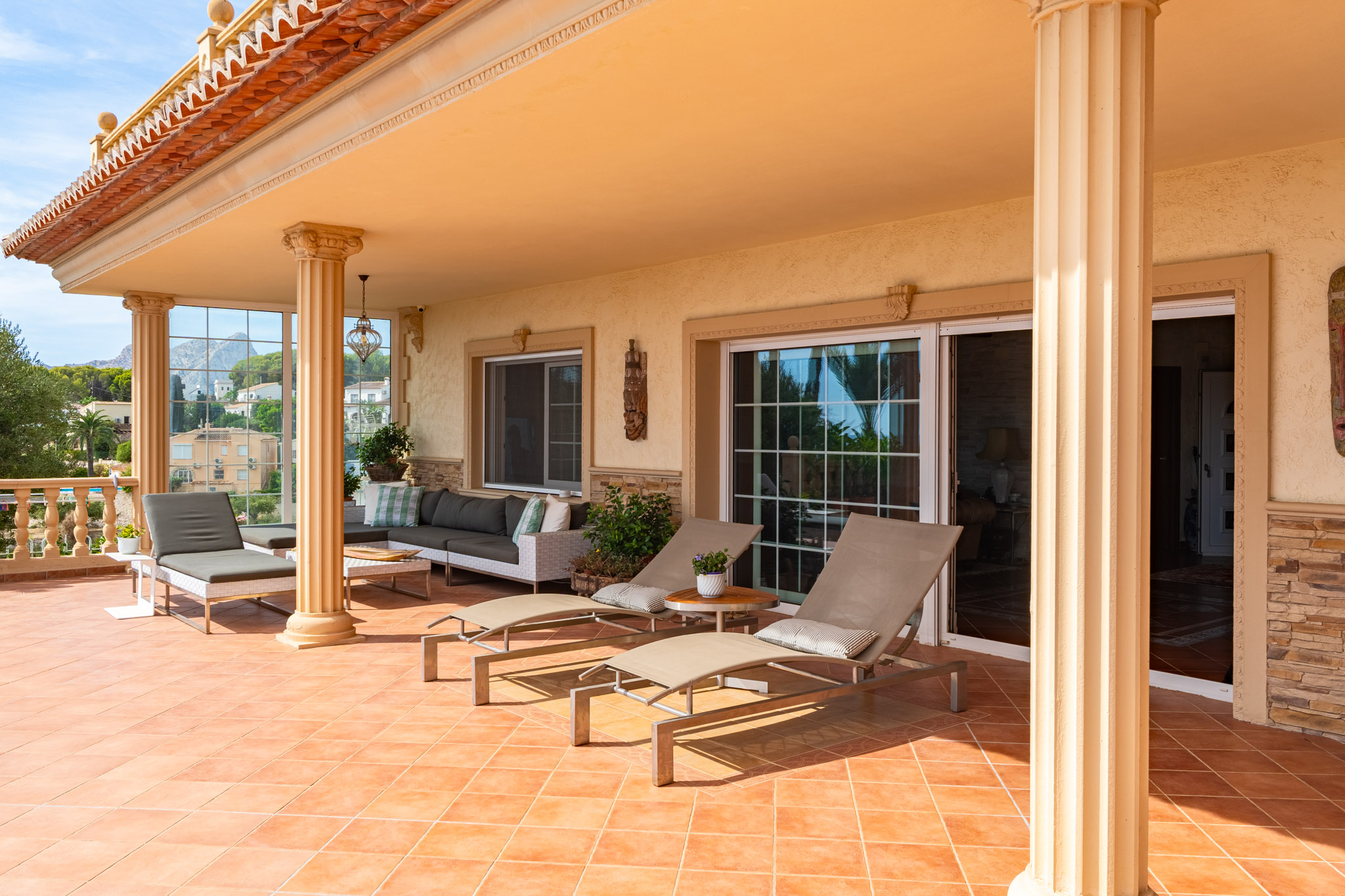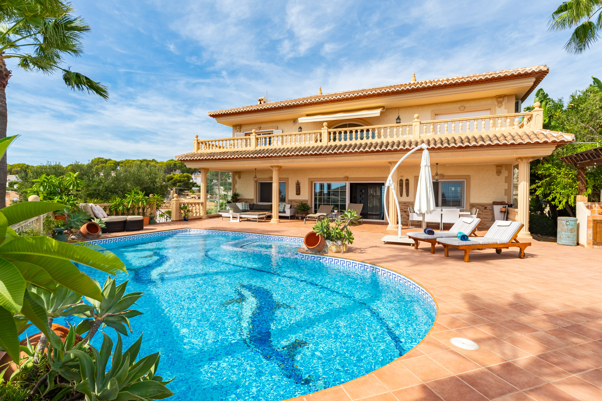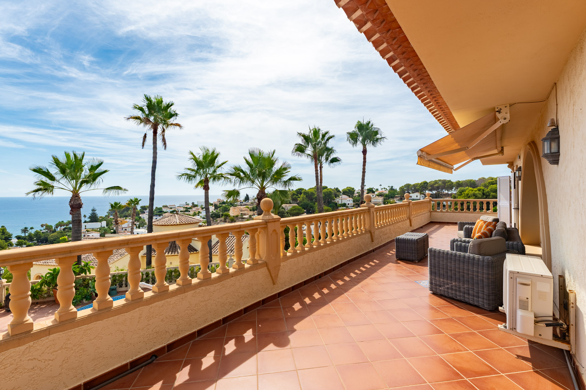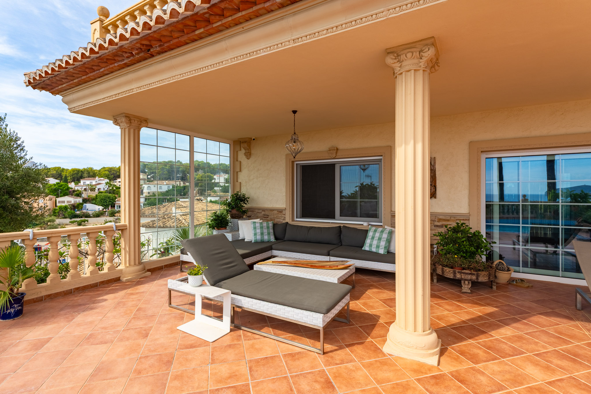 Verdieping boven biedt de villa drie extra slaapkamers en drie badkamers, inclusief een luxe mastersuite met een hydromassagebad. Dit niveau omvat ook een aparte TVlounge en een panoramisch terras dat een weids uitzicht van 180 graden biedt, van Moraira tot de iconische Peñón de Ifach van Calpe.