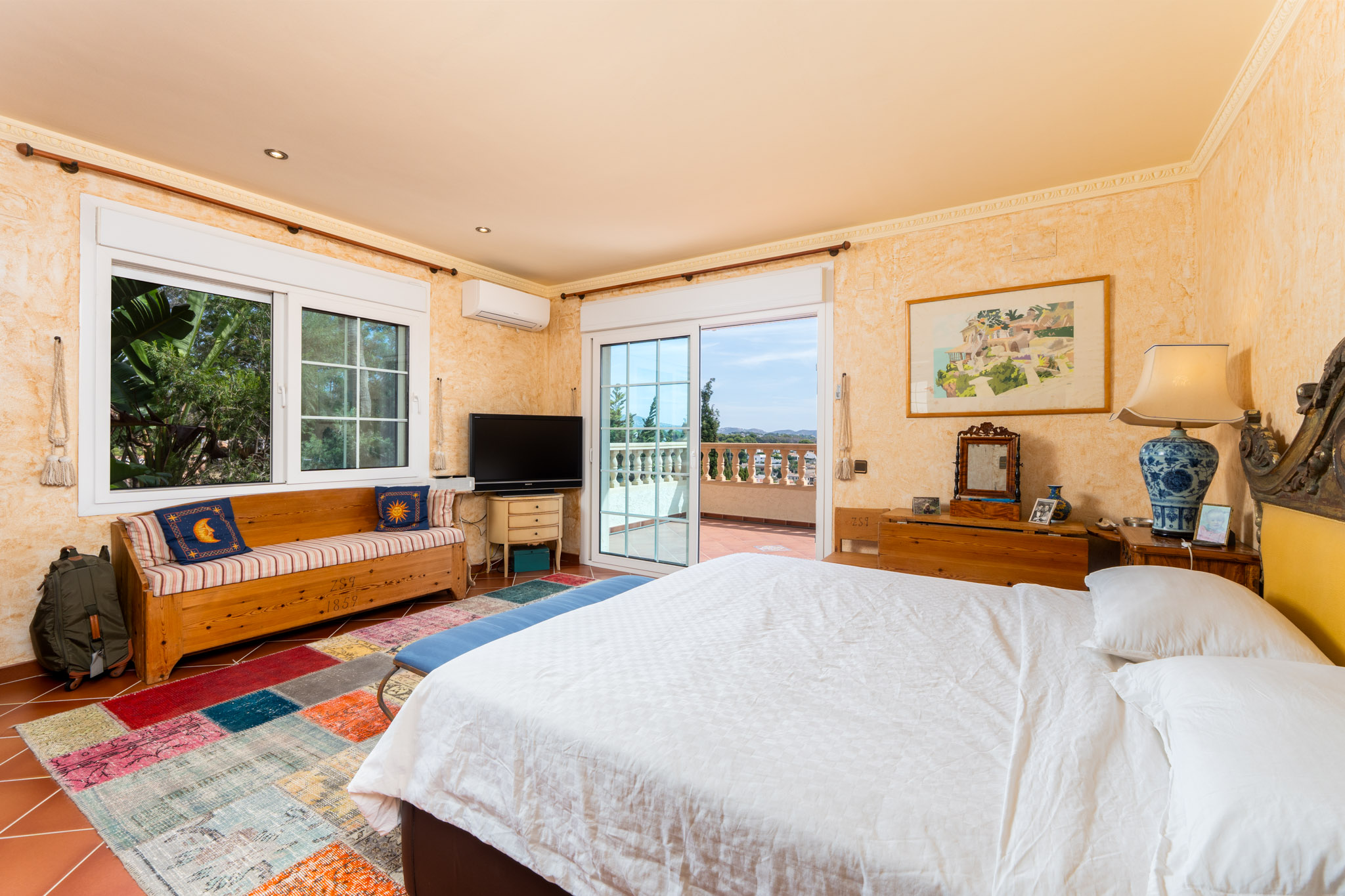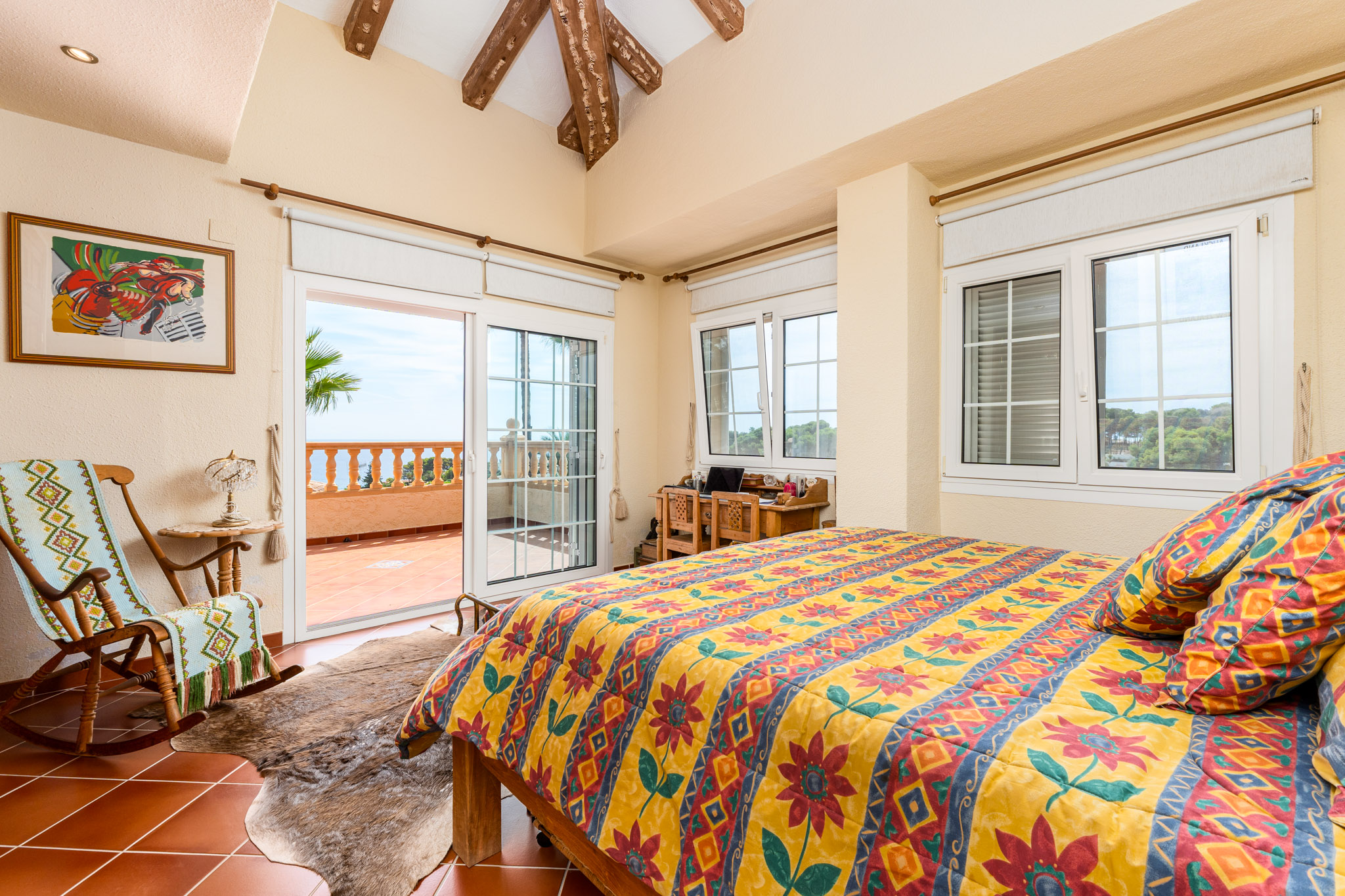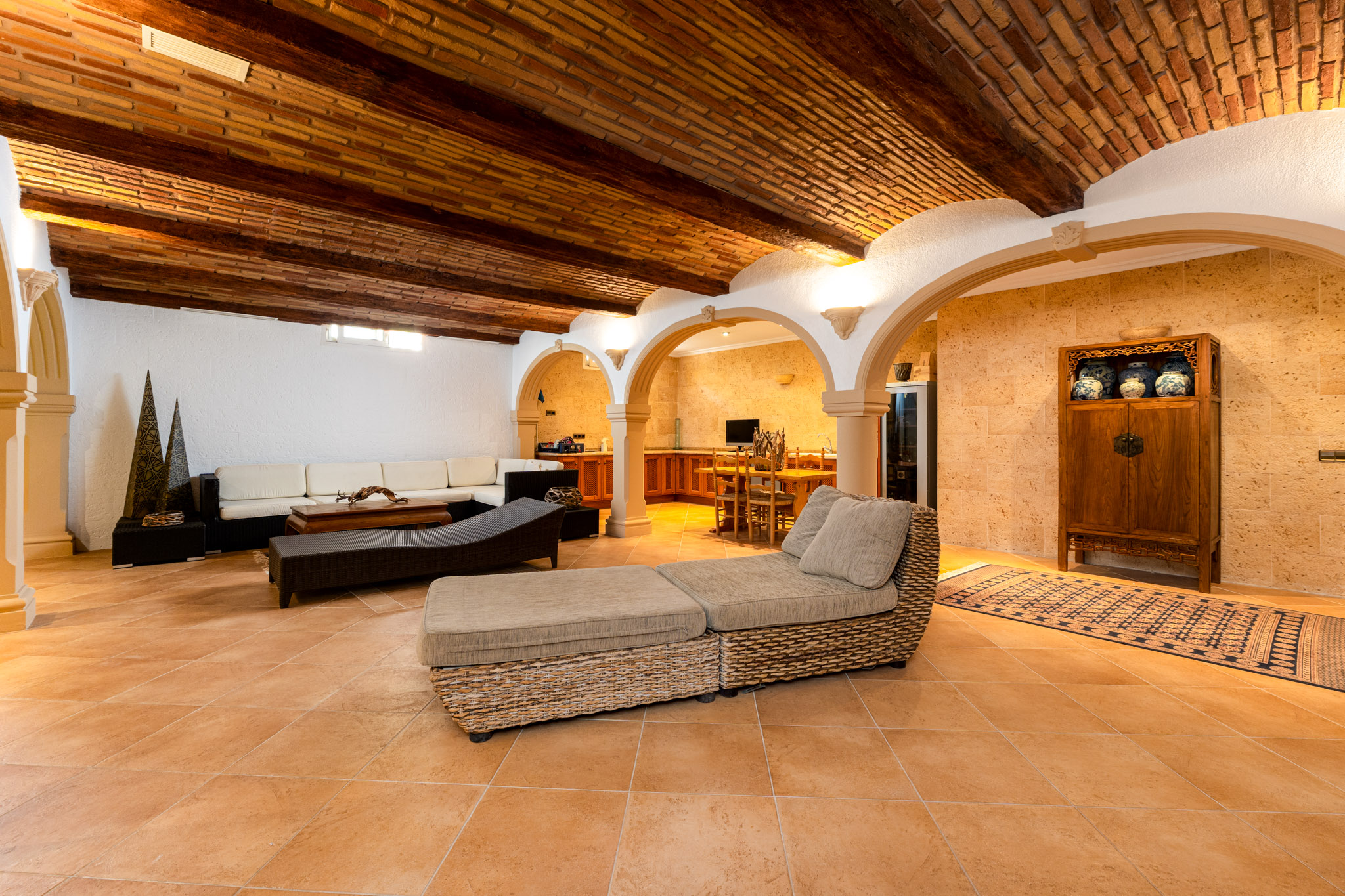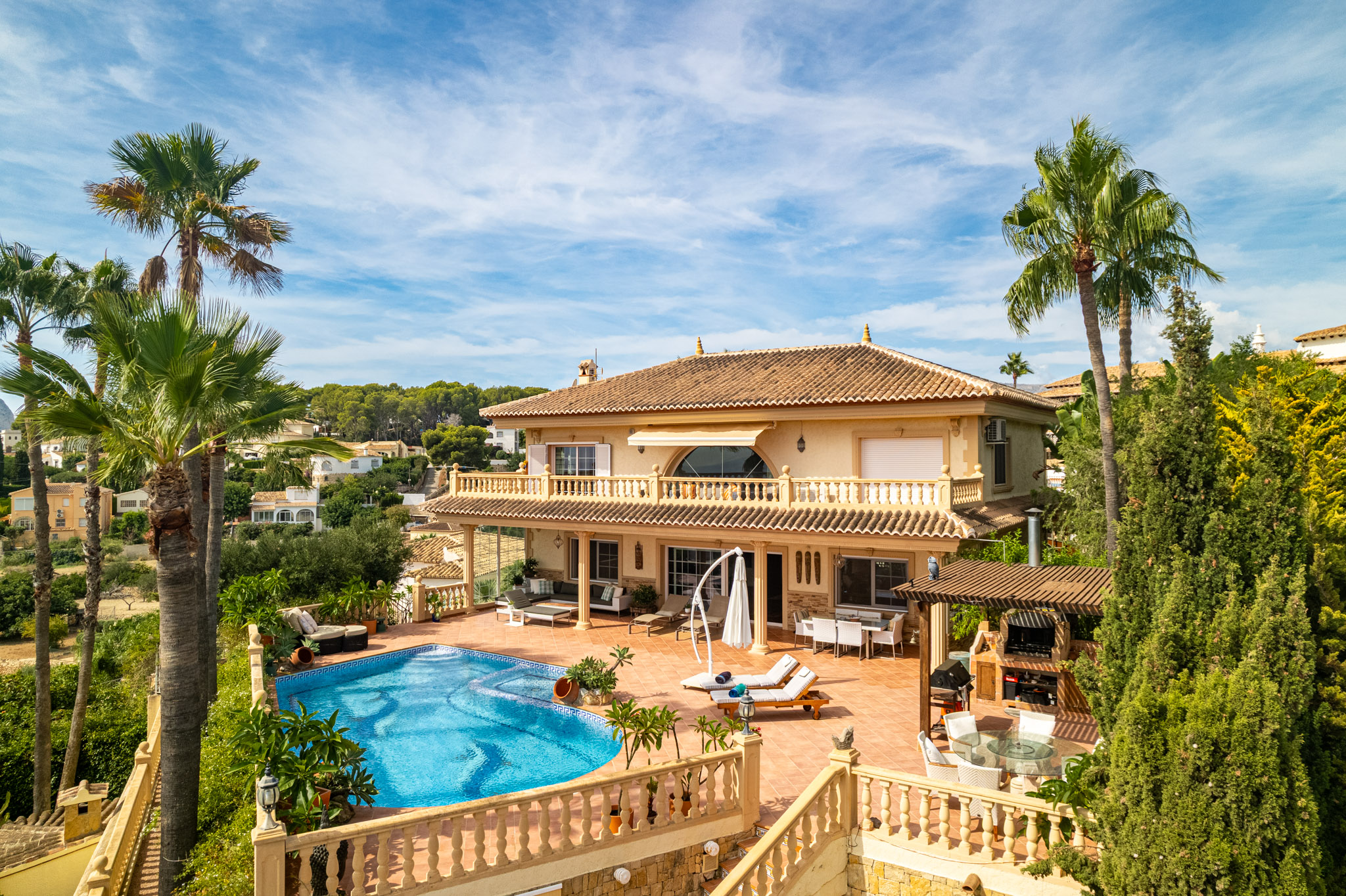 Verdieping boven biedt de villa drie extra slaapkamers en drie badkamers, inclusief een luxe mastersuite met een hydromassagebad. Dit niveau omvat ook een aparte TVlounge en een panoramisch terras dat een weids uitzicht van 180 graden biedt, van Moraira tot de iconische Peñón de Ifach van Calpe.
