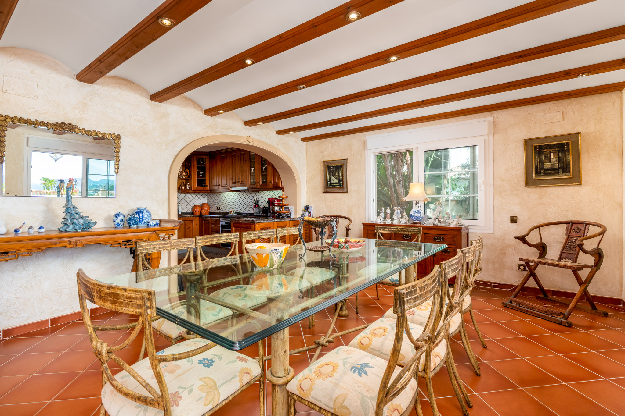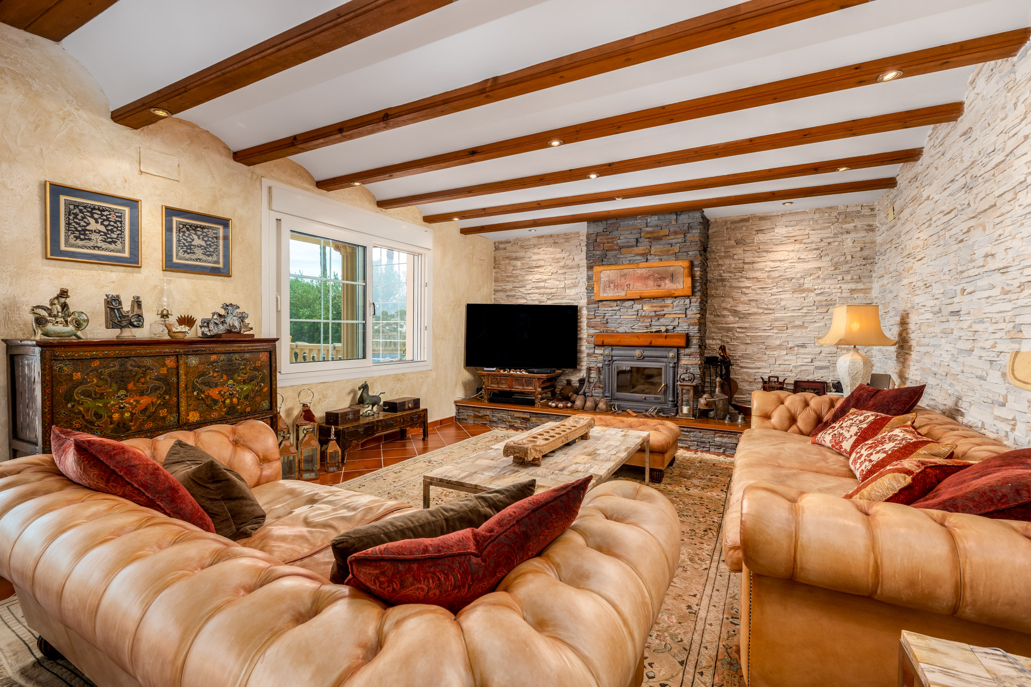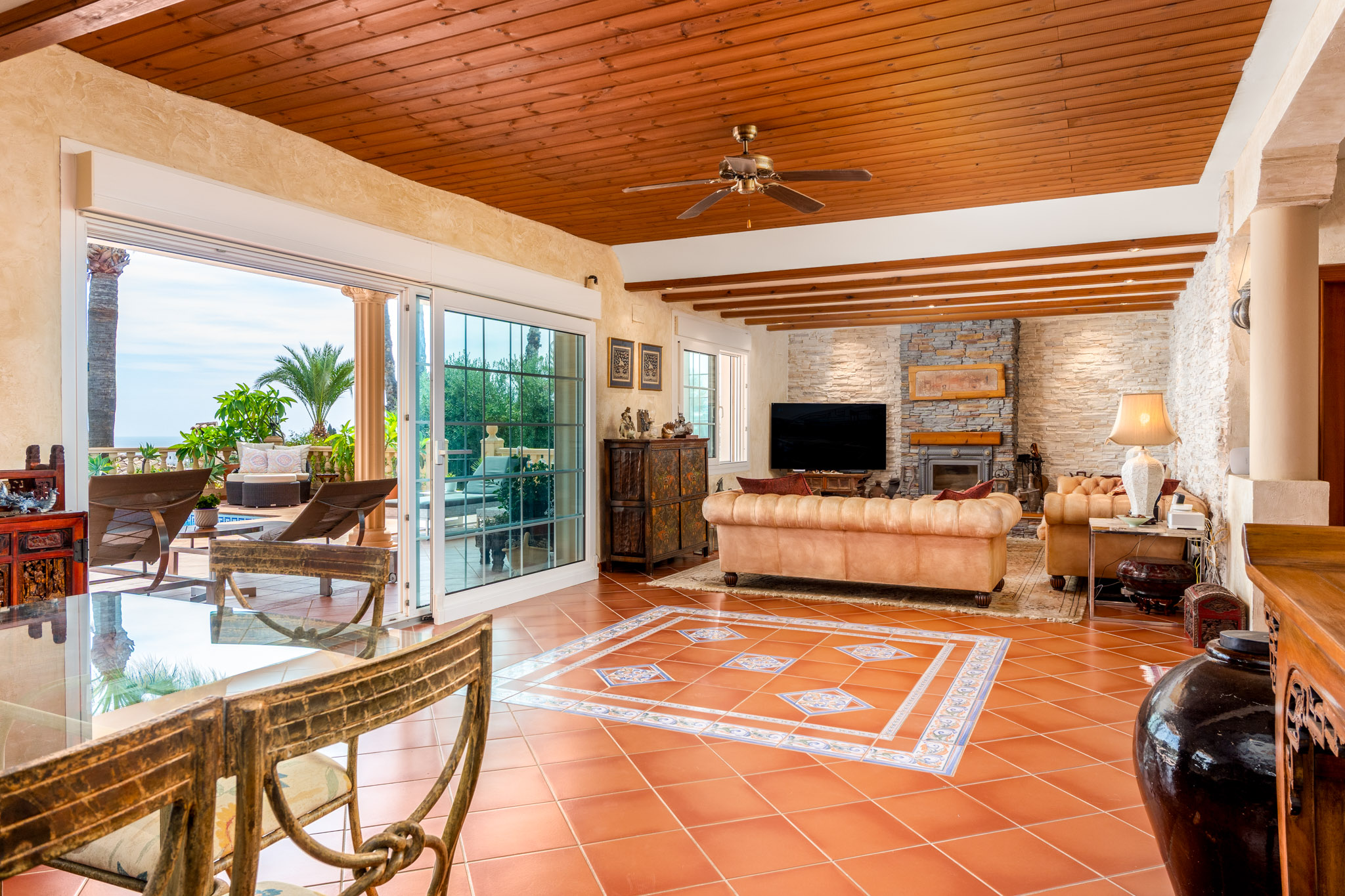 De villa is verdeeld over twee hoofdverdiepingen plus een semibegane grond, doordacht ontworpen om zowel functionaliteit als elegantie te bieden. De hoofdentree komt uit in een gastvrije hal met een trap die alle niveaus verbindt. Op de begane grond bevindt zich een lichte slaapkamer, een badkamer, een ruime open keuken en een comfortabele wooneetruimte met open haard. Zowel de keuken als de woonkamer komen direct uit op een groot terras met een zoutwaterzwembad, een zomerkeuken, een barbecuegebied, een pergola en een overdekte porch—allemaal met een prachtig uitzicht op de Middellandse Zee.