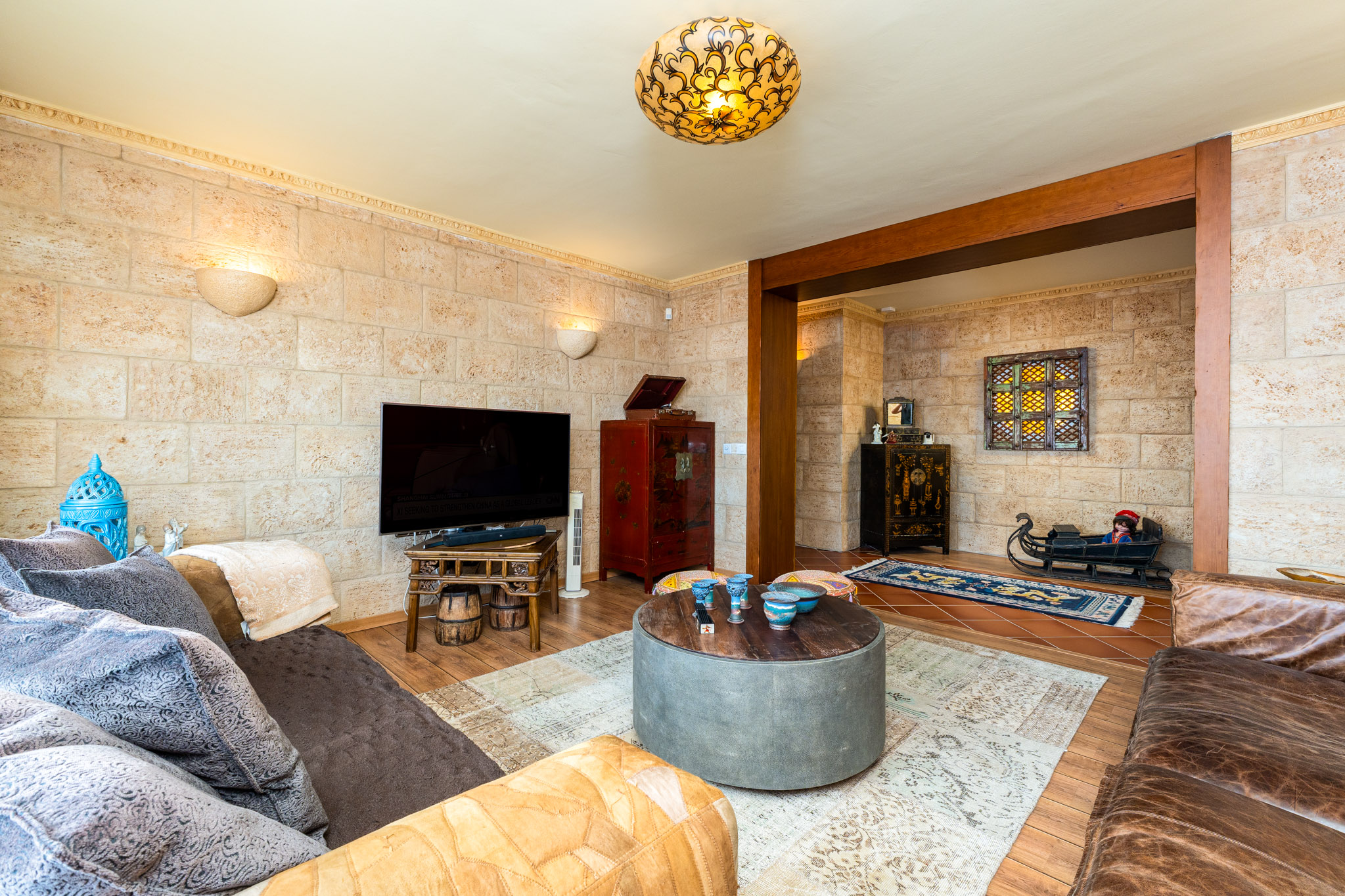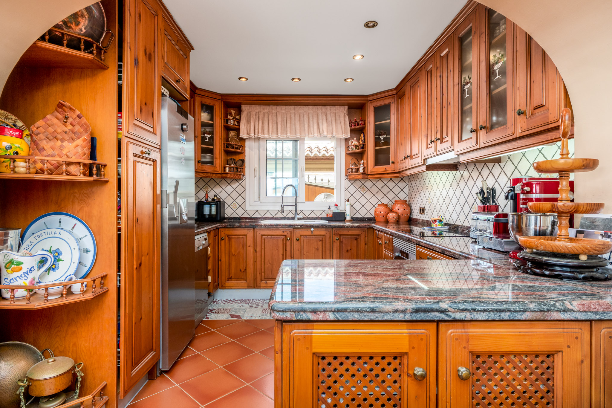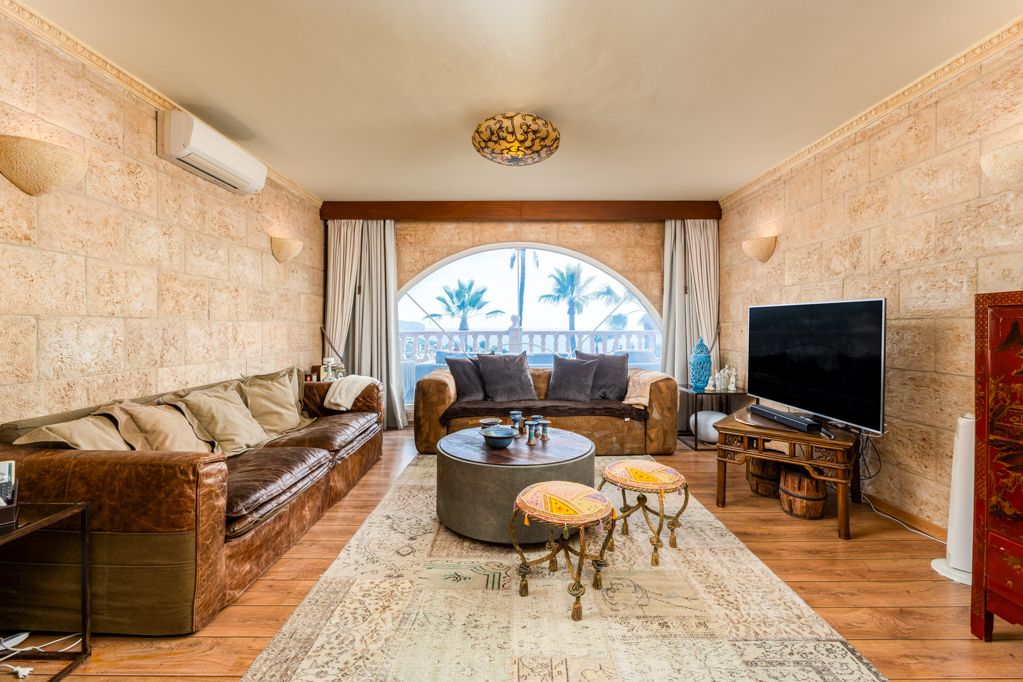 De villa is verdeeld over twee hoofdverdiepingen plus een semibegane grond, doordacht ontworpen om zowel functionaliteit als elegantie te bieden. De hoofdentree komt uit in een gastvrije hal met een trap die alle niveaus verbindt. Op de begane grond bevindt zich een lichte slaapkamer, een badkamer, een ruime open keuken en een comfortabele wooneetruimte met open haard. Zowel de keuken als de woonkamer komen direct uit op een groot terras met een zoutwaterzwembad, een zomerkeuken, een barbecuegebied, een pergola en een overdekte porch—allemaal met een prachtig uitzicht op de Middellandse Zee.