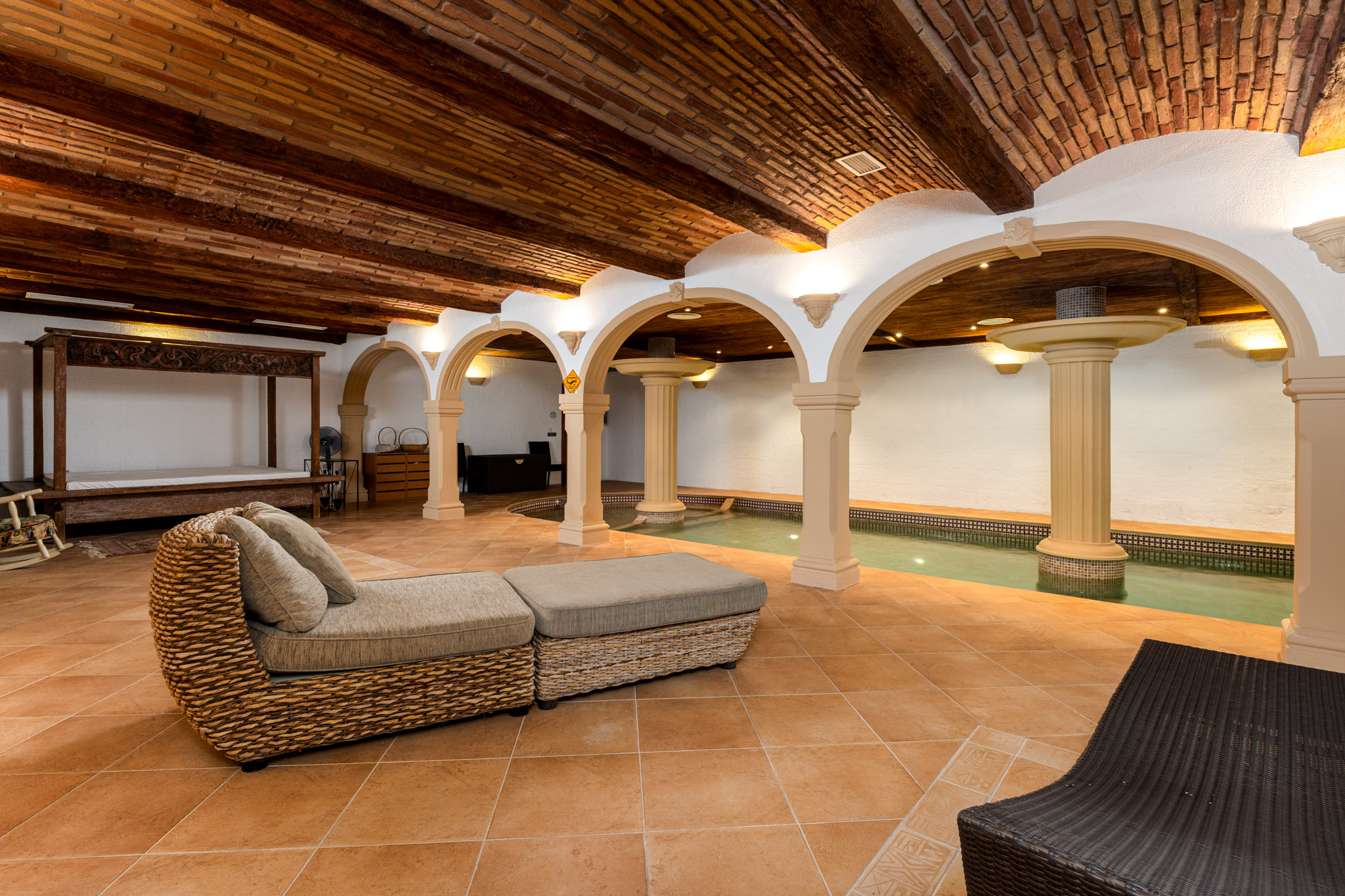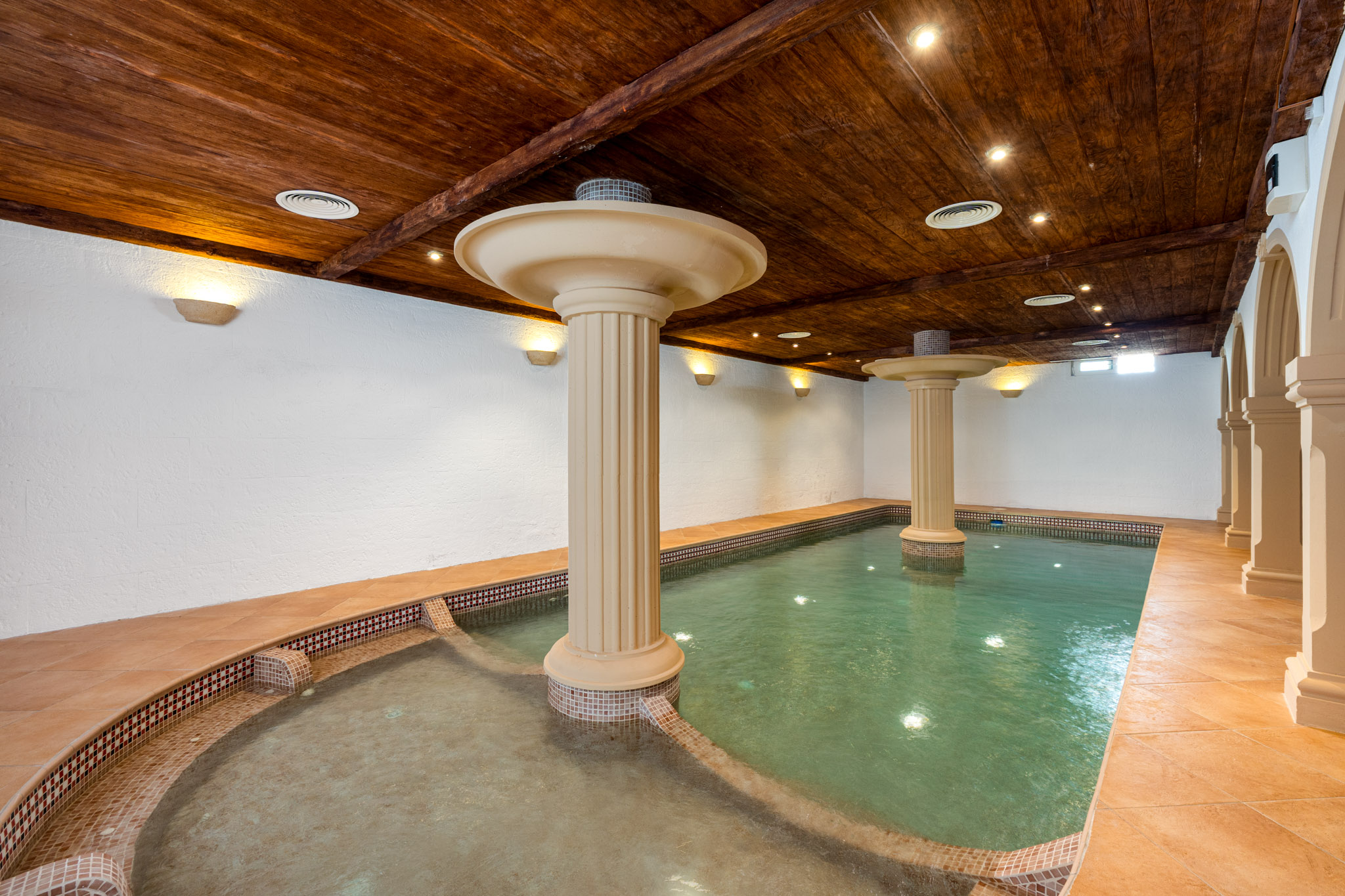 De omliggende tuin is onderhoudsarm en uitgerust met automatische irrigatie. De villa is afgewerkt volgens hoge standaarden, inclusief PVCramen, elektrische rolluiken, horren, airconditioning met warmtepomp, vloerverwarming, een industriële ontvochtiger voor het binnenzwembad, een waterverzachter, gas en watertanks, en internet en televisieaansluitingen.