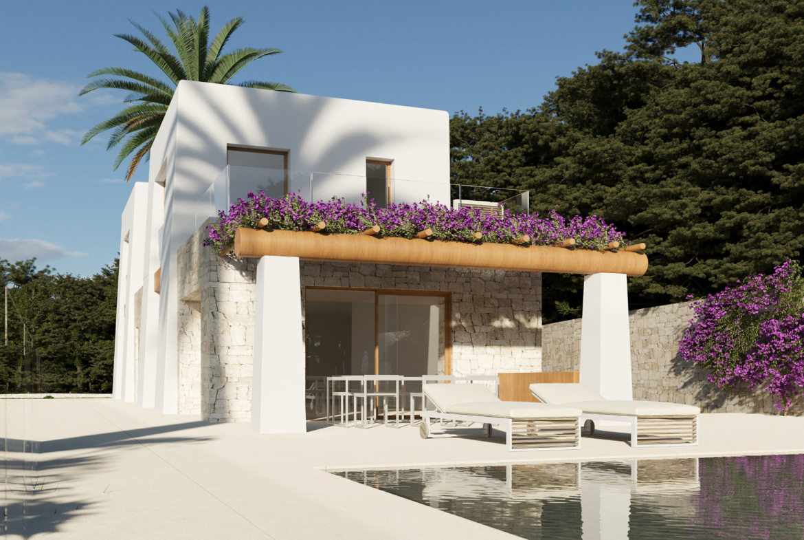 Dit is een nieuw project te koop, een villa op Ibiza met panoramisch zeezicht.