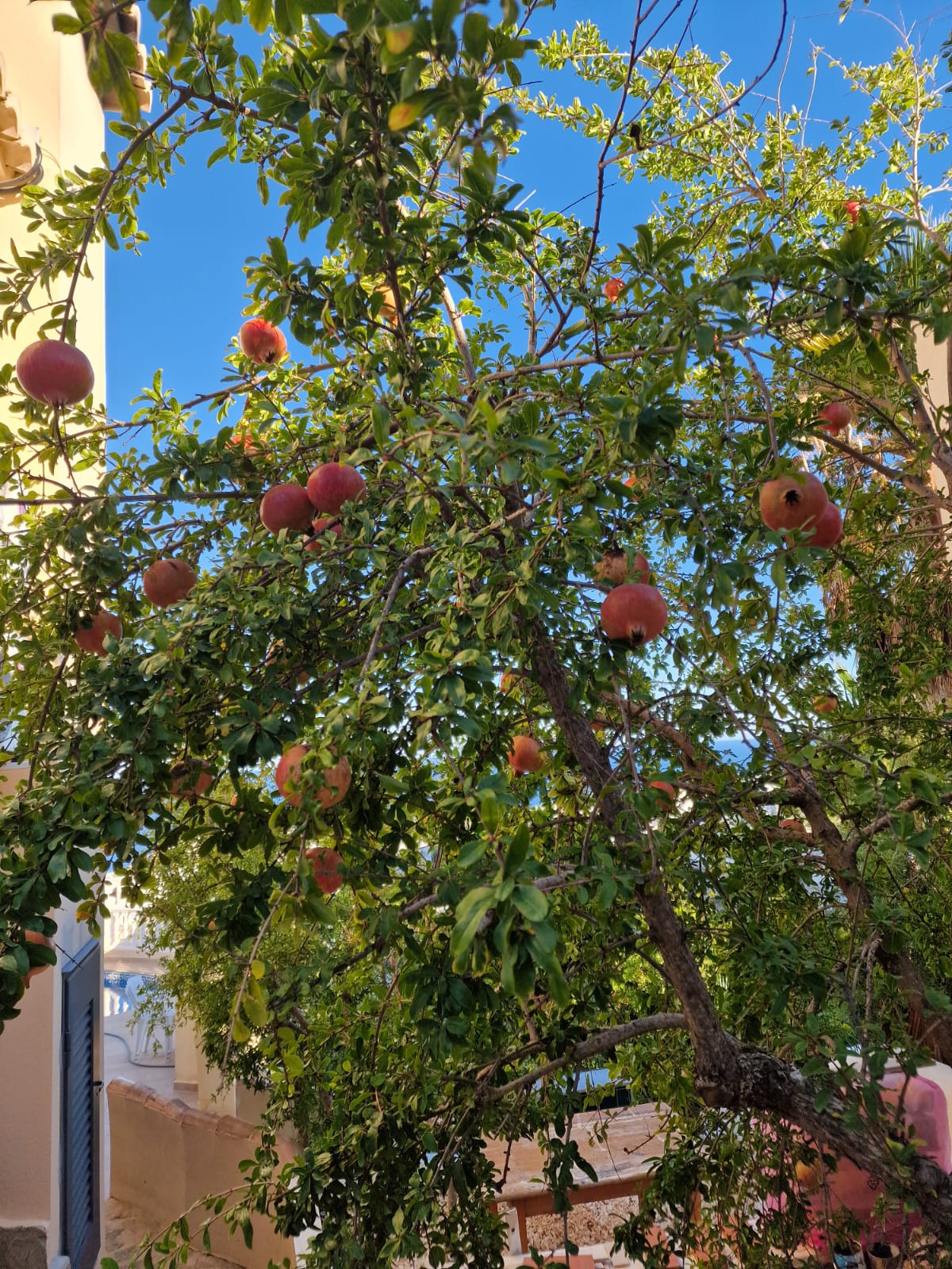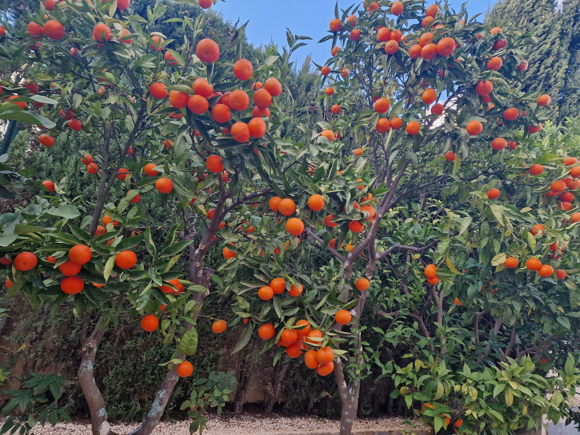 De voortuin biedt een charmante verscheidenheid aan citrusbomen, wat een mediterraan tintje geeft aan deze elegante woning.