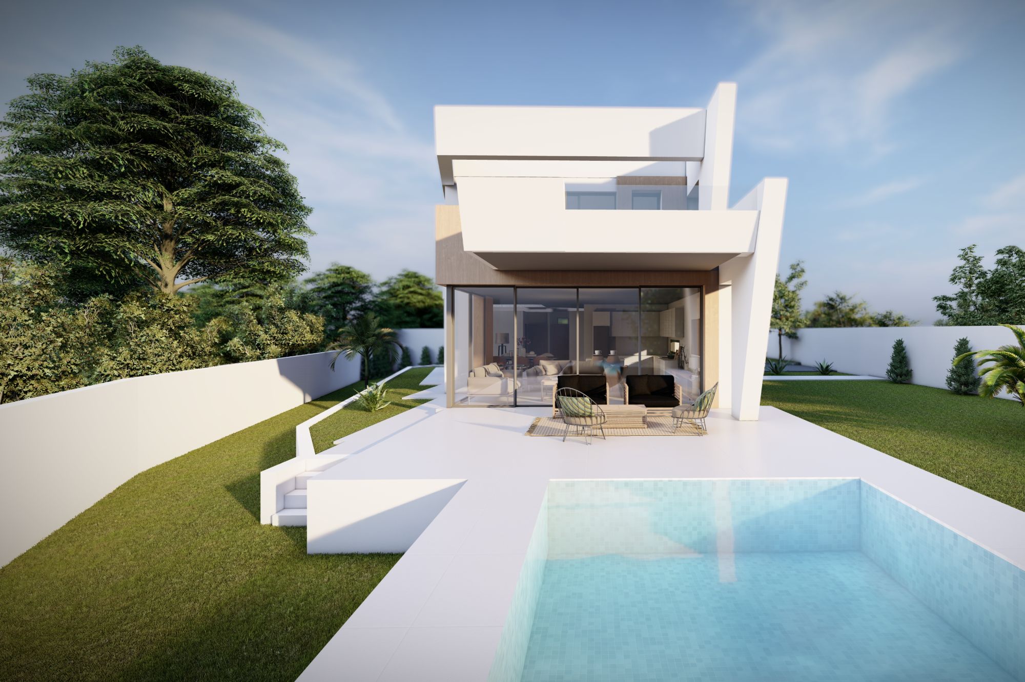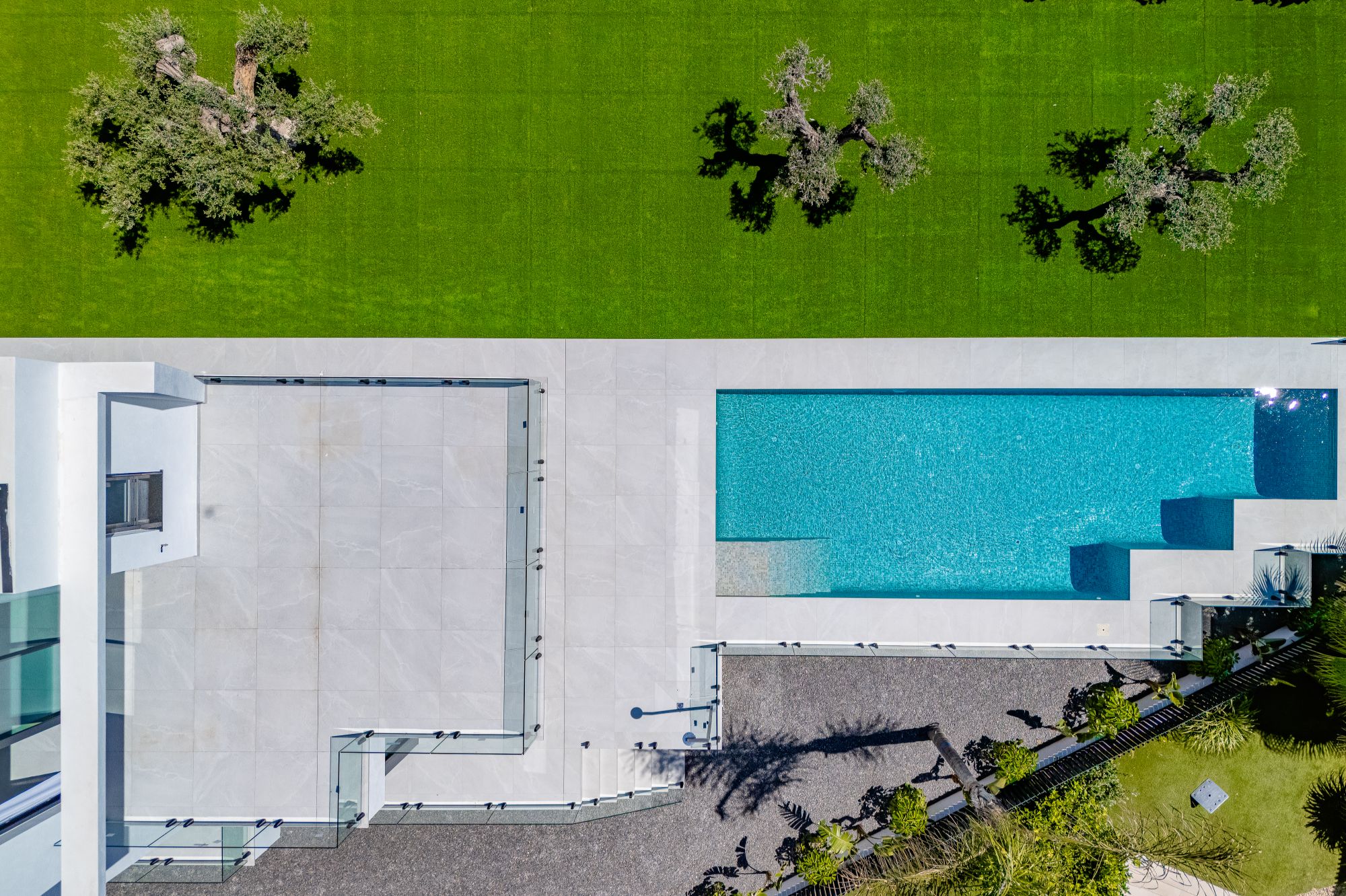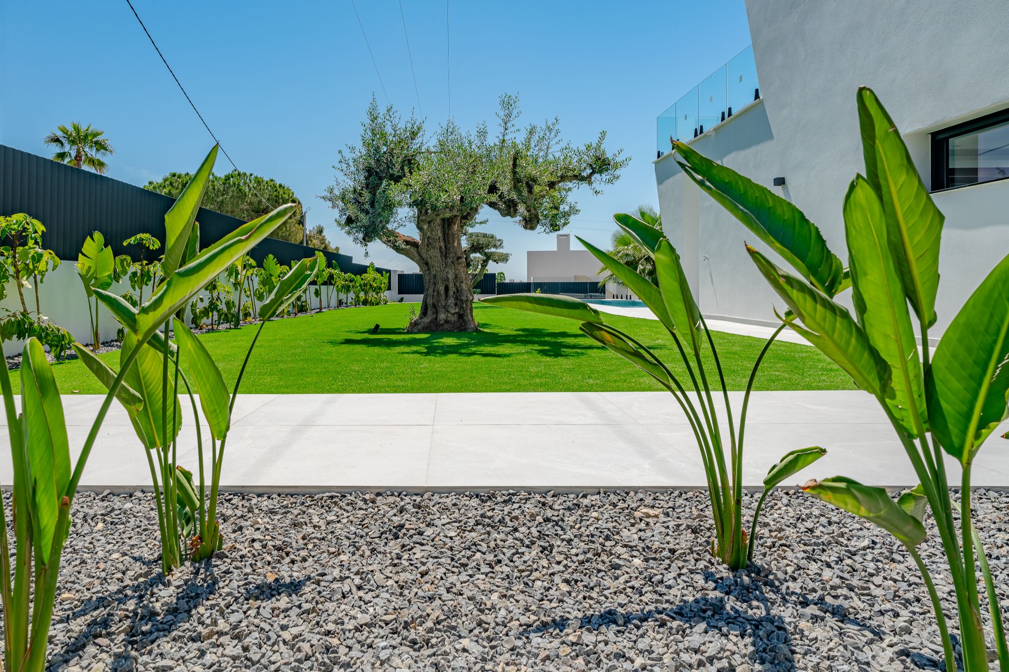 In het hart van het huis trekt een aangelegde patio, omgeven door een glazen façade, zonlicht naar elke hoek, waardoor een heldere en luchtige sfeer wordt gecreëerd op beide niveaus. De opvallende trap introduceert een dramatische dubbele hoogte ruimte, wat het open en uitnodigende gevoel van de woning versterkt.