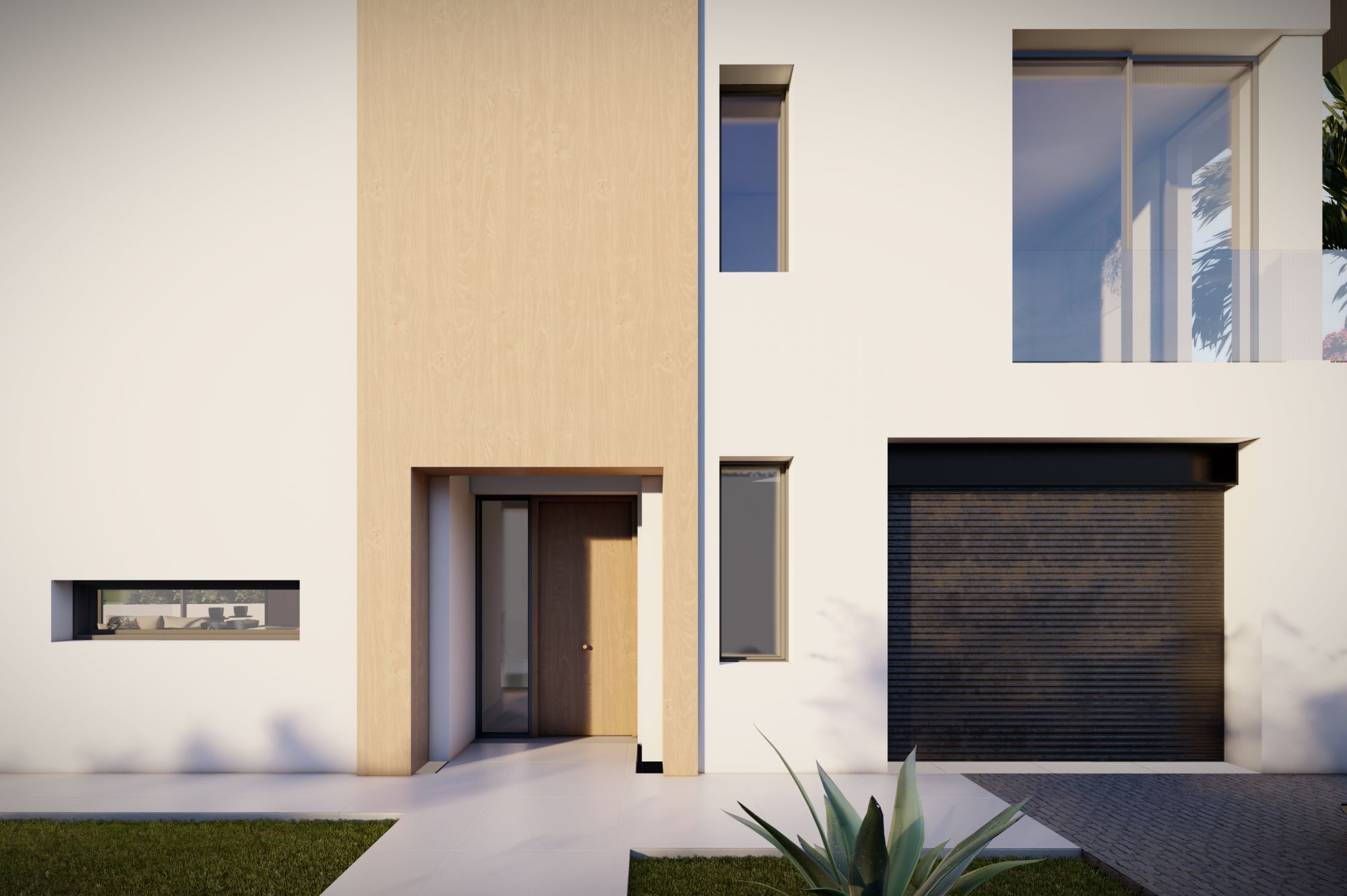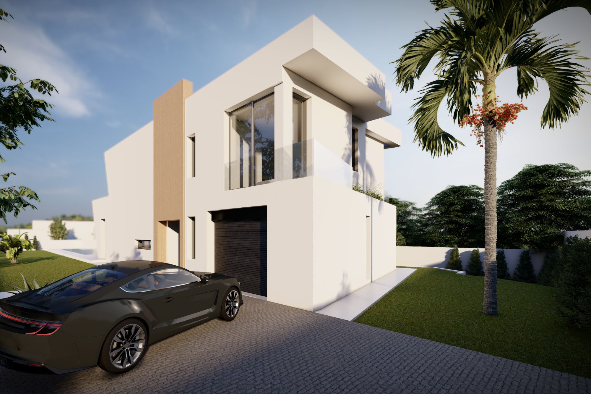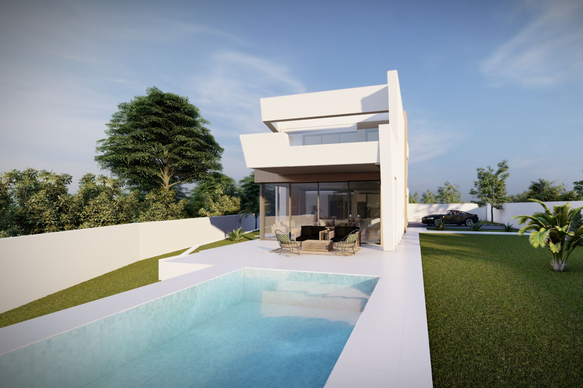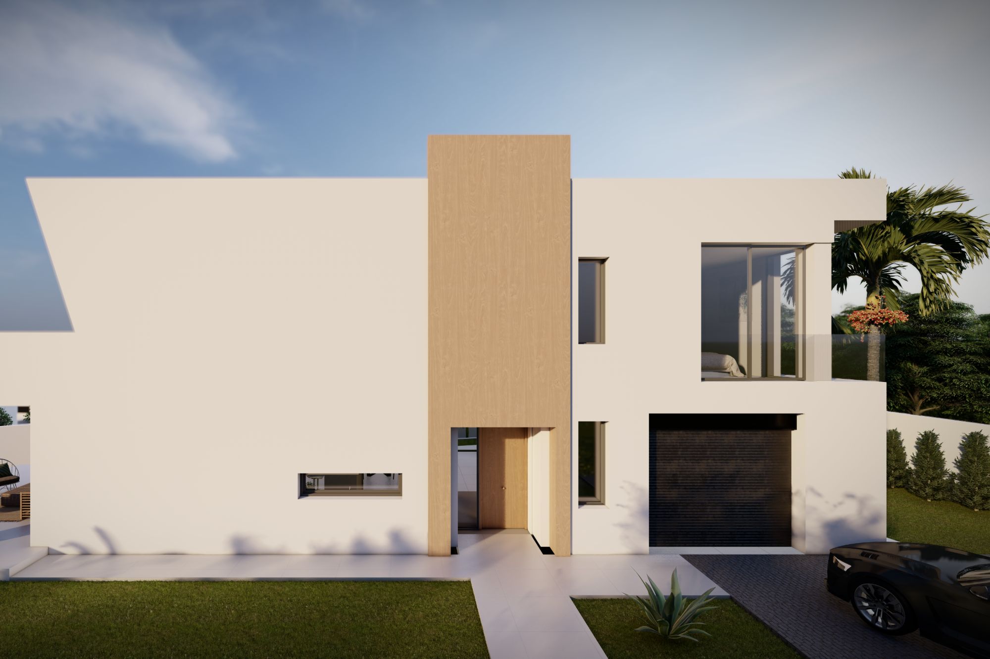 In het hart van het huis trekt een aangelegde patio, omgeven door een glazen façade, zonlicht naar elke hoek, waardoor een heldere en luchtige sfeer wordt gecreëerd op beide niveaus. De opvallende trap introduceert een dramatische dubbele hoogte ruimte, wat het open en uitnodigende gevoel van de woning versterkt.