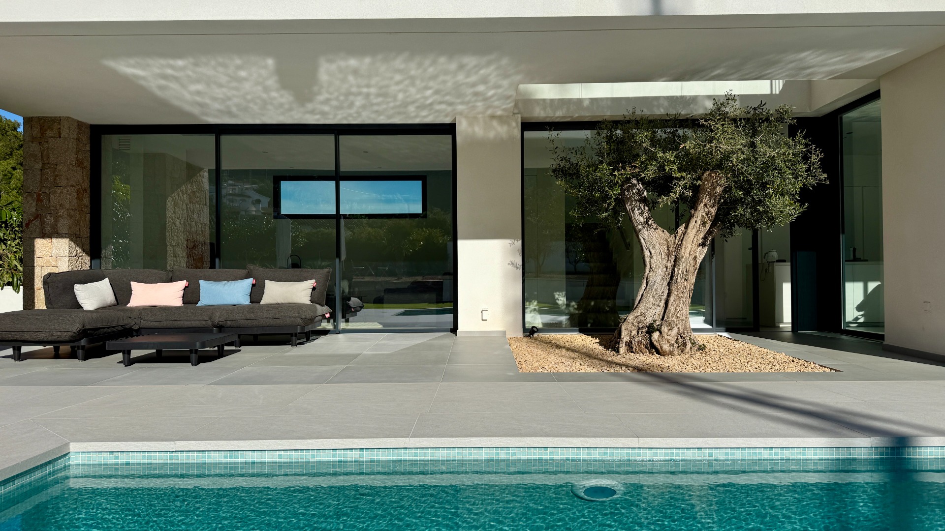 Binnen is de villa licht, modern en stijlvol afgewerkt. De open woon- en eetruimte sluit naadloos aan op de terrassen via grote raampartijen en creëert een sterke verbinding tussen binnen en buiten. De volledig uitgeruste keuken is praktisch ingericht voor dagelijks gebruik.