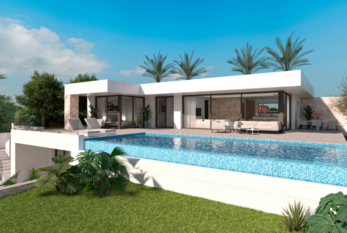 Moderne nieuwbouwvilla met zeezicht te koop in Denia. De villa wordt gebouwd op een perceel van bijna 1200m2. De woon-eetkamer, badend in natuurlijk licht dat binnenkomt via de grote ramen, heeft een bevoorrechte ligging in een zeer zonnig gedeelte van het pand en zorgt voor een warme en gastvrije sfeer. Verder zijn er 4 slaapkamers die allen een en-suite badkamer hebben.