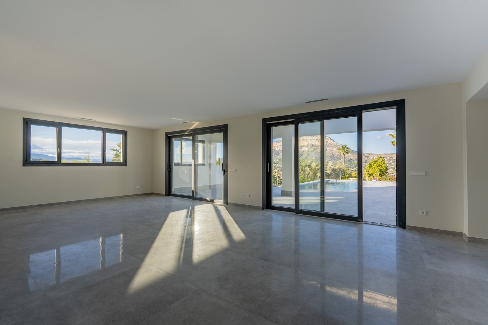 Deze exclusieve nieuwbouwvilla, gelegen in de mooie urbanisatie Piver, biedt een adembenemend uitzicht op de imposante Montgó en het bergachtige binnenland. De villa ligt op een ruim perceel van 1.147,94 m2 en is volledig gelijkvloers ontworpen voor optimaal comfort en toegankelijkheid. Bij binnenkomst leidt een stijlvolle hal met gastentoilet naar de ruime woon-eetkamer, waar grote ramen zorgen voor overvloedig natuurlijk licht en een prachtig uitzicht op de Montgó. Aansluitend bevindt zich een moderne, volledig uitgeruste keuken met een praktische wasruimte die direct toegang biedt tot de buitenzijde. Via schuiframen in de woonkamer betreedt u het uitnodigende terras met zwembad, ideaal om te genieten van het uitzicht en het mediterrane klimaat. In het slaapgedeelte bevinden zich drie slaapkamers, waaronder een elegante hoofdslaapkamer met en suite badkamer en directe toegang tot het terras, terwijl de twee andere slaapkamers een tweede badkamer delen. De buitenruimte is een oase van rust met een overdekt terras, een pergola, een ruim zonneterras en een onderhoudsvriendelijke mediterrane tuin. Met twee parkeerplaatsen op eigen terrein, en een locatie op slechts 2 km van het historische centrum en 3 km van de kust, combineert deze villa luxe, privacy en een uitstekende bereikbaarheid.