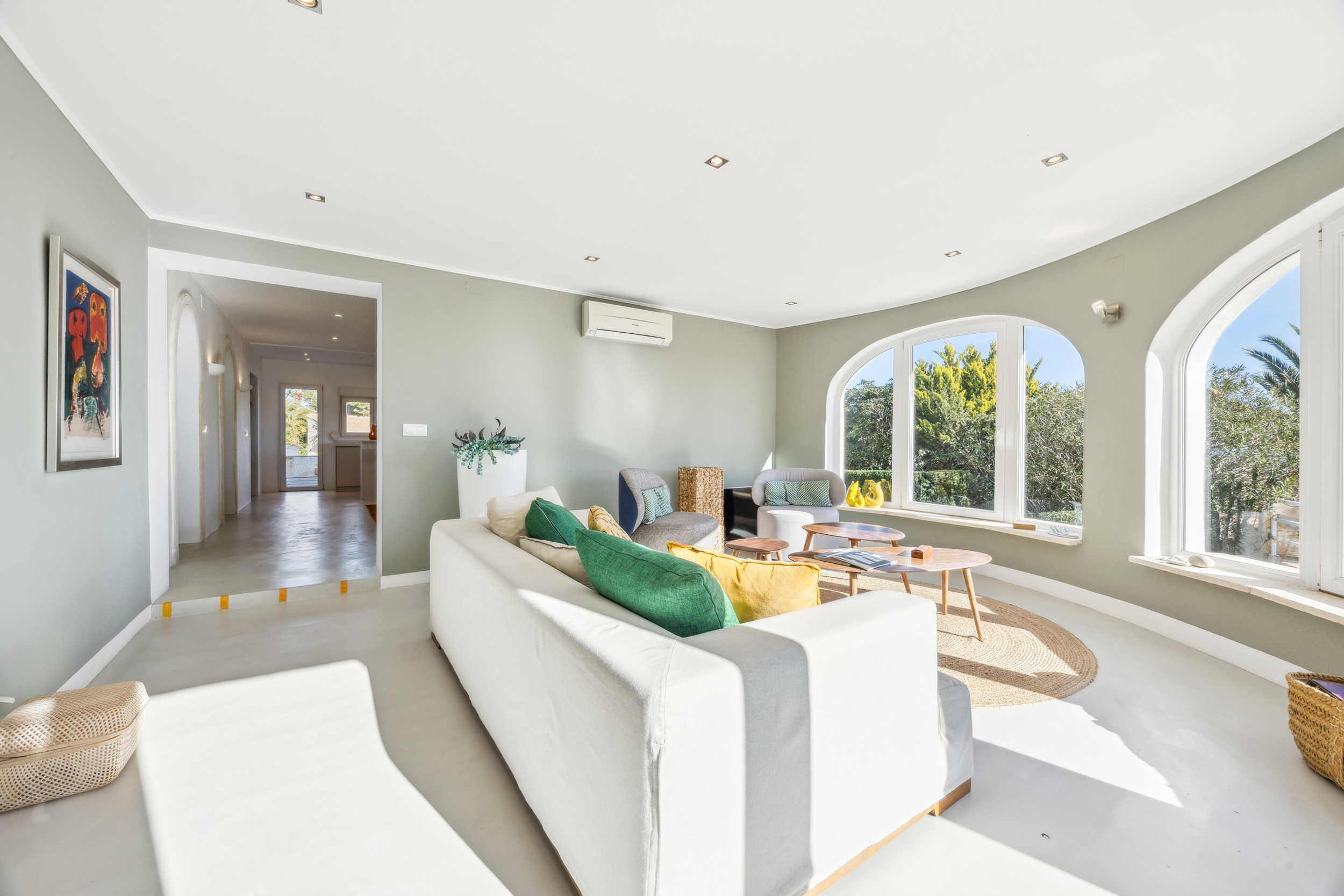 De woonruimte is verdeeld over de begane grond en twee andere, lichtovergoten verdiepingen. De villa biedt een woonkamer, een woon-slaapkamer, een ruime eetkamer met open keuken, drie slaapkamers, drie doucheruimtes en een wasruimte/bergruimte. De buitenruimte is onderhoudsvriendelijk aangelegd en biedt vanaf bijna elk punt een droomachtig zeezicht. Het ruime hoofddakterras nodigt uit voor diner met vrienden op zwoele zomeravonden. Een nieuw aangelegde verwarmbare zwembad, ingebed in een andere groot opgezette privéterras, biedt eveneens uitzicht op de zee. Ook op de eerste verdieping vinden we een groot terras, deels voorzien van een pergola, met adembenemend panoramisch zeezicht. Vanuit de hoofdslaapkamer met en-suite badkamer kijkt men recht op de zee en kan men genieten van de mooiste zonsopgangen, met Ibiza aan de horizon. Aangrenzend bevindt zich een ander terras met zeezicht en een trap naar het solarium. De tuin van de villa draagt bij aan de schoonheid en creëert een rustige en privé sfeer.