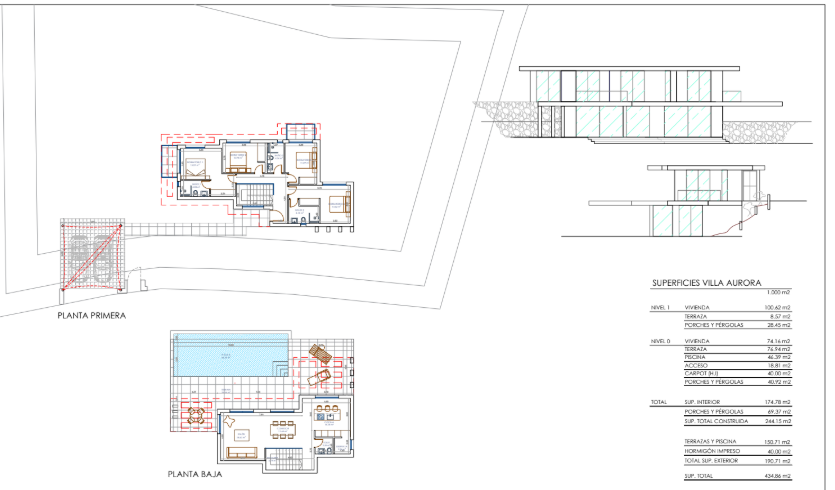 Gelegen op een perceel van 1.000 vierkante meter, beschikt de woning over 434 vierkante meter bebouwde oppervlakte en 174 vierkante meter bruikbare ruimte, verdeeld over twee verdiepingen met een noordwestelijke oriëntatie. De villa heeft vier ruime slaapkamers en vijf badkamers, evenals een open woonkamer en eetkamer die zijn ontworpen voor comfort en stijl.