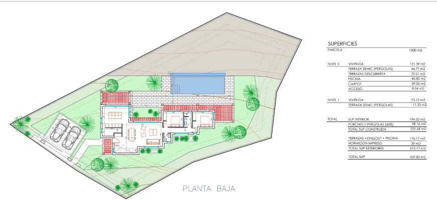 De villa staat op een privéperceel van 1.000 vierkante meter, met een bebouwde oppervlakte van 178 vierkante meter en 425 vierkante meter extra tuin en terrasruimte. De prachtig aangelegde tuin beschikt over een automatisch irrigatiesysteem voor eenvoudig onderhoud. Een privézwembad verbetert de buitenervaring, terwijl de woning ook indrukwekkende zee en bergzicht biedt.